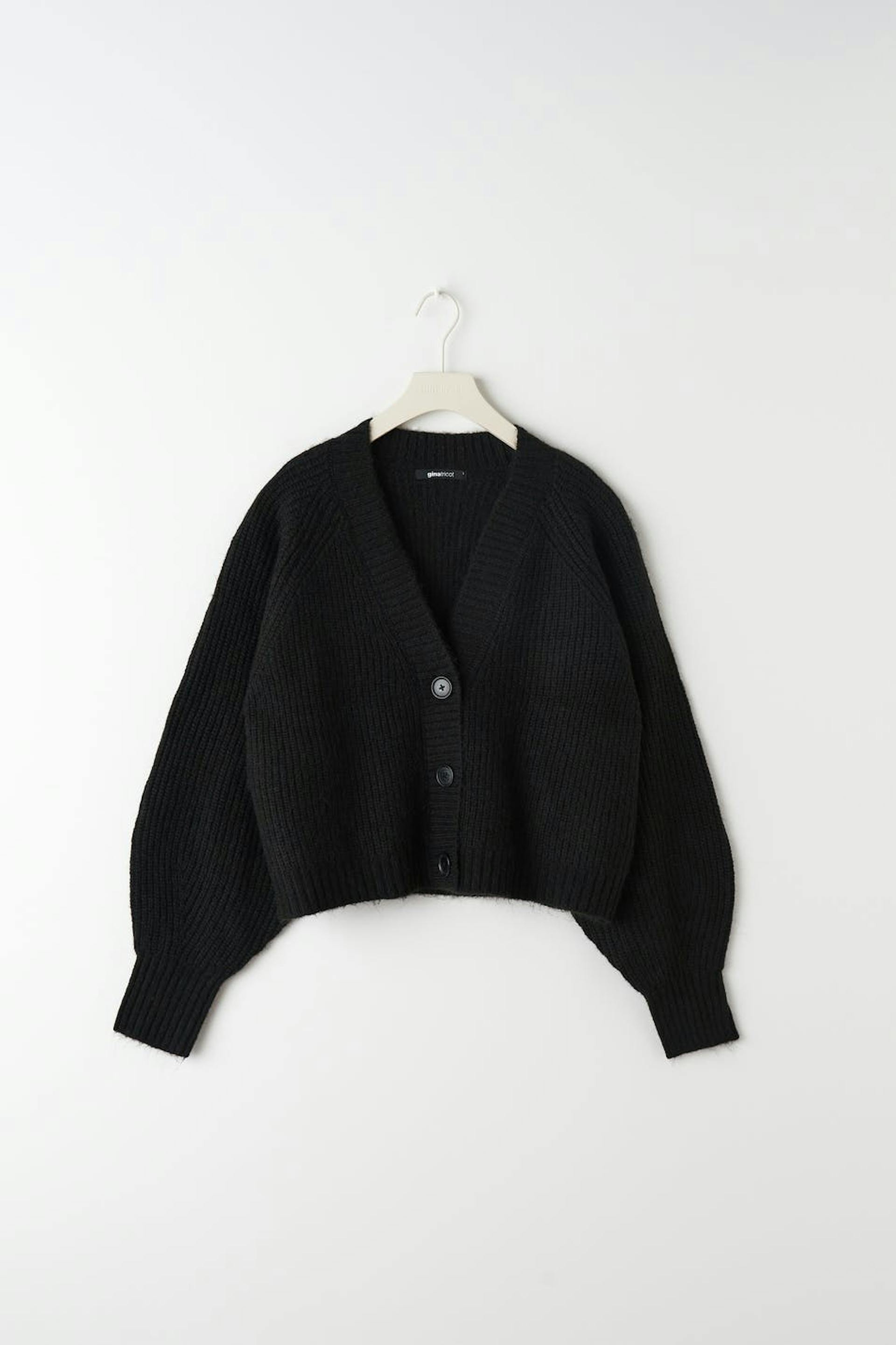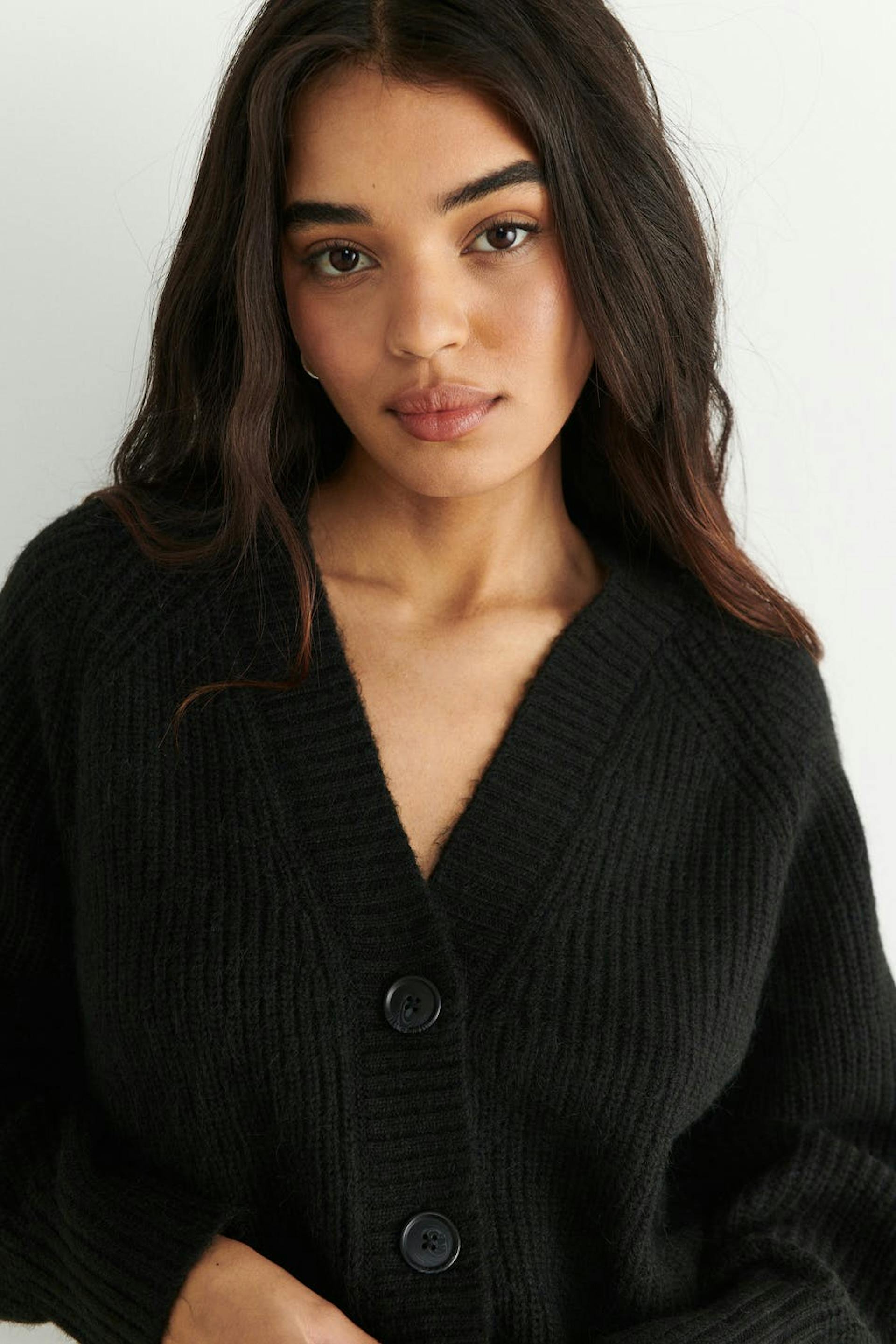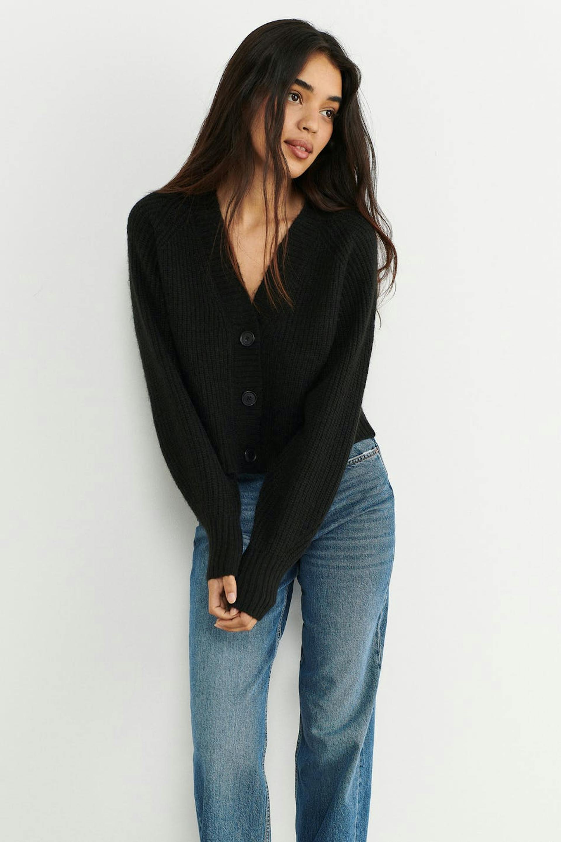 Gestrickter Cardigan mit boxy Passform. Der Cardigan ist schwarz und hat Knopfleiste vorne. Er hat V-Ausschnitt, abgeschnittene Länge und gerippten Saumabschluss.