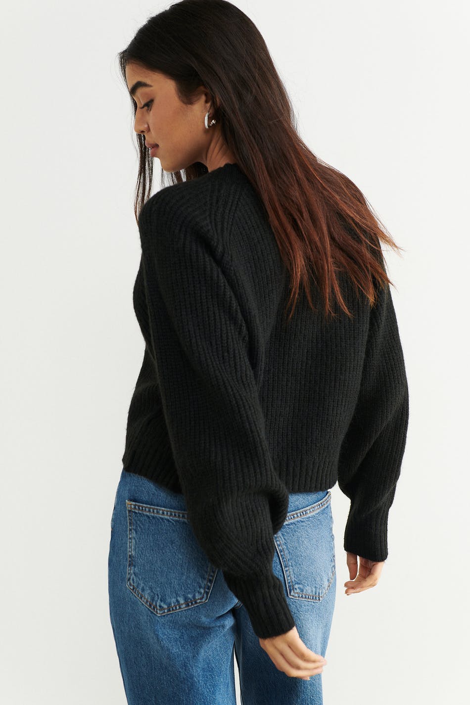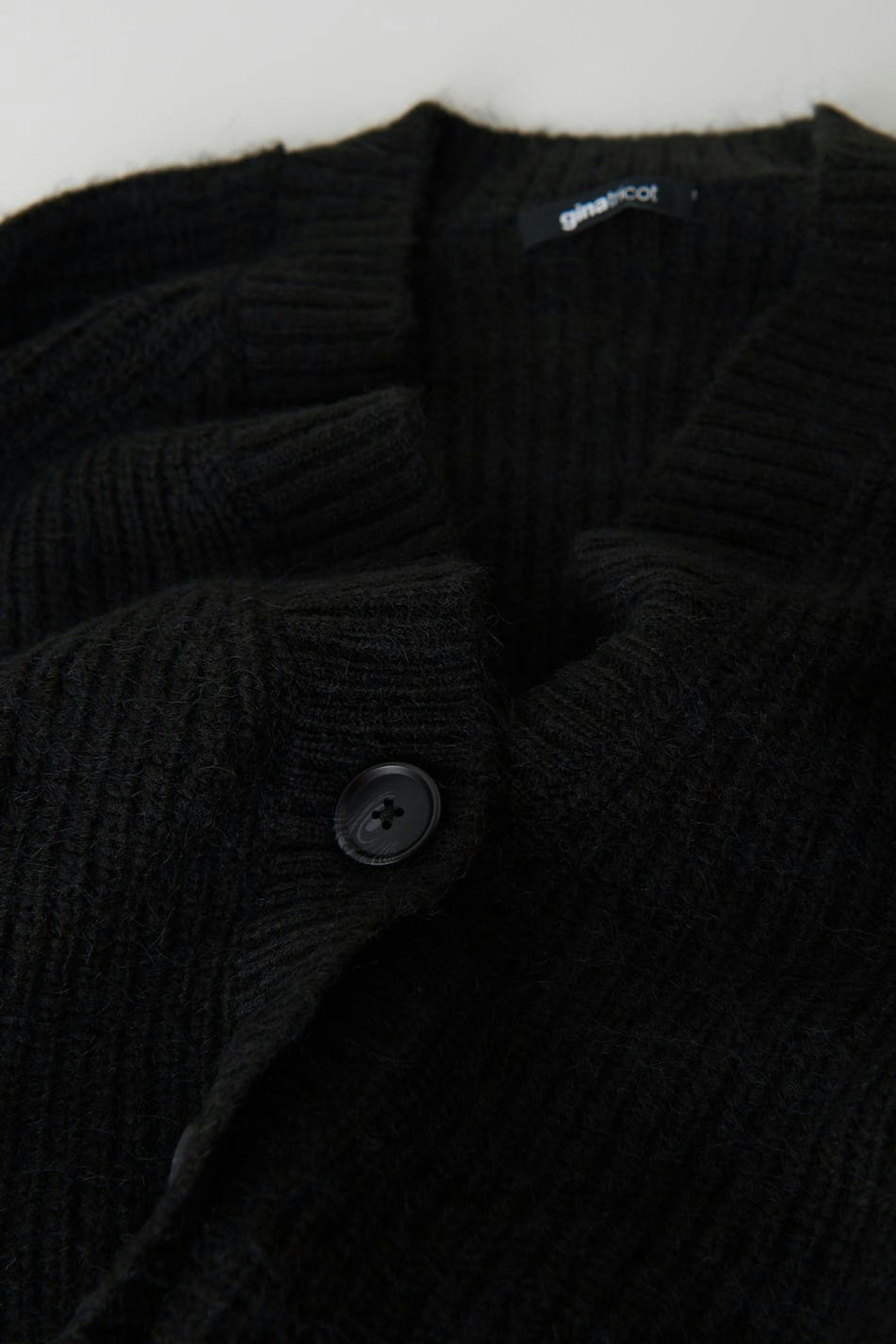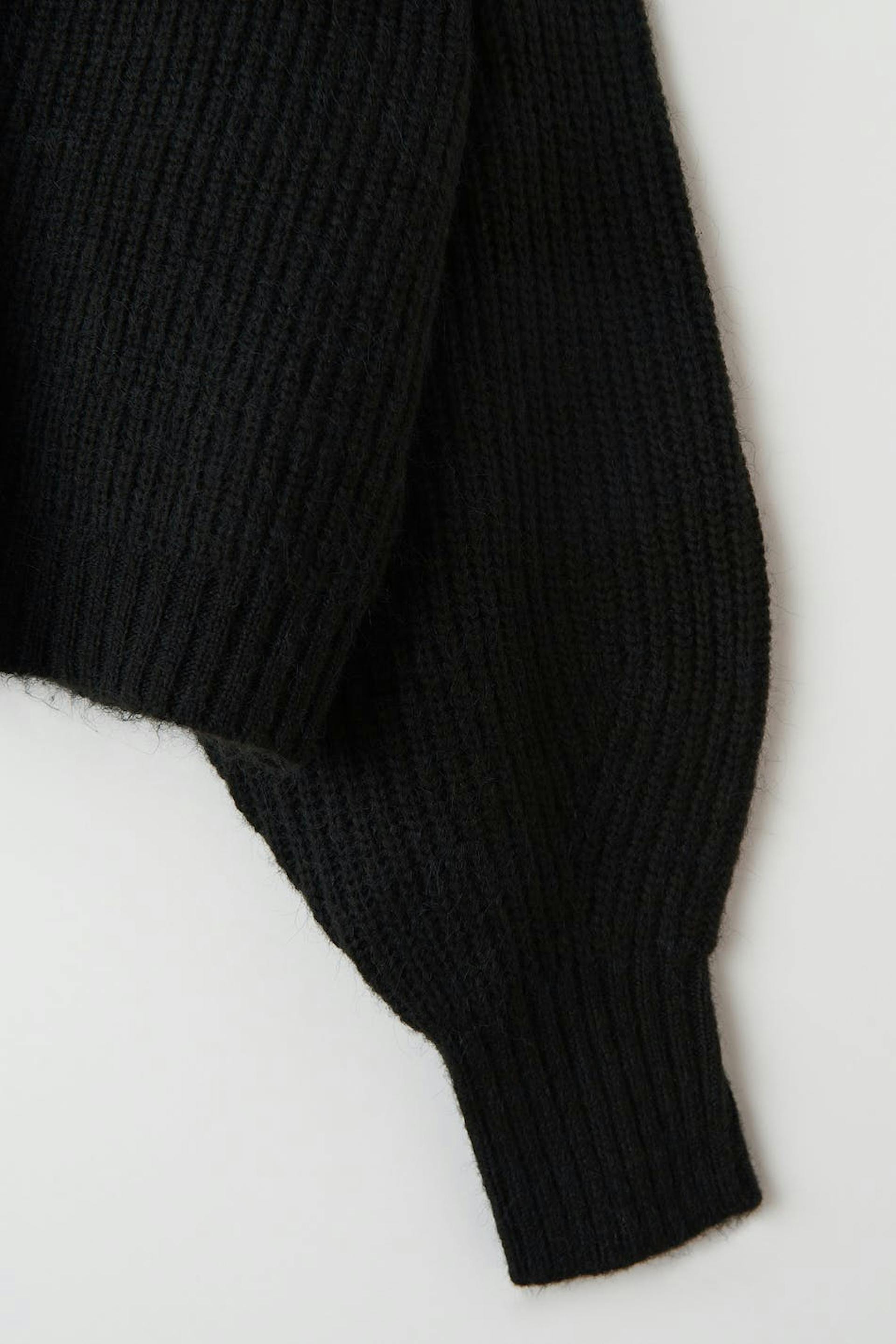 Gestrickter Cardigan mit boxy Passform. Der Cardigan ist schwarz und hat Knopfleiste vorne. Er hat V-Ausschnitt, abgeschnittene Länge und gerippten Saumabschluss.