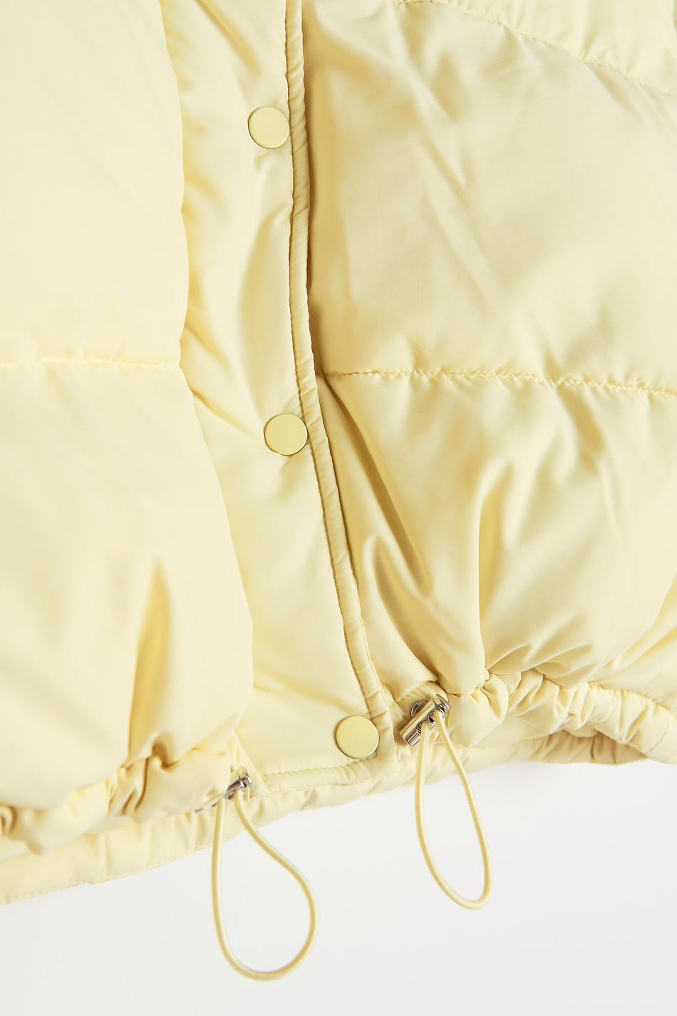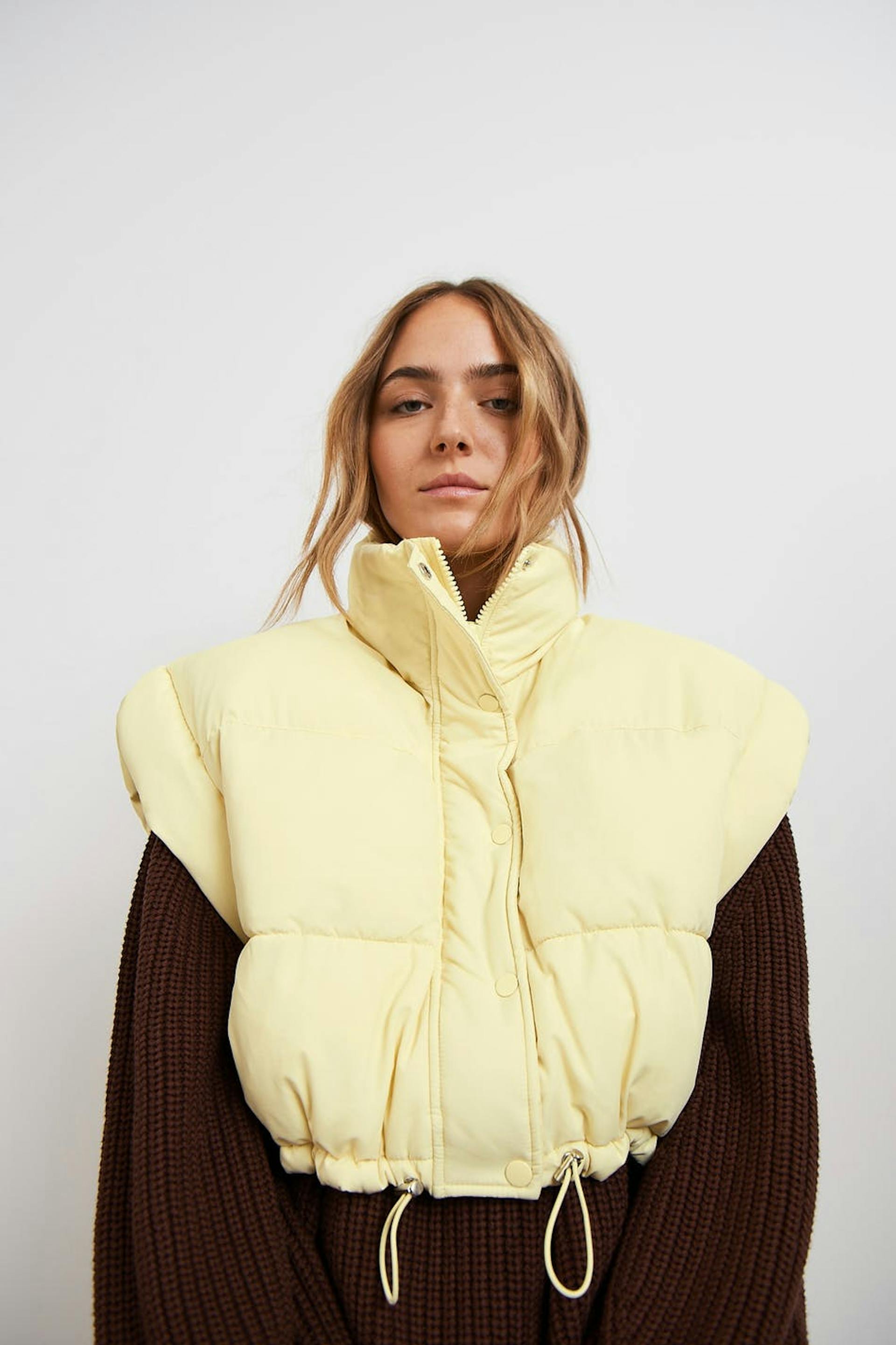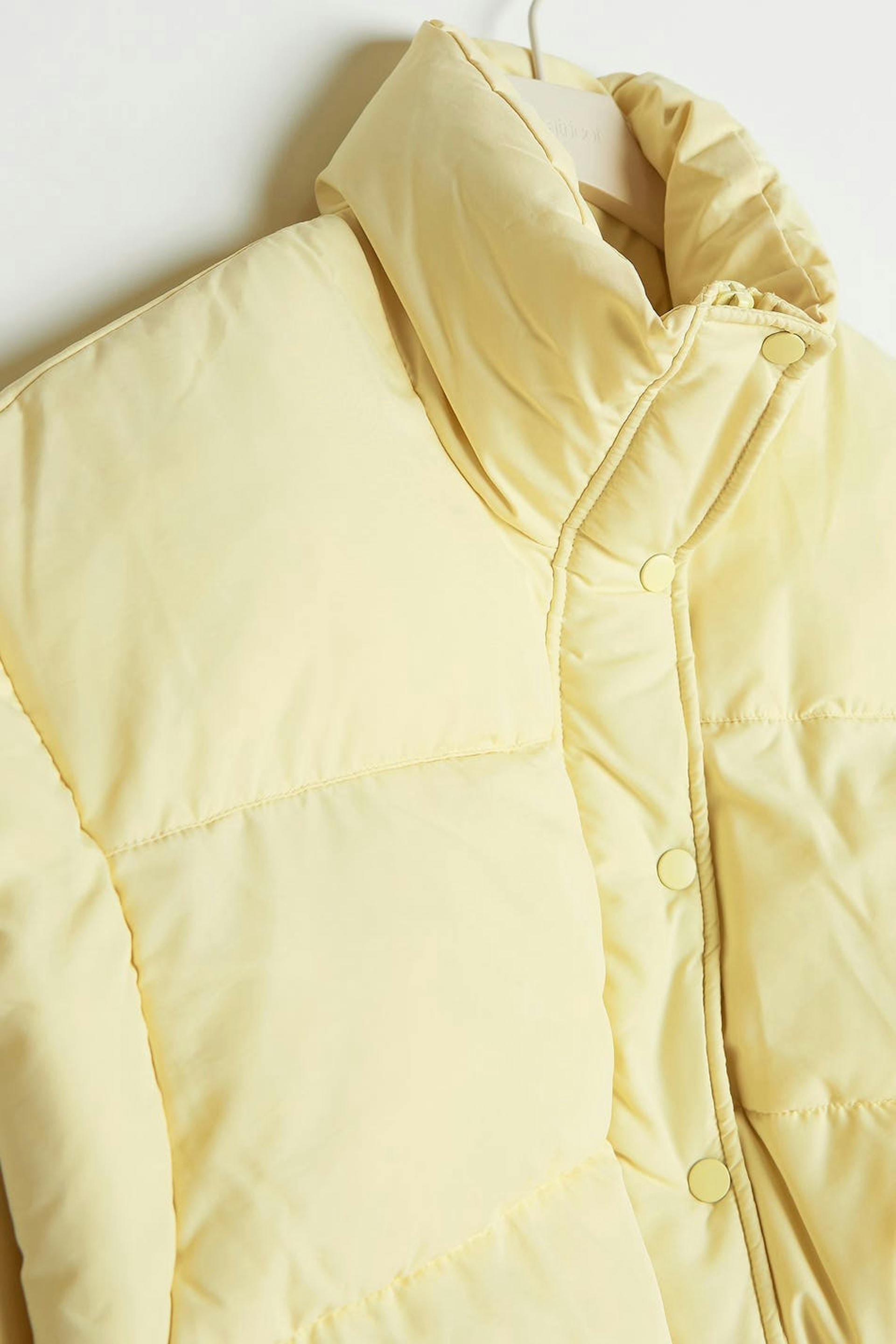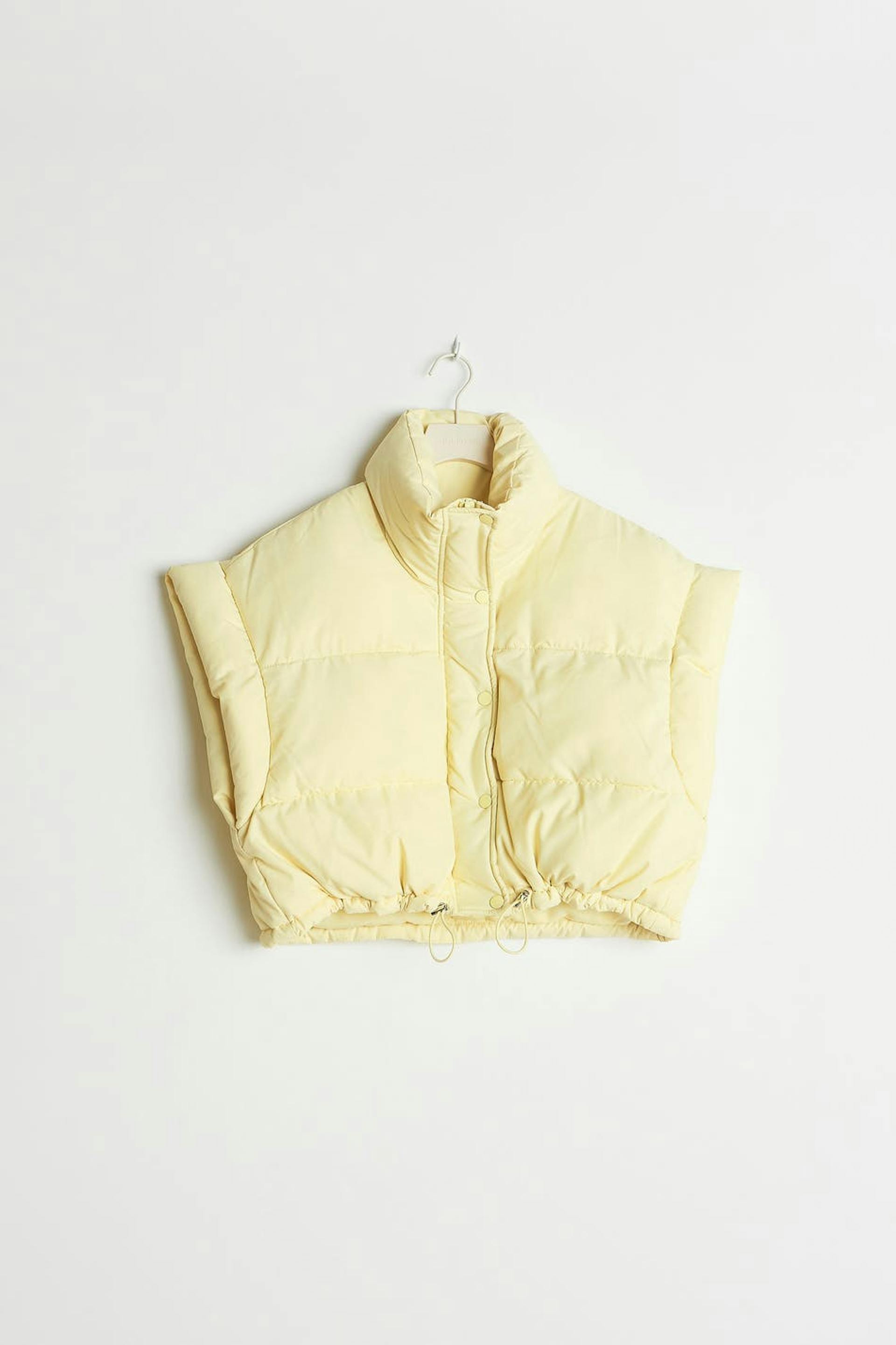 Weste mit einer abgeschnittenen Länge. Die Weste ist gelb und hat eine strukturierte, gewebte Qualität. Sie hat einen Kragen, schrägere Taschen auf den Seiten, einen Knopfverschluss mit einem Reißverschluss unter und einen einstellbaren Kordelzug am unteren Saum.