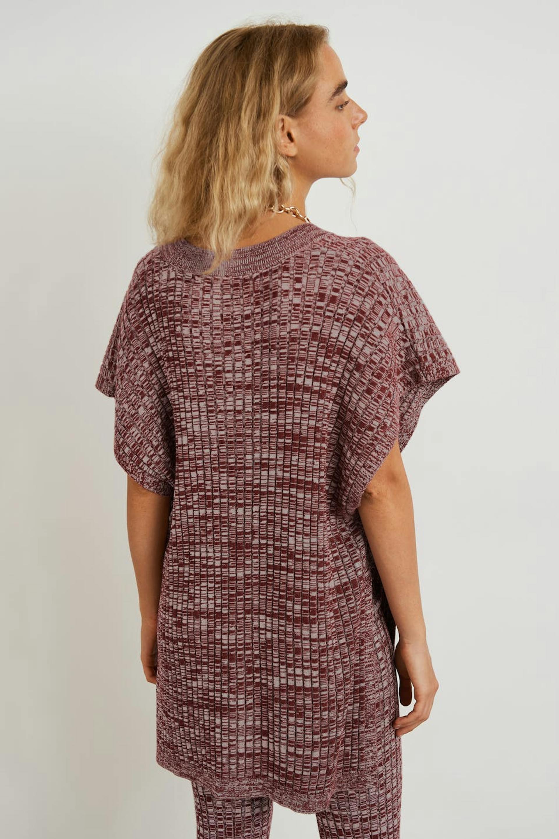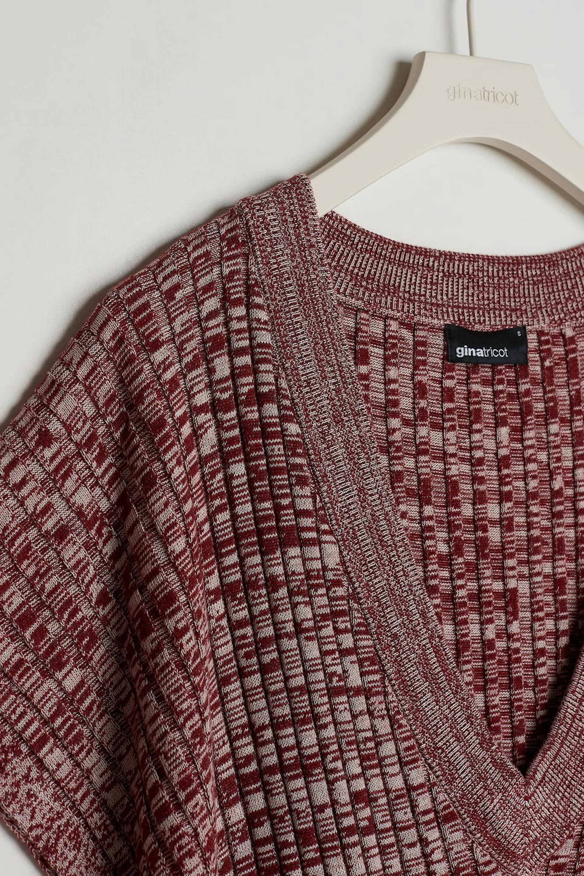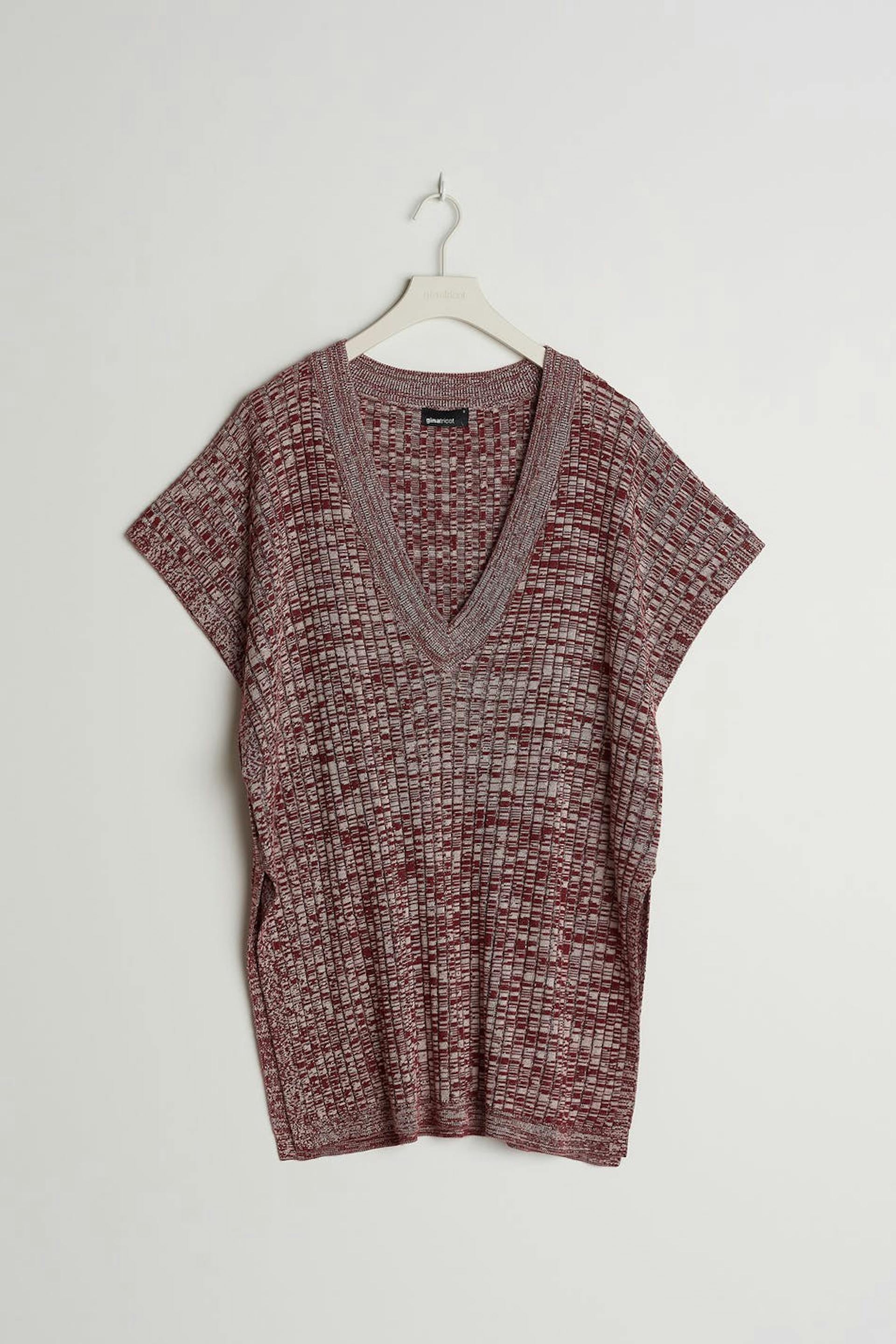 Gestrickte Weste mit einer Oversize-Passform. Die Weste ist rot und hat einen tiefen Ausschnitt. Sie hat einen Schlitz auf den Seiten.