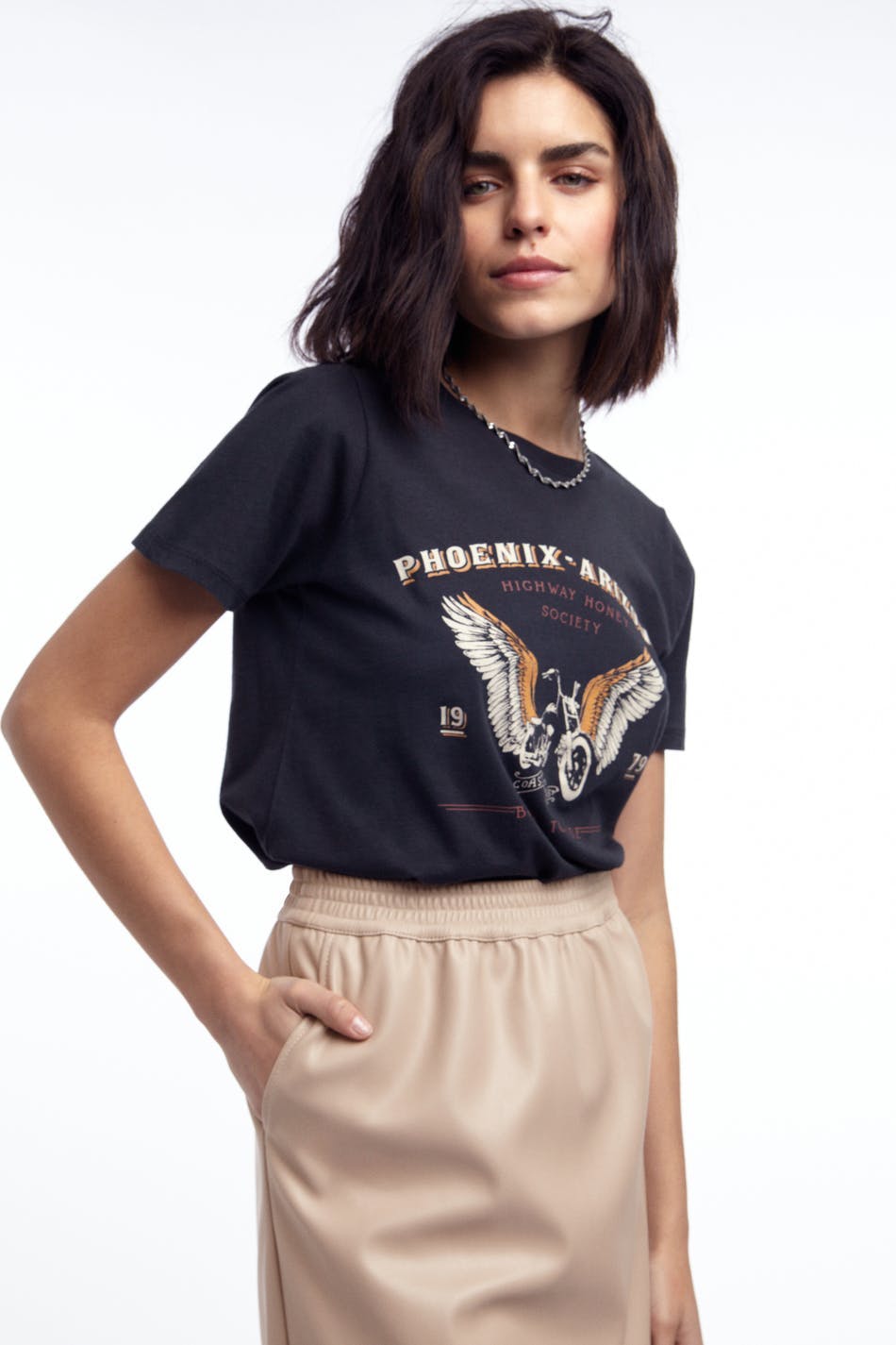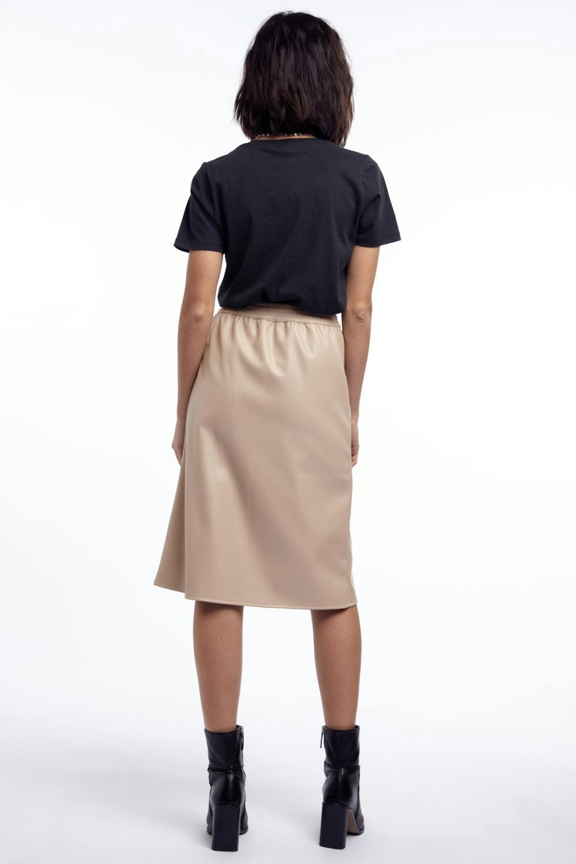 Rock mit einer Knielänge und einem elastischen Bund. Der Rock ist beige und hat Taschen auf den Seiten. Er ist hergestellt aus PU-Leder.