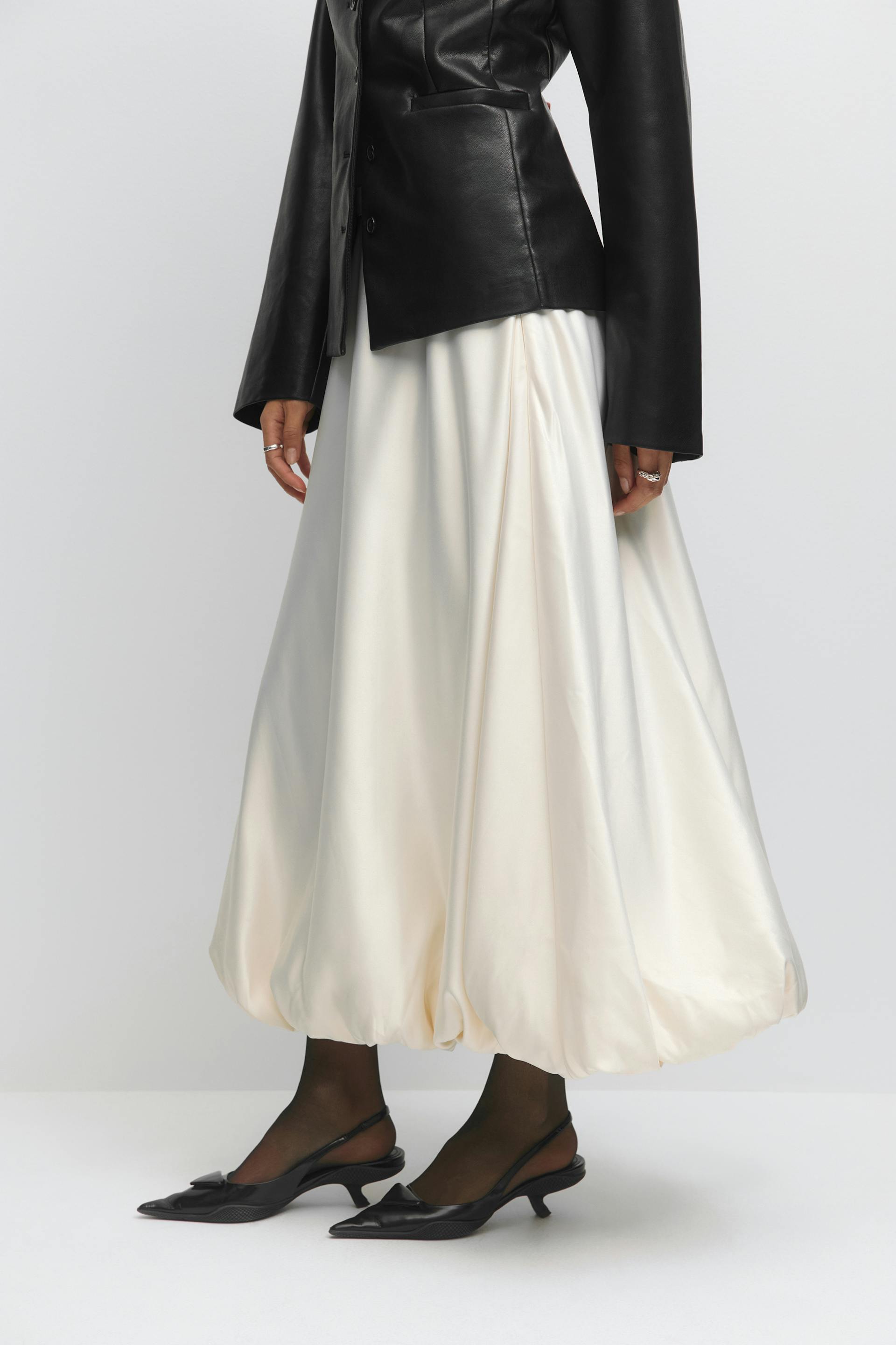 Ballonrock mit Midi-Länge. Der Ballonrock ist cremefarben und hat eine mittlere Taille. Er hat eine normale Passform, Raffnähte, Reißverschluss und einen Haken- und Ösenverschluss.