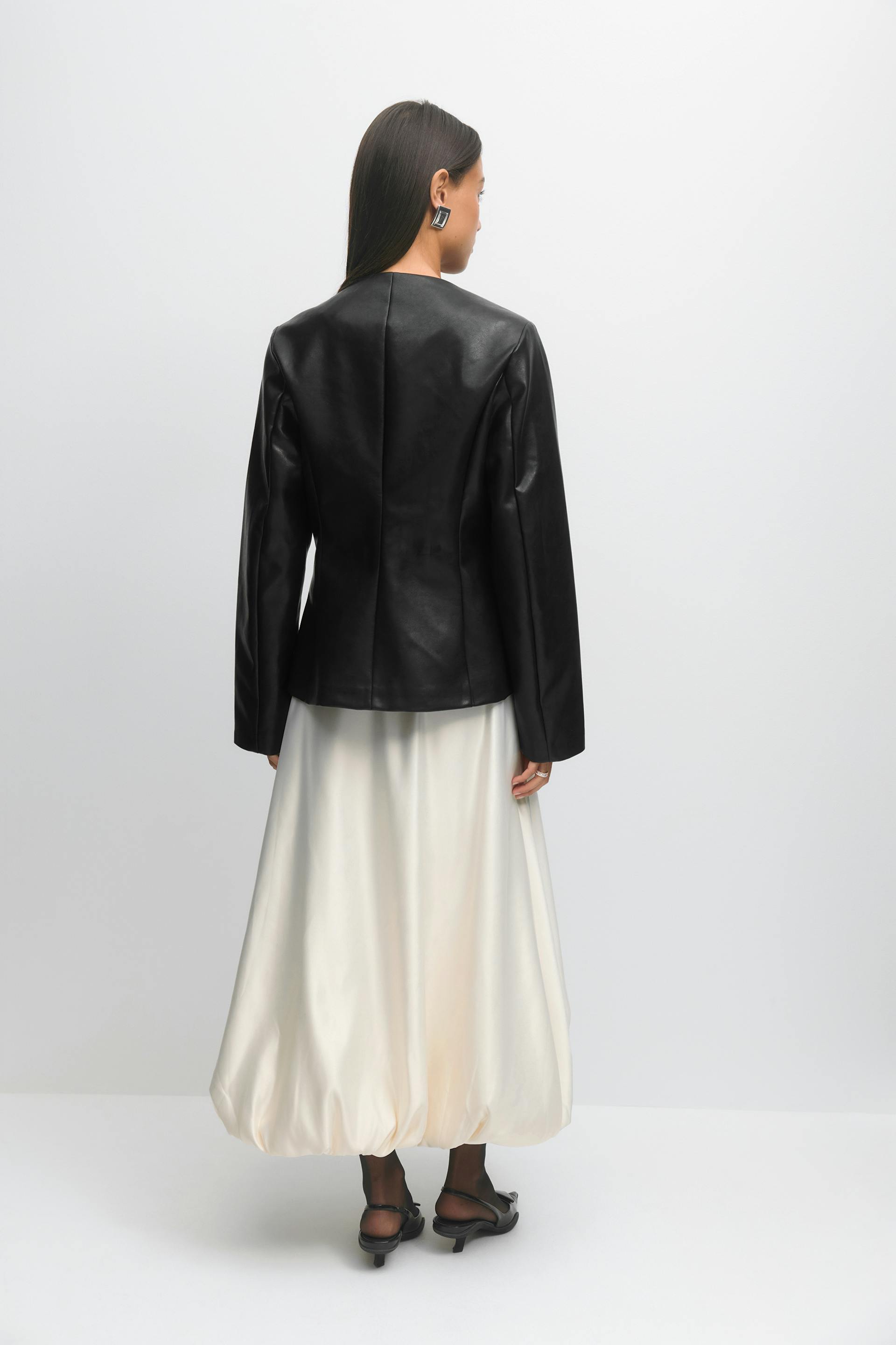Schwarze Lederjacke mit Knopfleiste und langen Ärmeln, elfenbeinfarbener Midirock aus Satin mit Ballonsaum, schwarze durchsichtige Strumpfhose, spitze schwarze Pumps mit niedrigem Absatz und geometrische silberne Ohrringe.