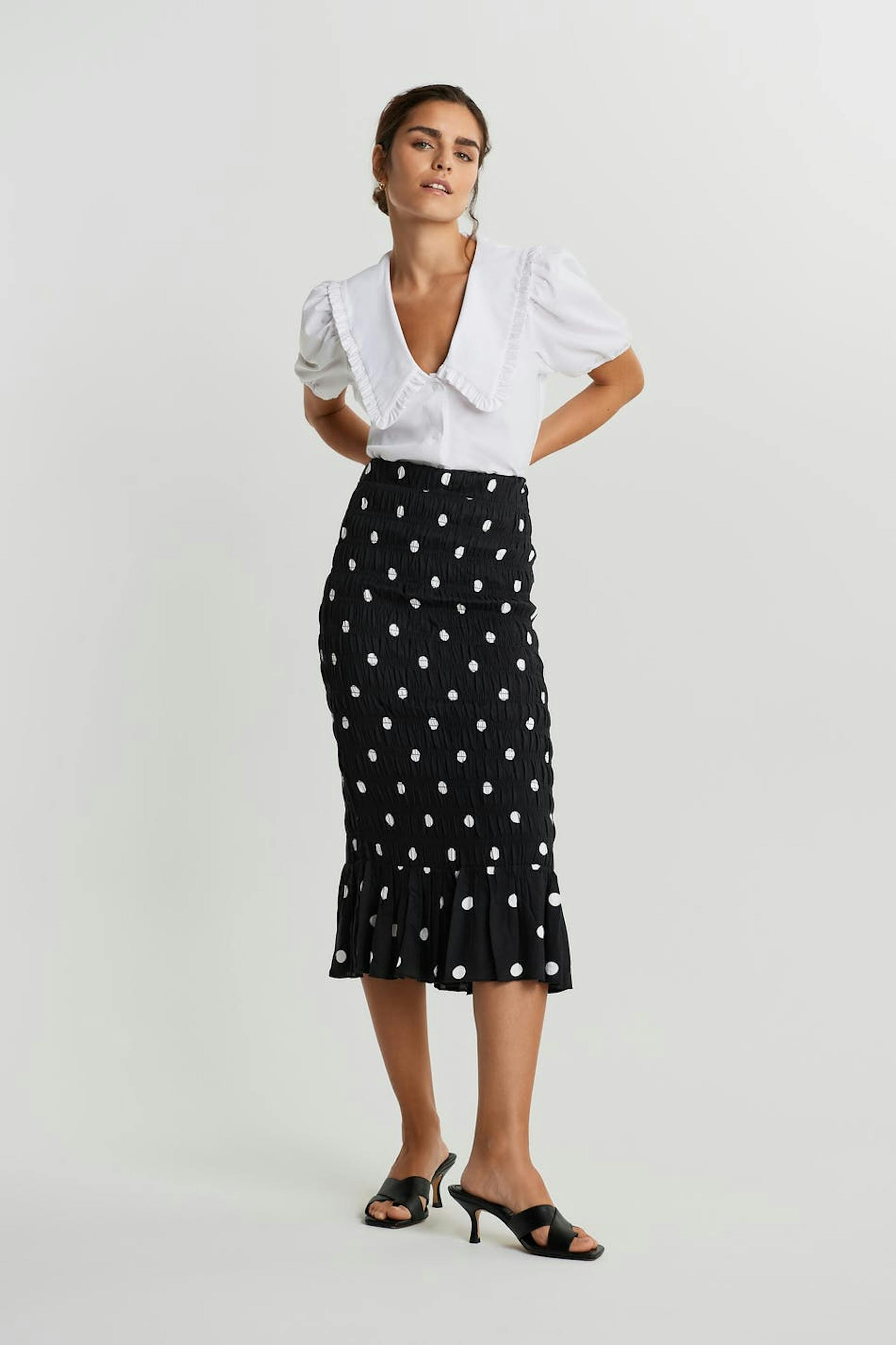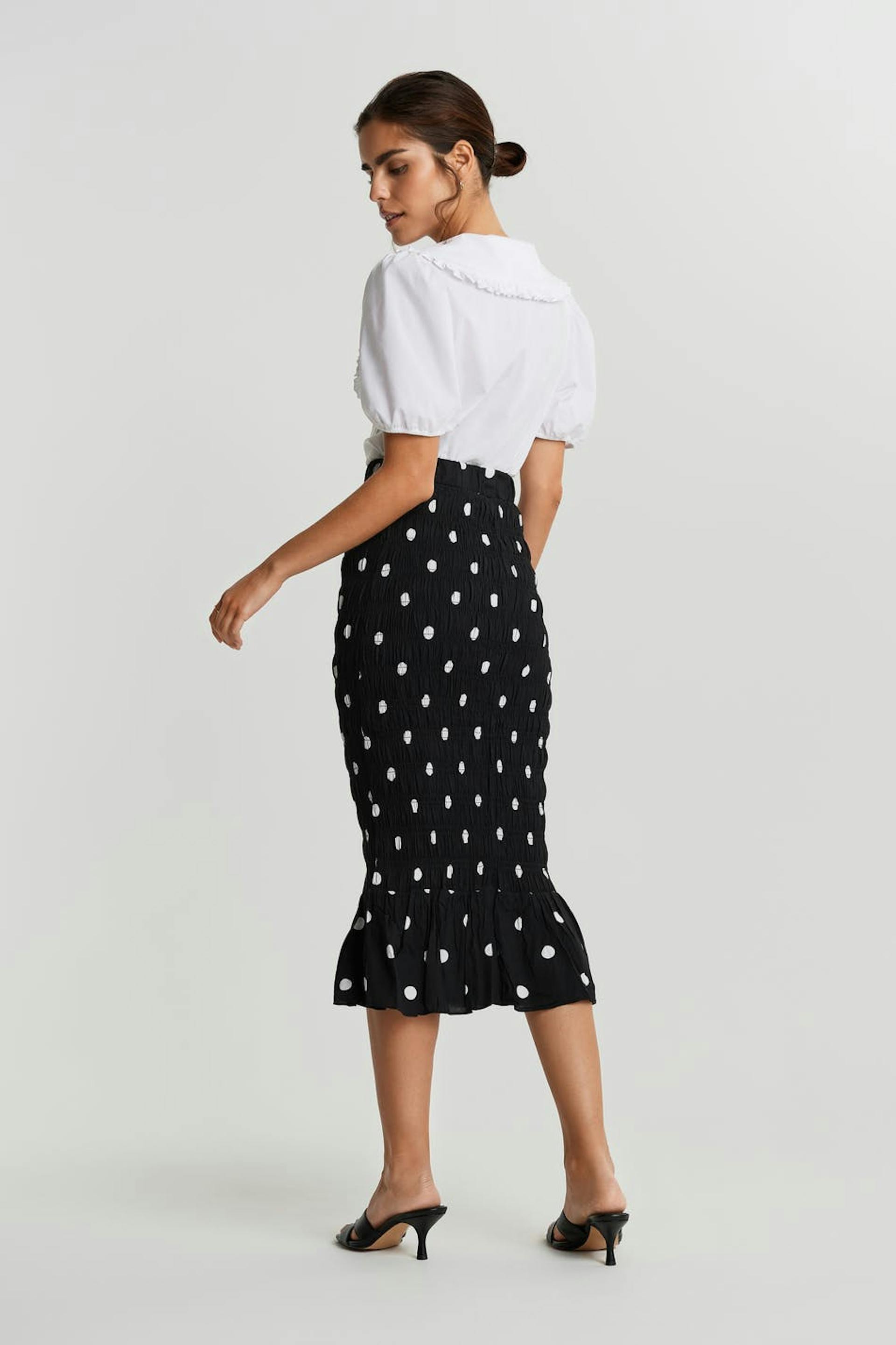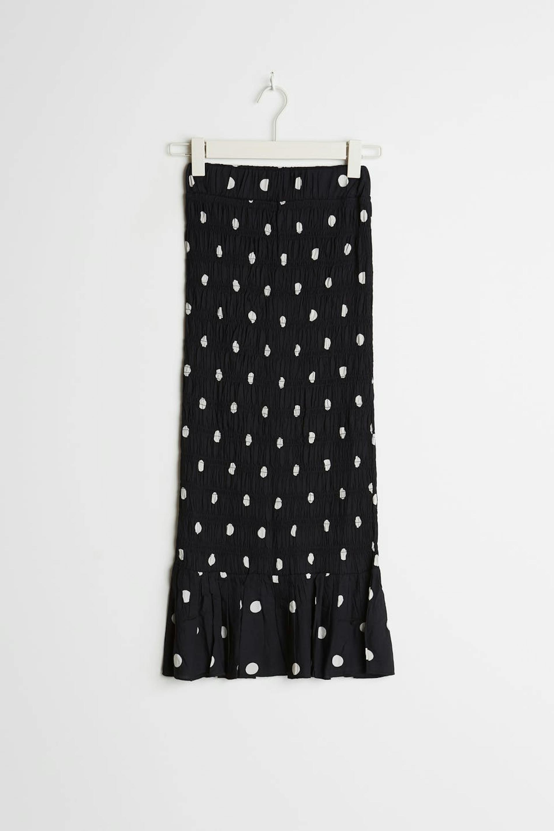 Gepunkteter Rock mit Smoking. Der Rock ist schwarz und hat eine Knielänge.