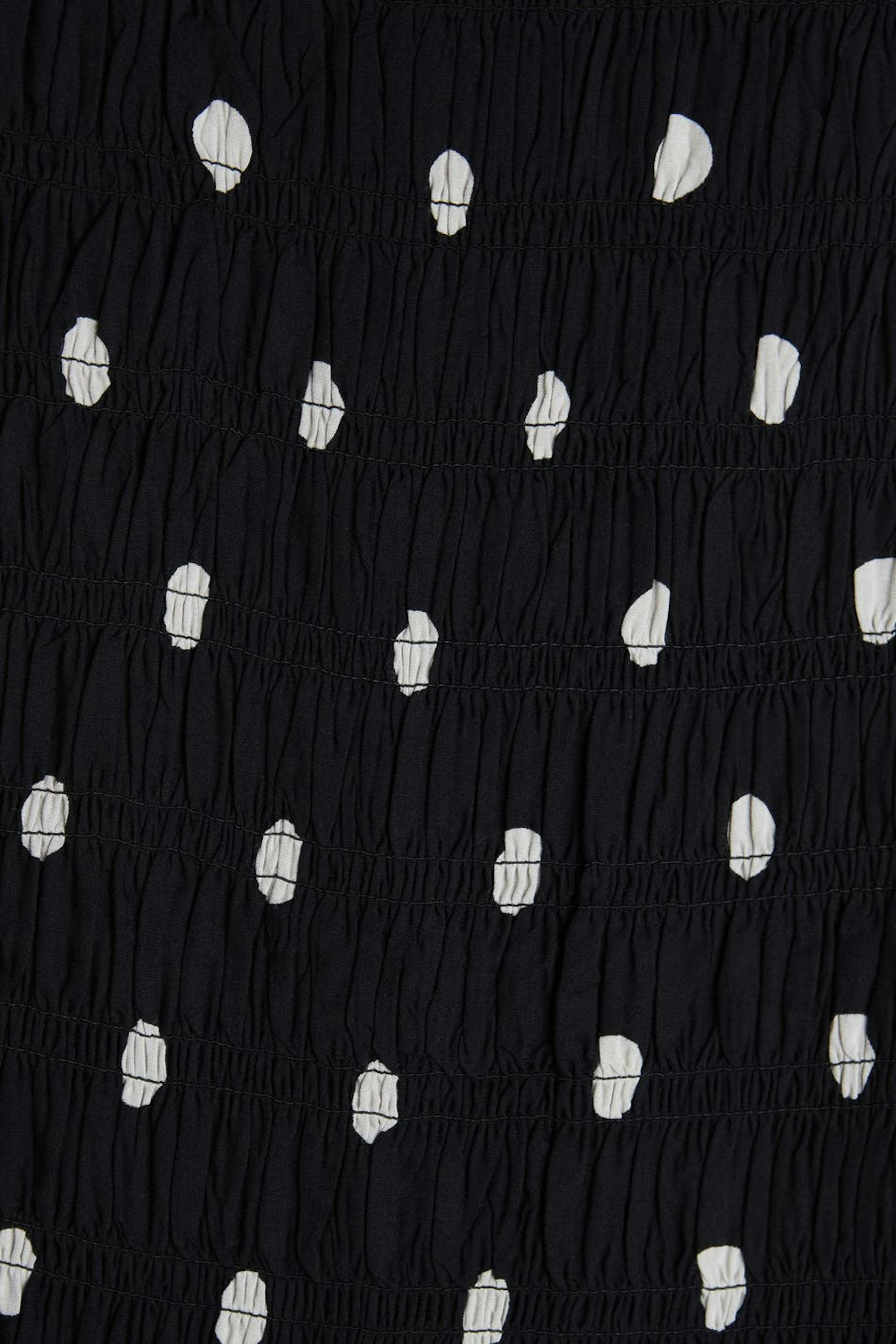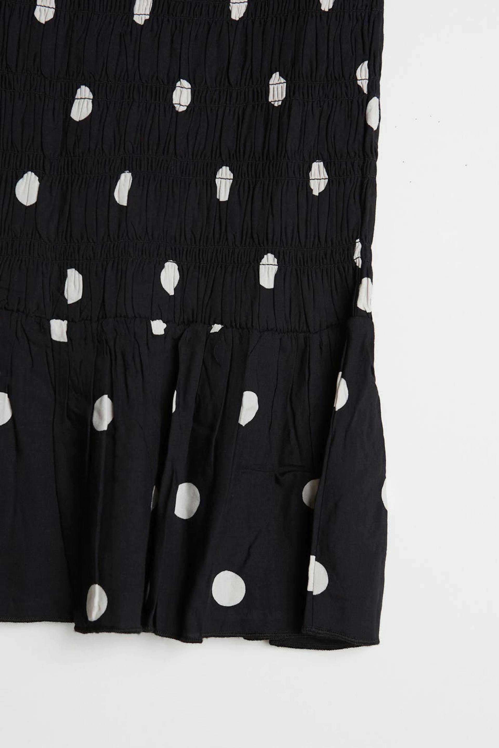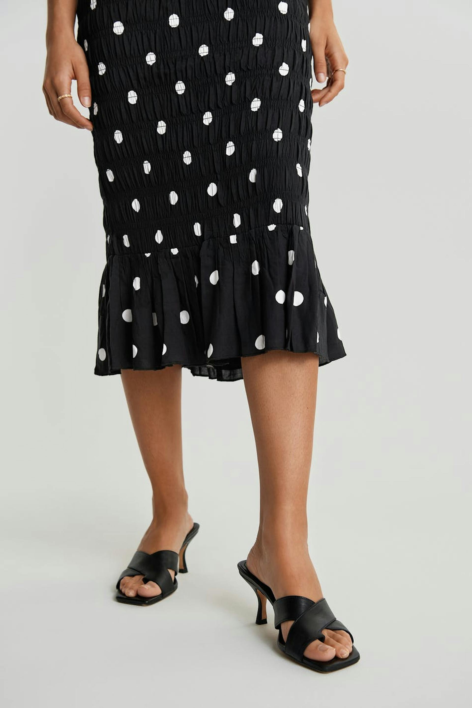Gepunkteter Rock mit Smoking. Der Rock ist schwarz und hat eine Knielänge.