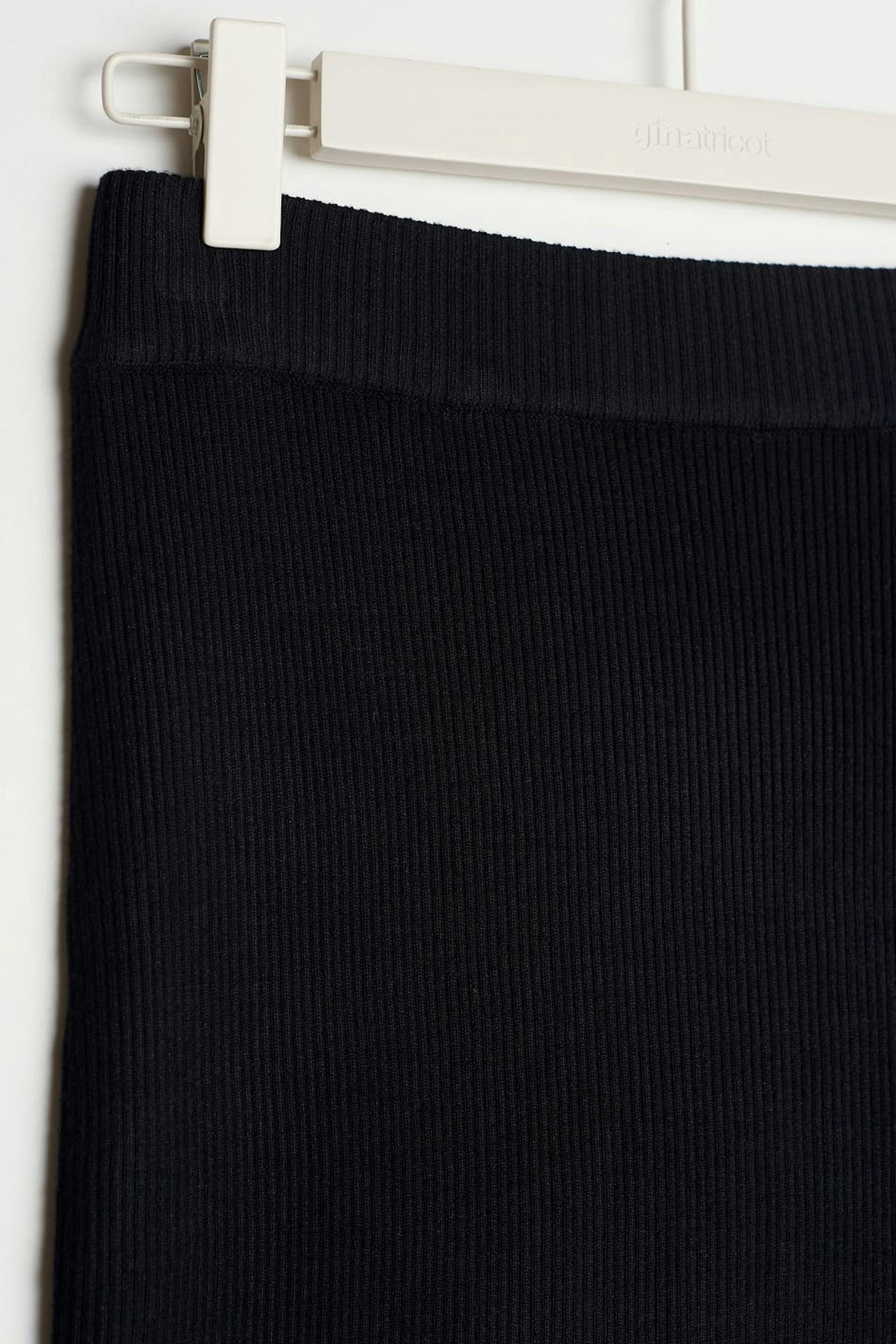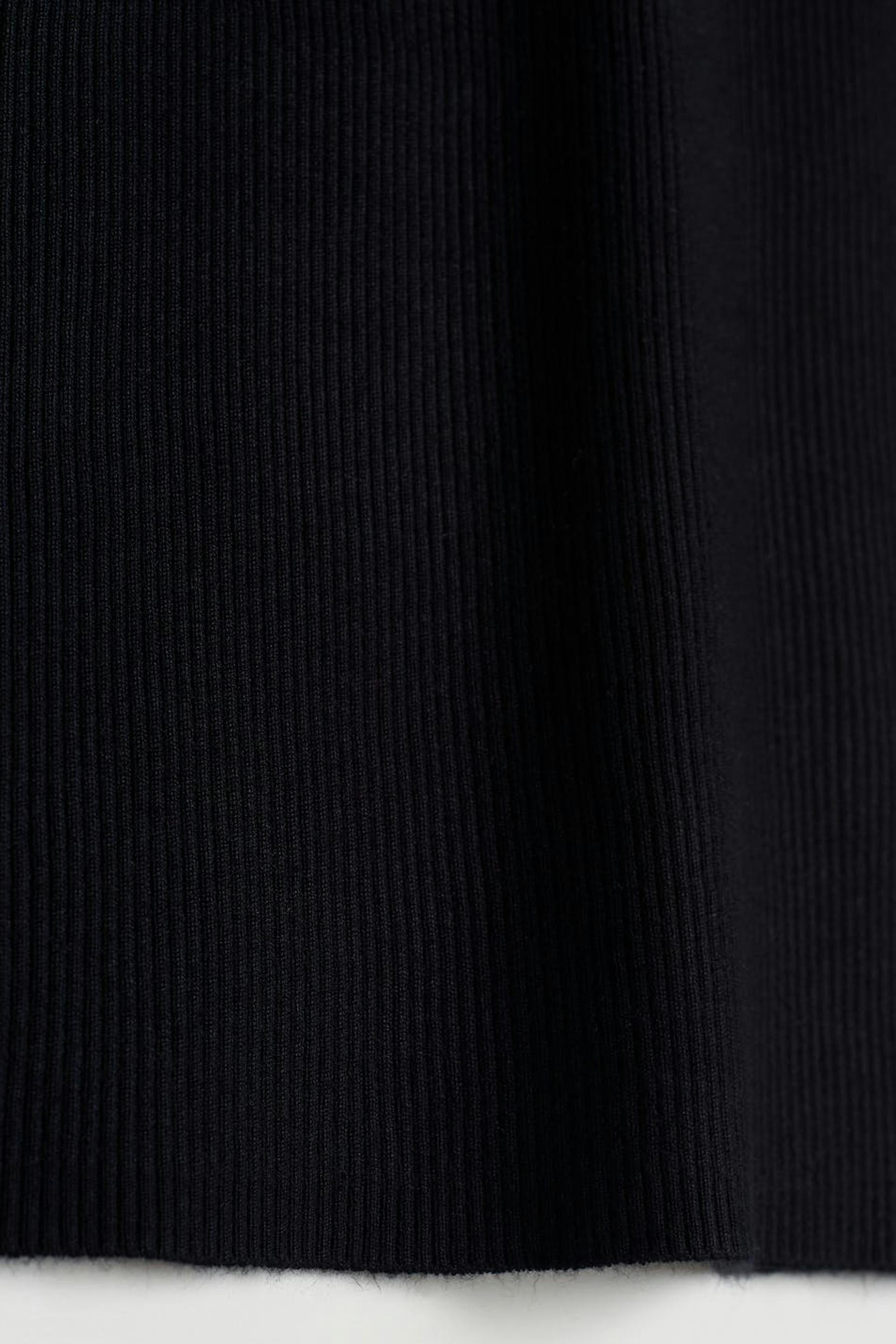 Gestrickter Rock mit einem Schlitz auf den Seiten. Der Rock ist schwarz und hat eine Knielänge und eine taillierte Passform.