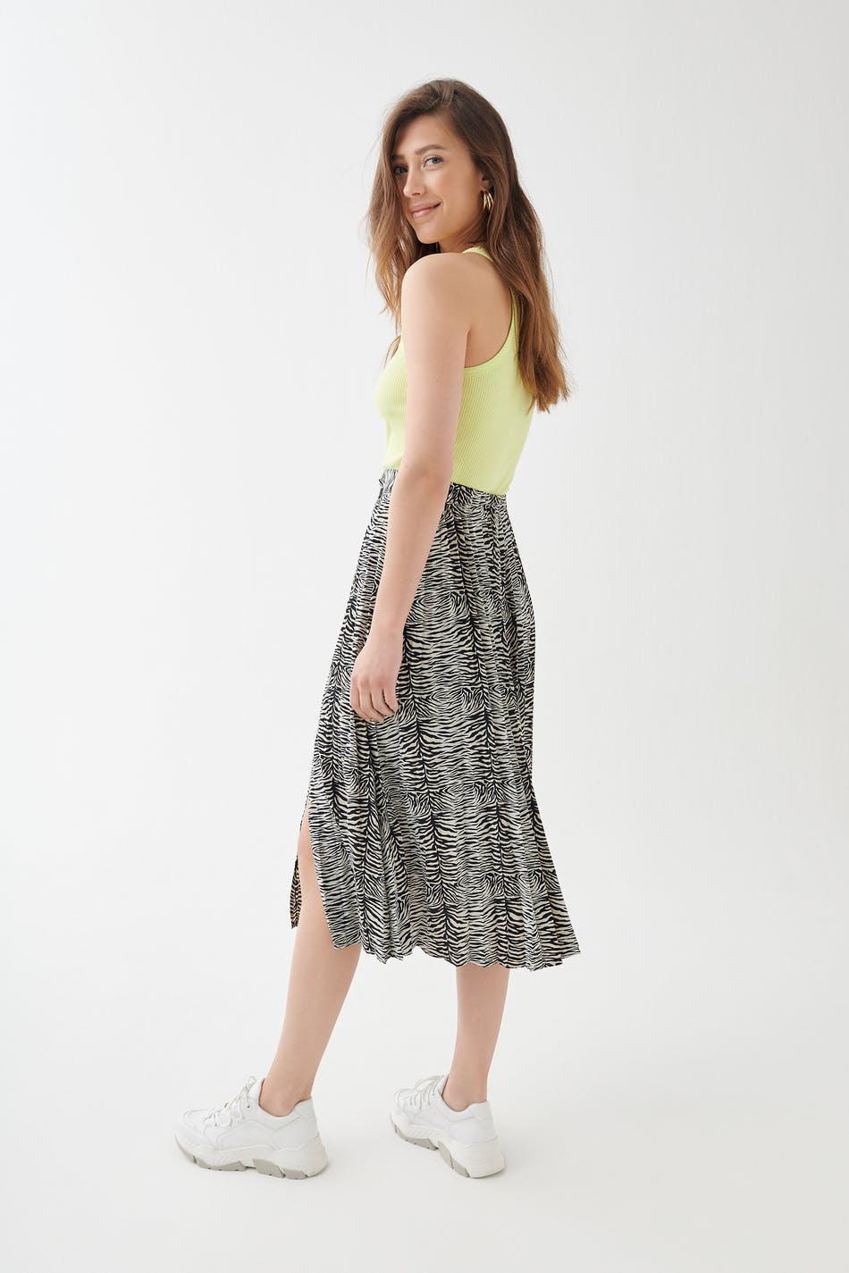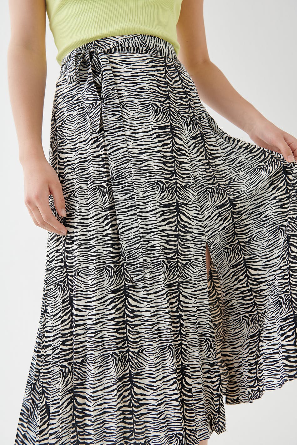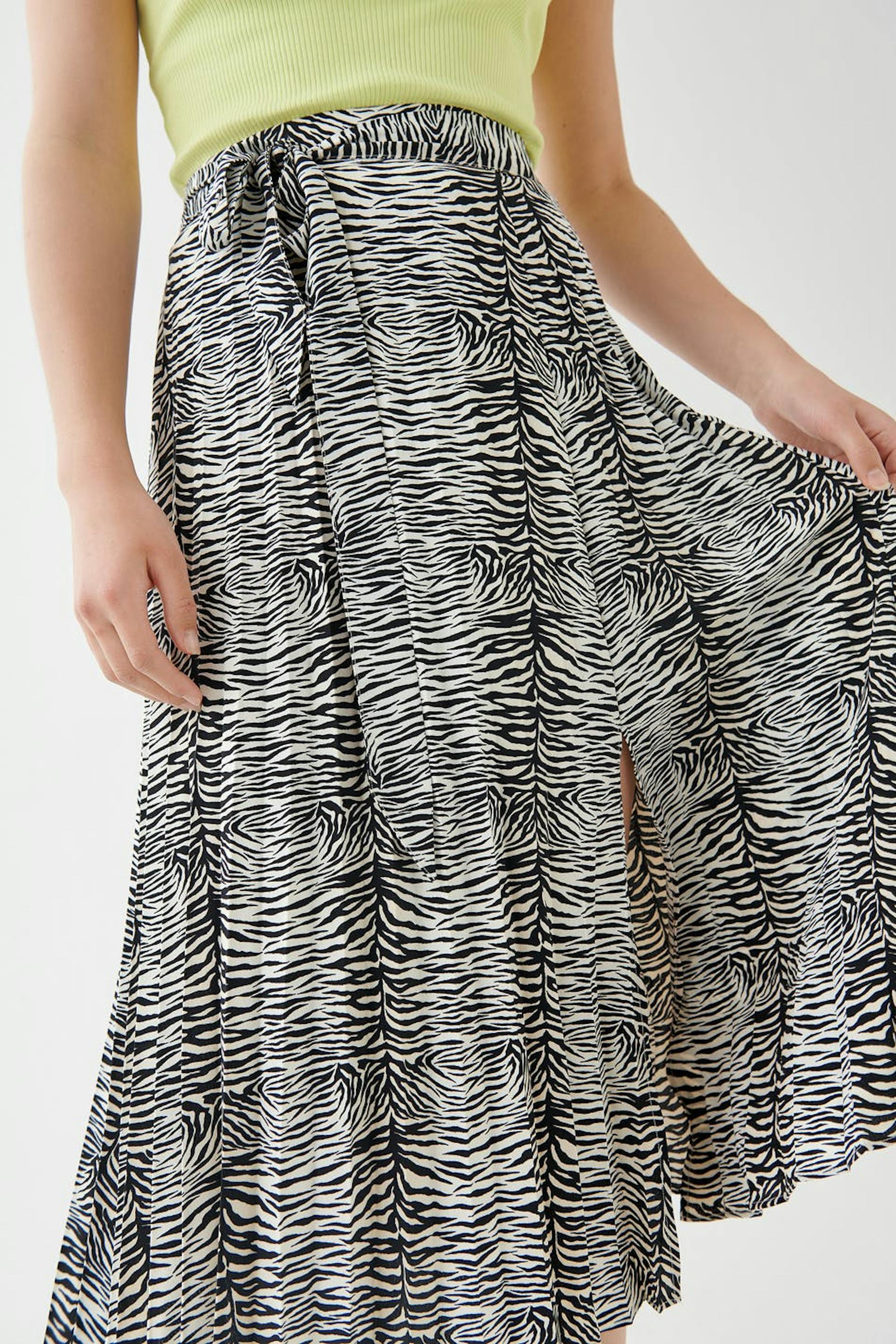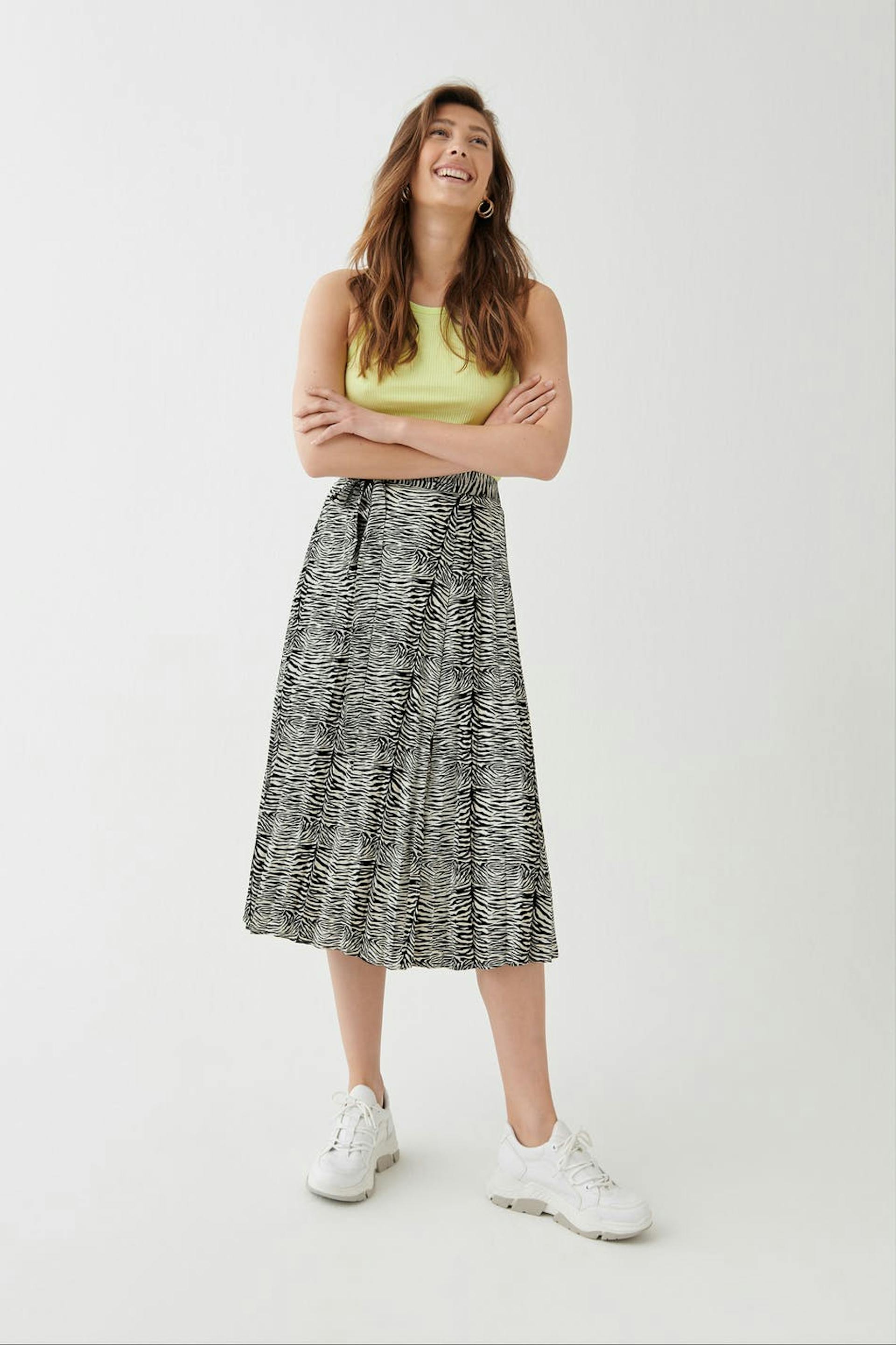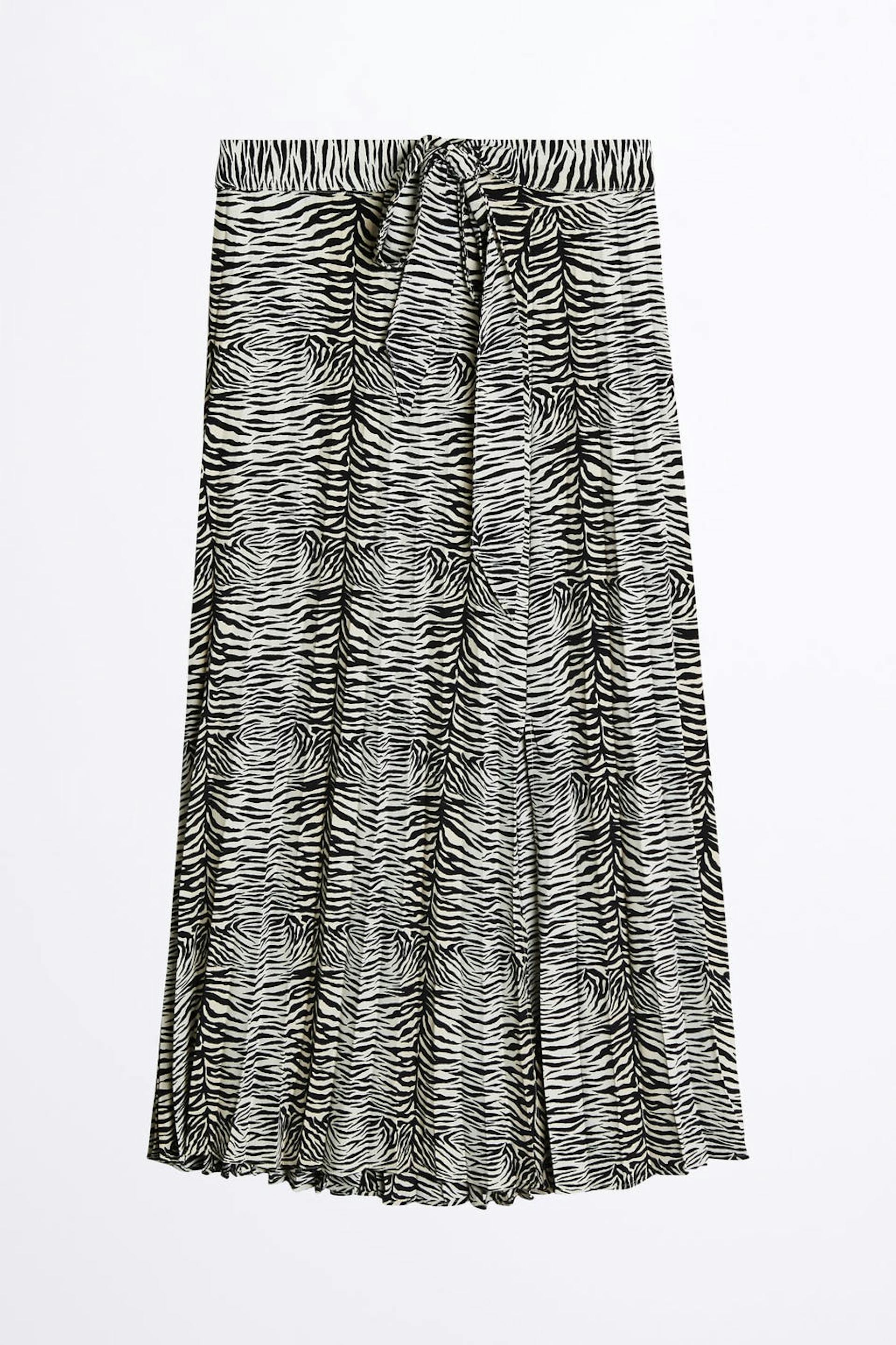 Zebra-gemusterter Rock mit einer normaler Passform. Der Rock ist plissiert und hat ein Gummiband hinten. Er hat eine Schnürung auf der Vorderseite und einen Schlitz am Saum.
