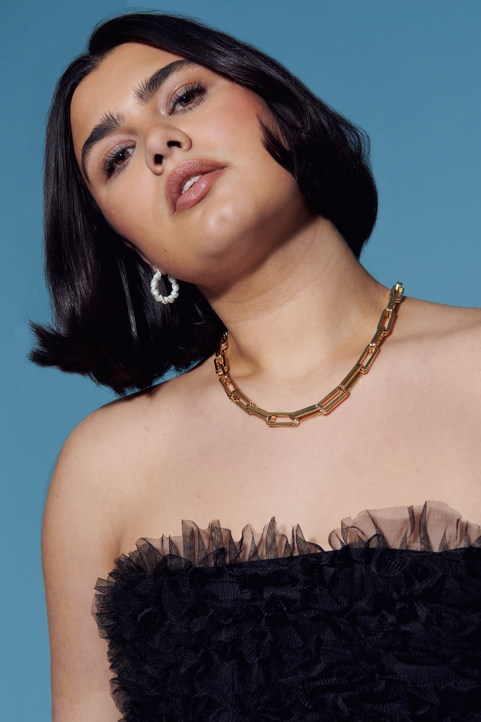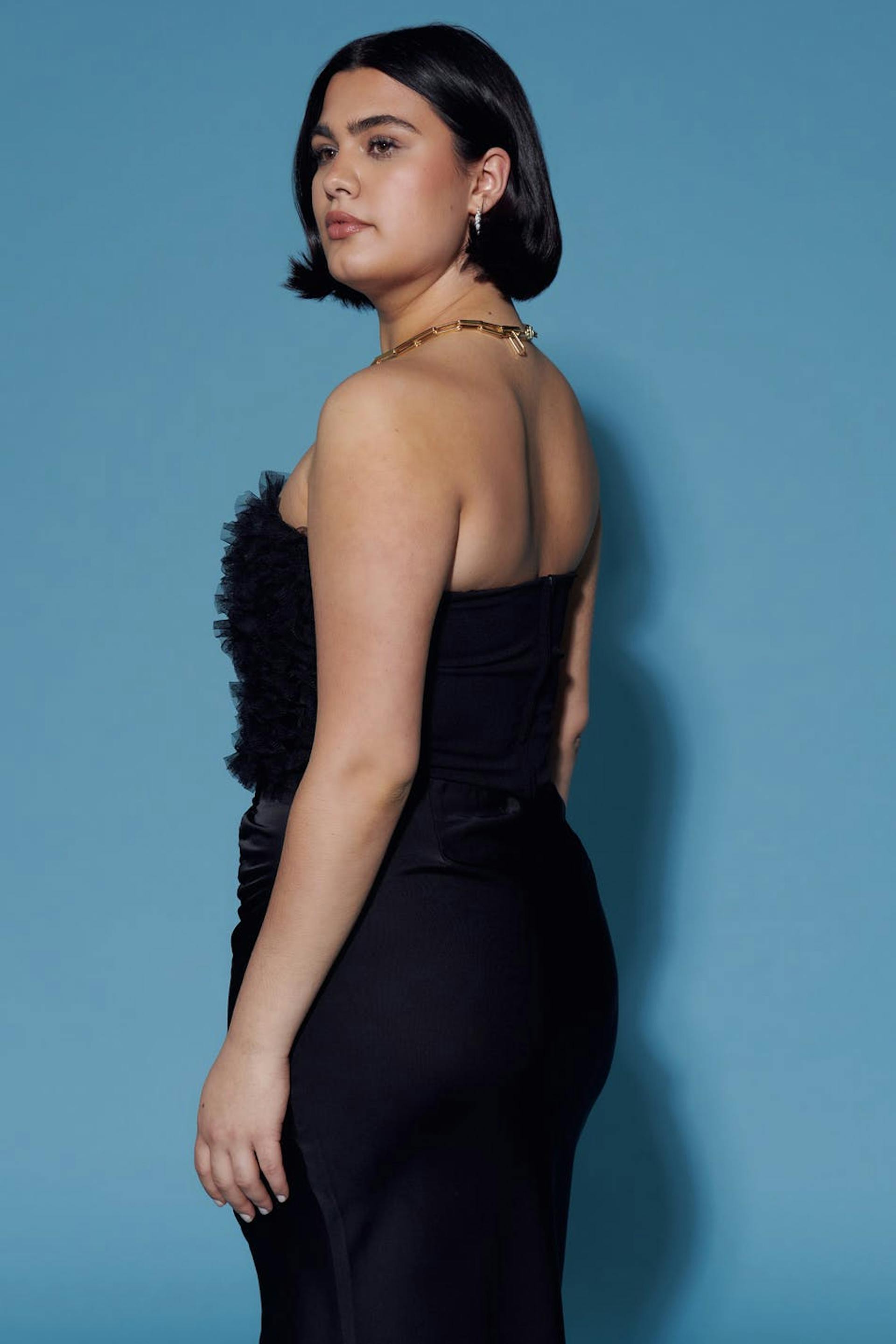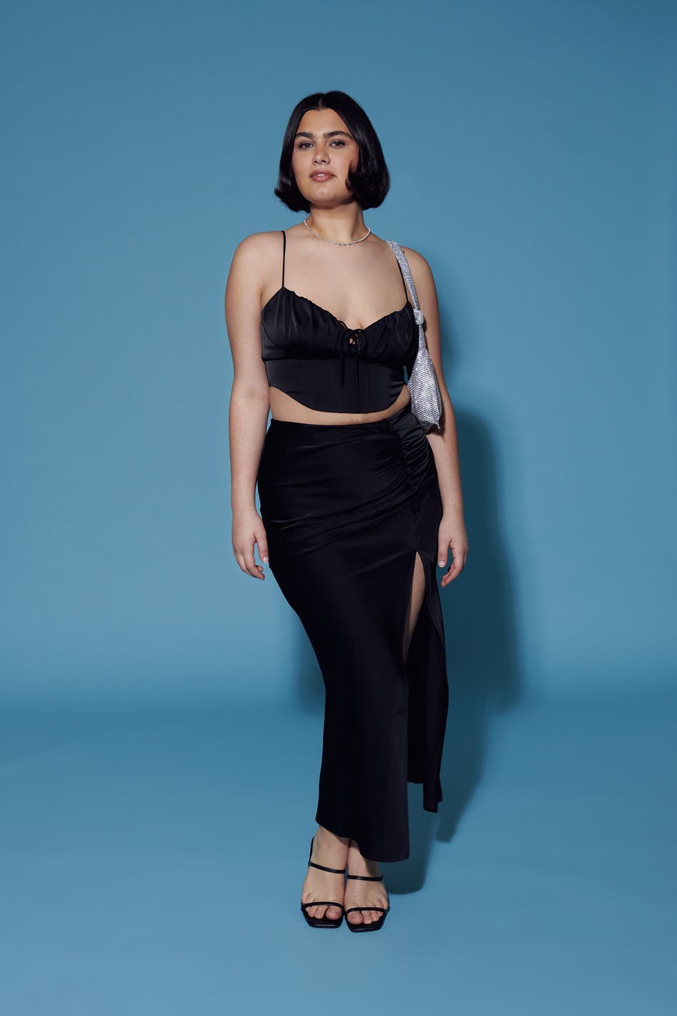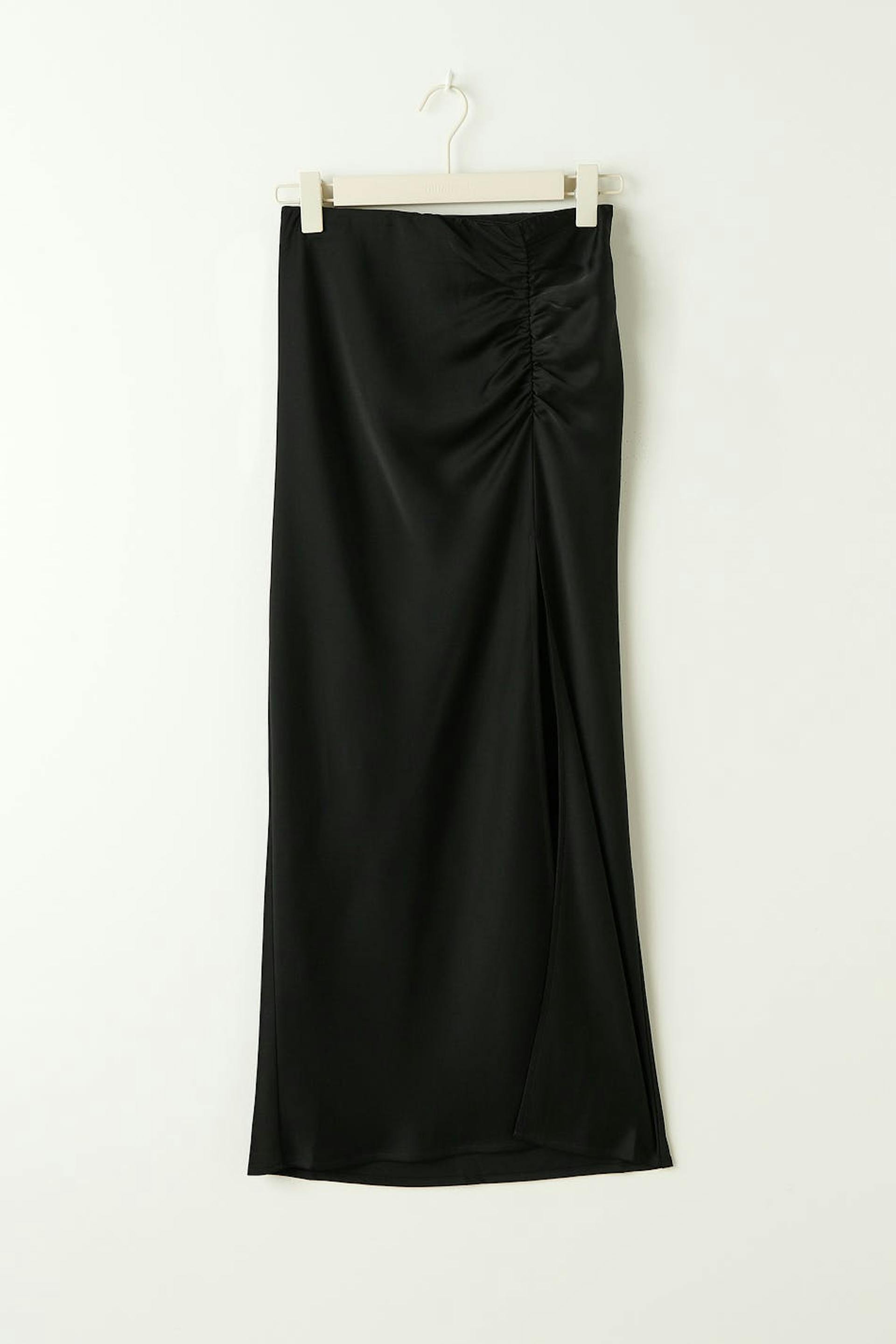 Langer Satinrock mit Schlitz vorne. Der Rock ist schwarz und hat ein gesammeltes Detail an der Seite.