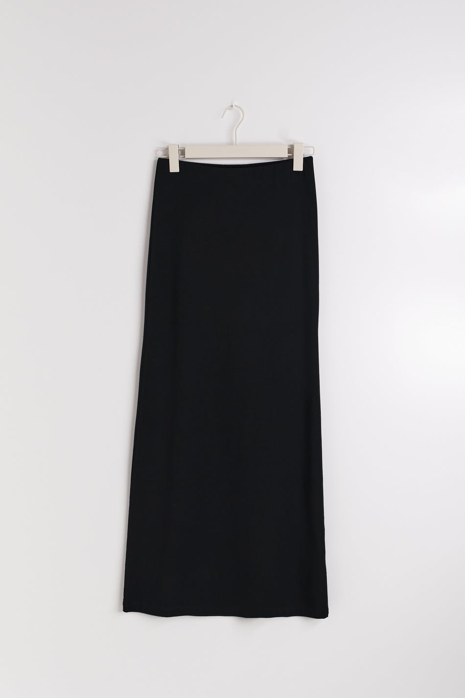 Maxirock aus Jersey mit figurbetonter Passform. Der Rock ist schwarz und hat Gummiband in der Taille.