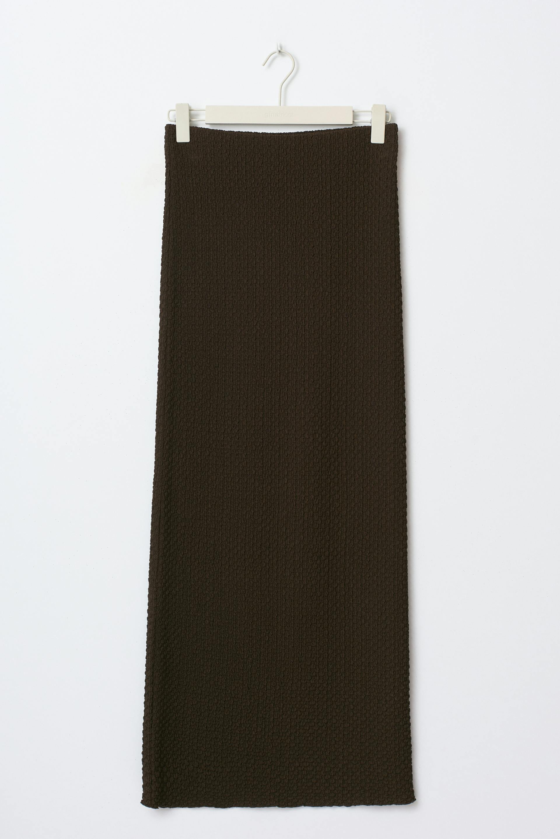 Maxirock mit einer tiefen Taille und strukturierter Qualität. Der Rock ist braun und hat weiches Gummiband in der Taille.