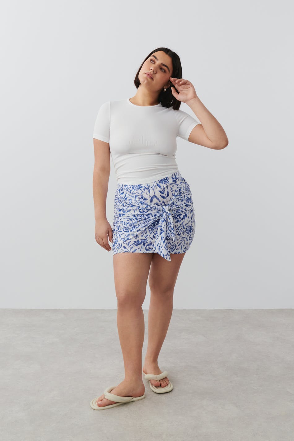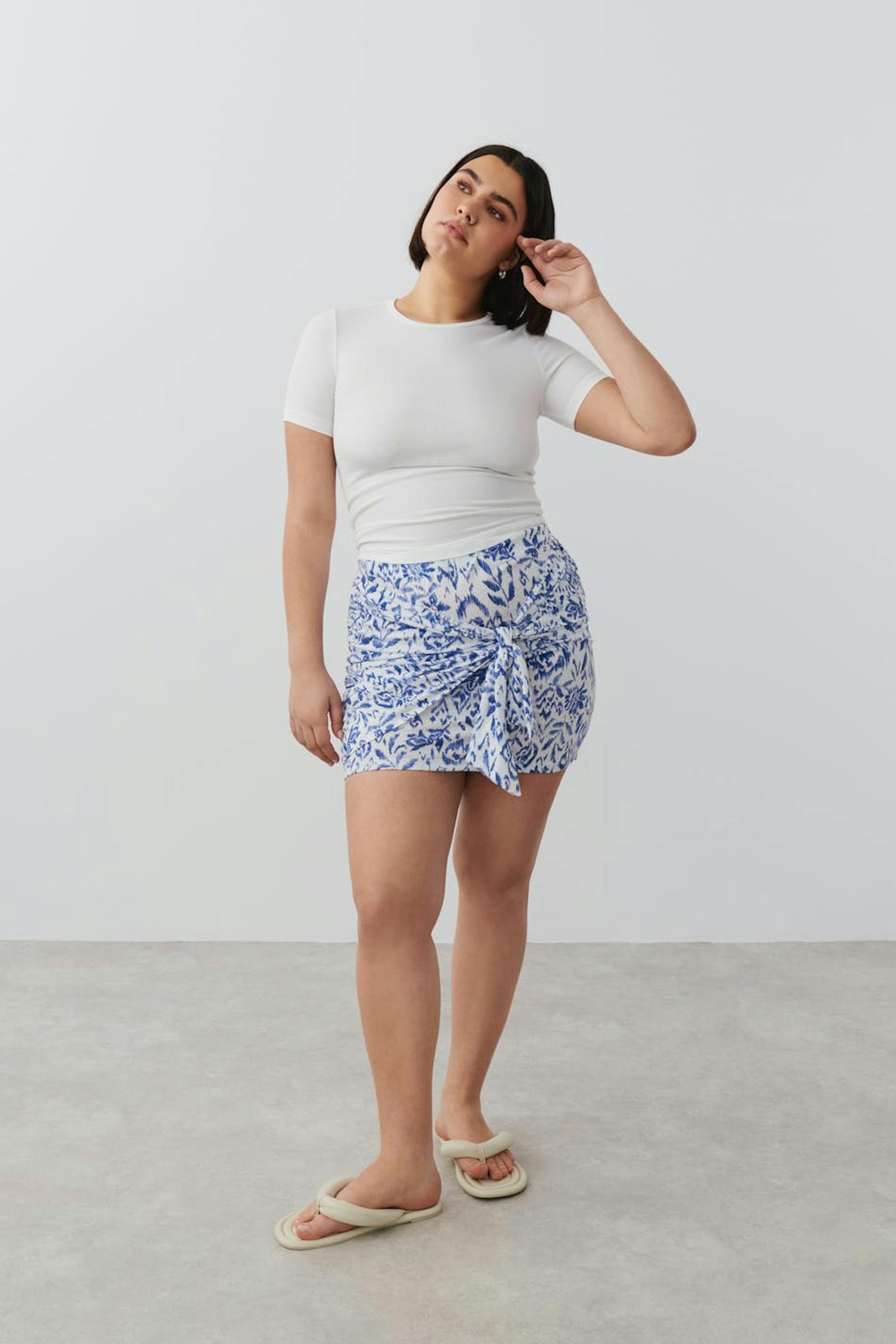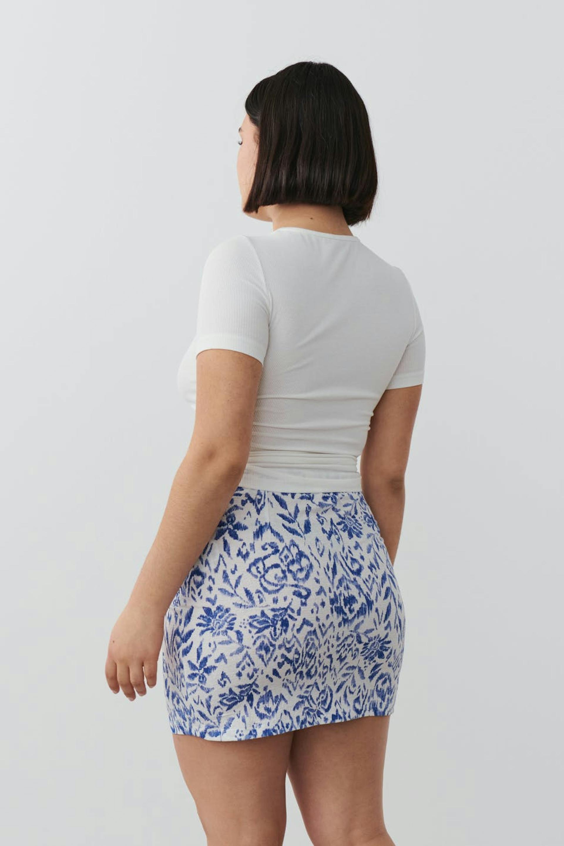 Gemusterter Rock aus Jersey mit figurbetonter Passform. Der Rock ist blau, weiβ und kurz. Er hat Gummiband in der Taille und überlappendes Detail mit Selbstbindung vorne.