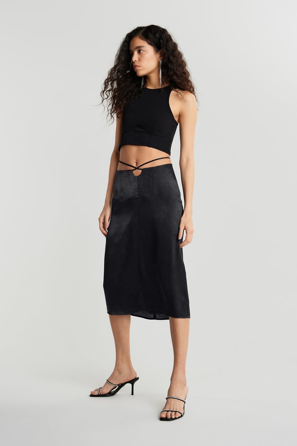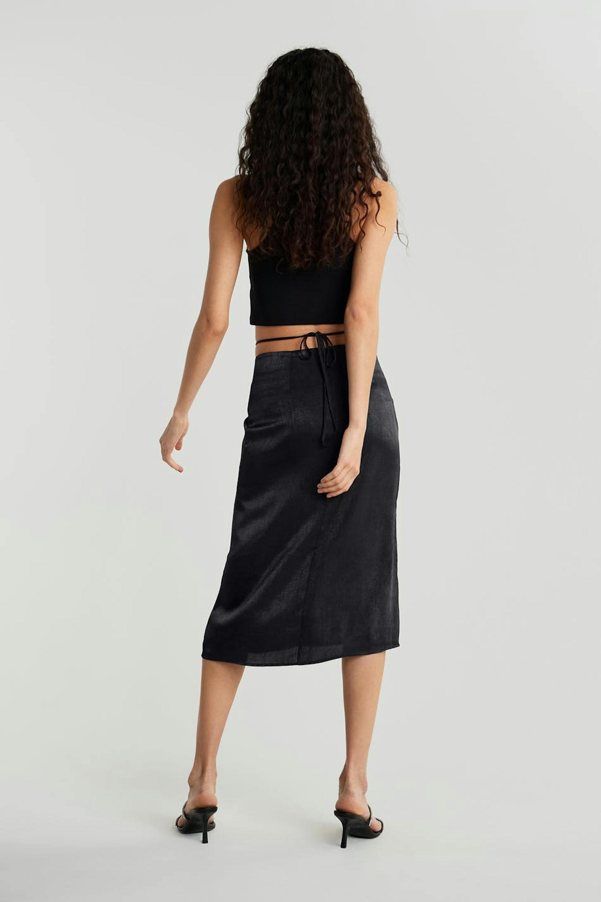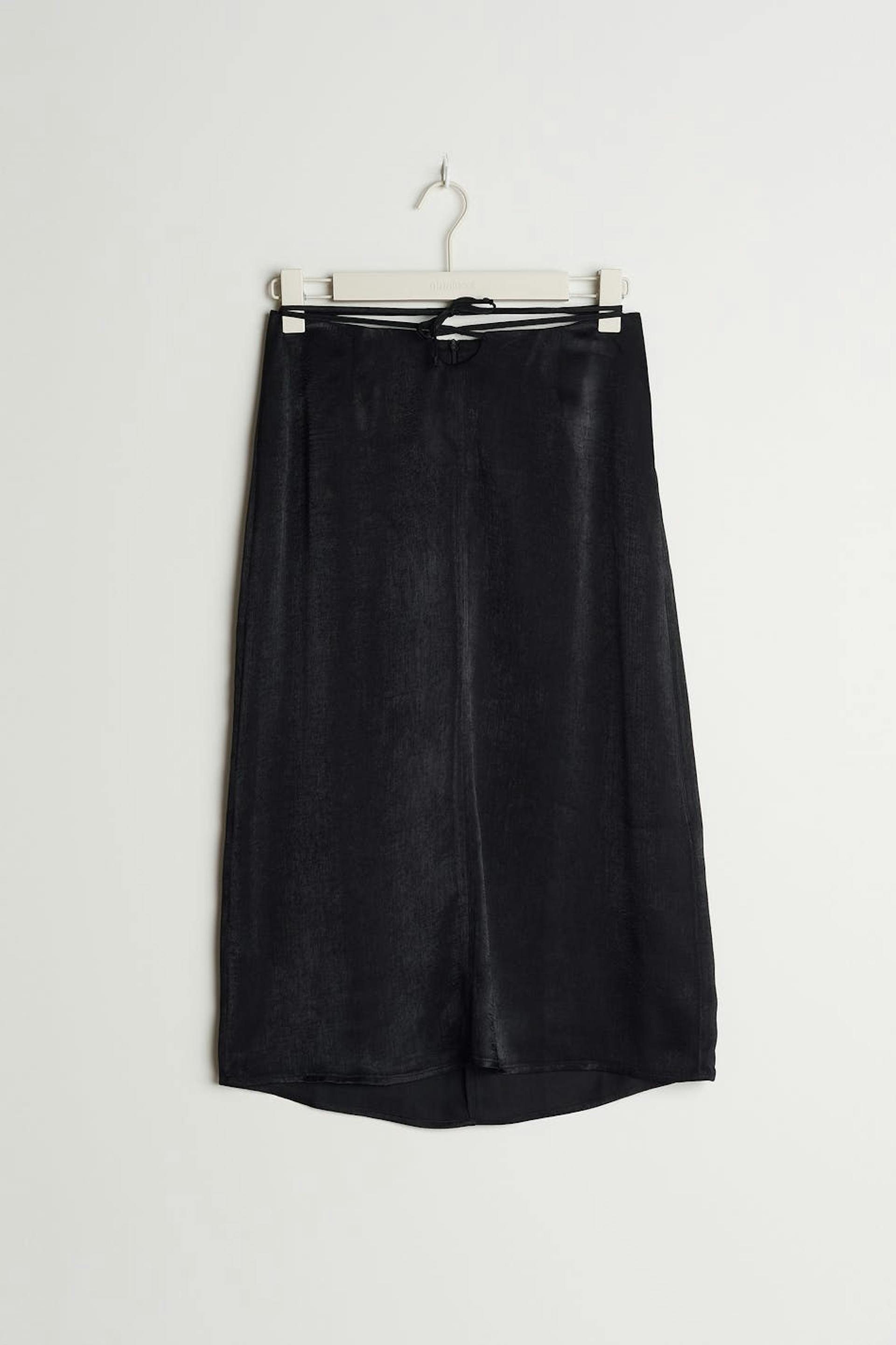Rock mit einer Midi-Länge. Der Rock ist perfekt für eine Party und schwarz und hat ein glänzendes, satinartiges Material. Er hat eine tief geschnittene Taille mit Schnürungen vorne mit einer Selbstbindung am Rücken.