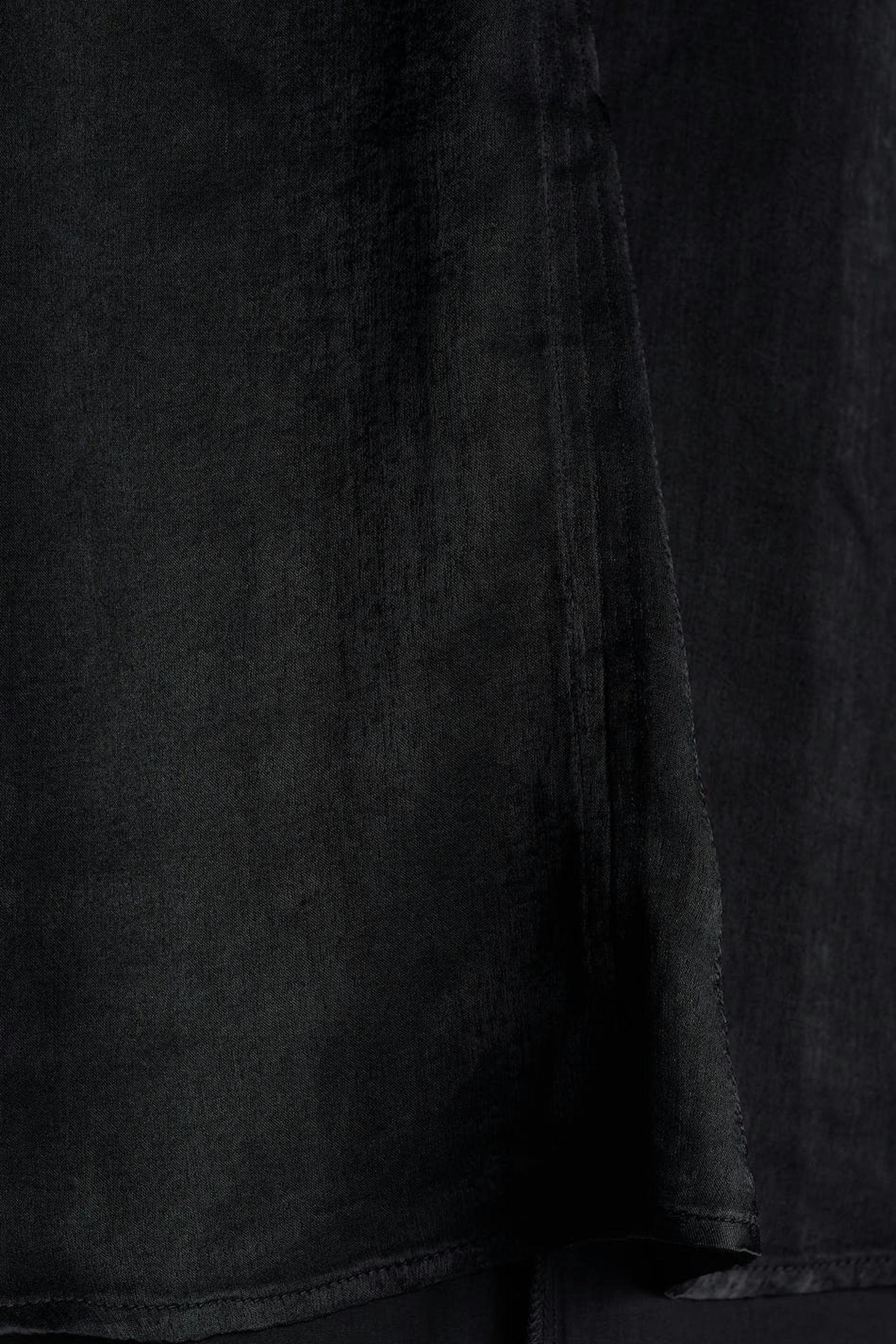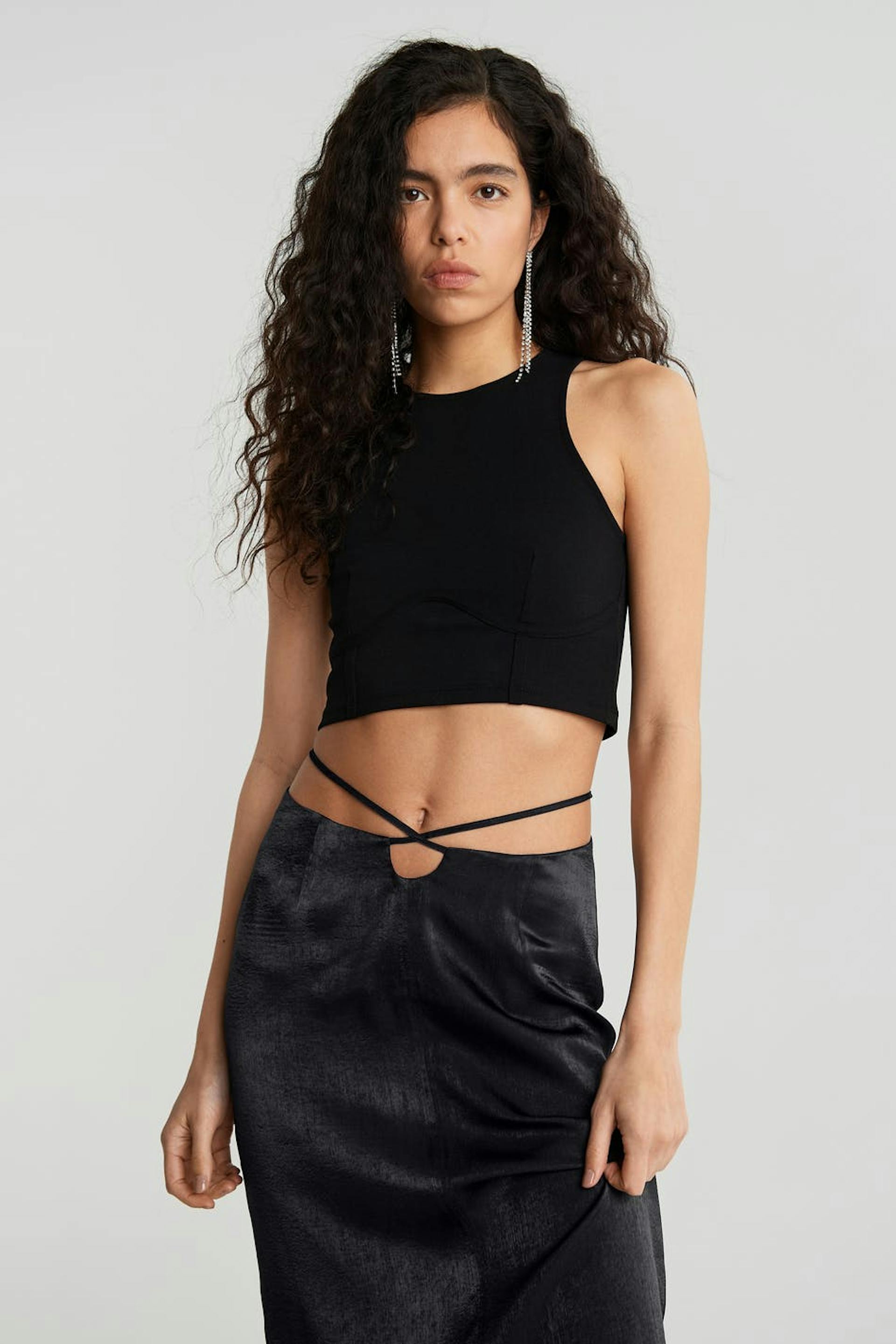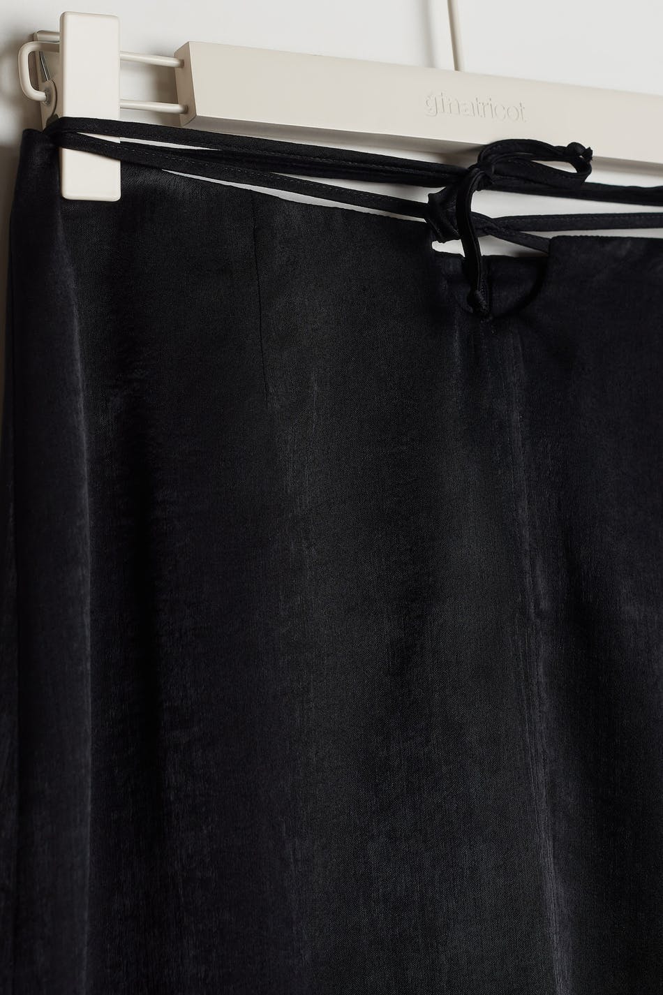 Rock mit einer Midi-Länge. Der Rock ist perfekt für eine Party und schwarz und hat ein glänzendes, satinartiges Material. Er hat eine tief geschnittene Taille mit Schnürungen vorne mit einer Selbstbindung am Rücken.