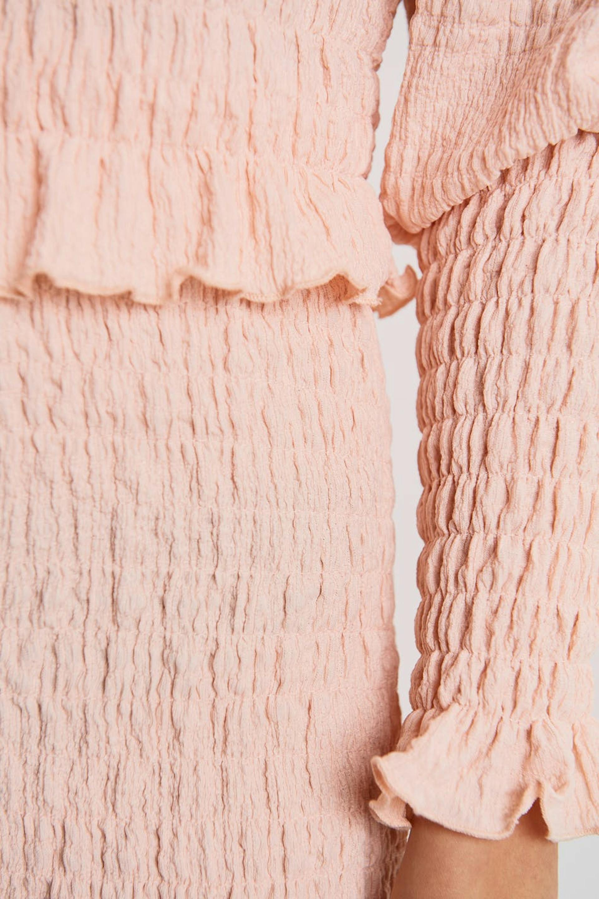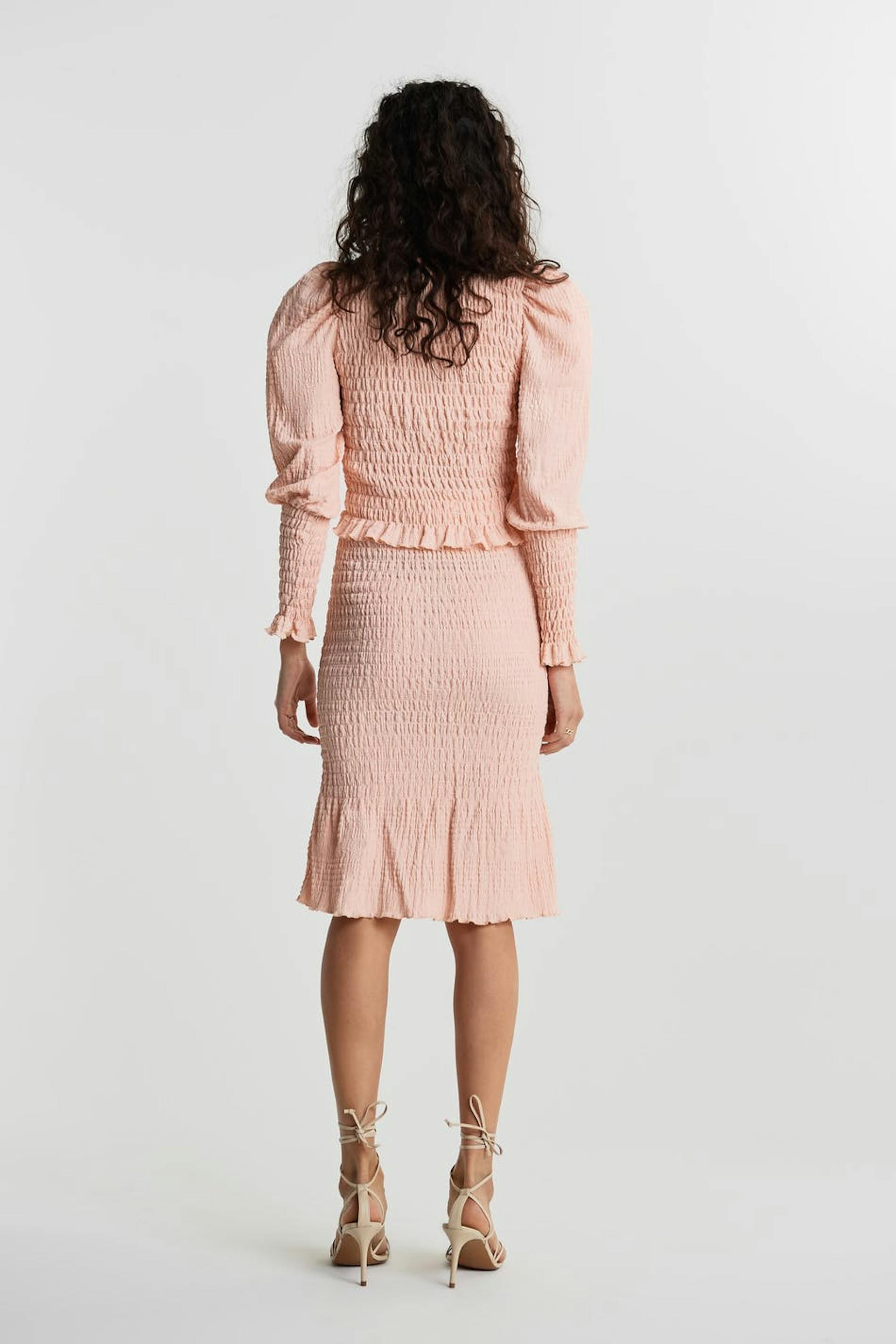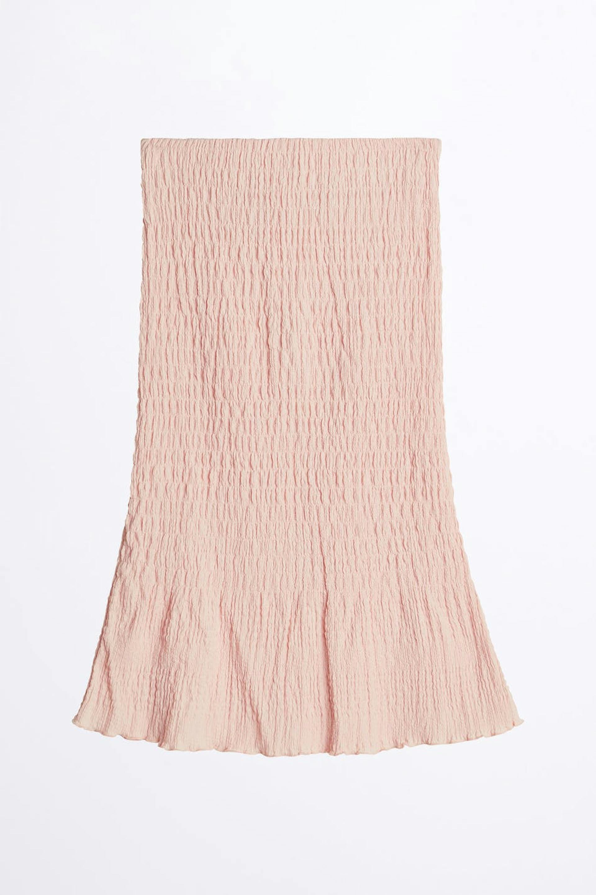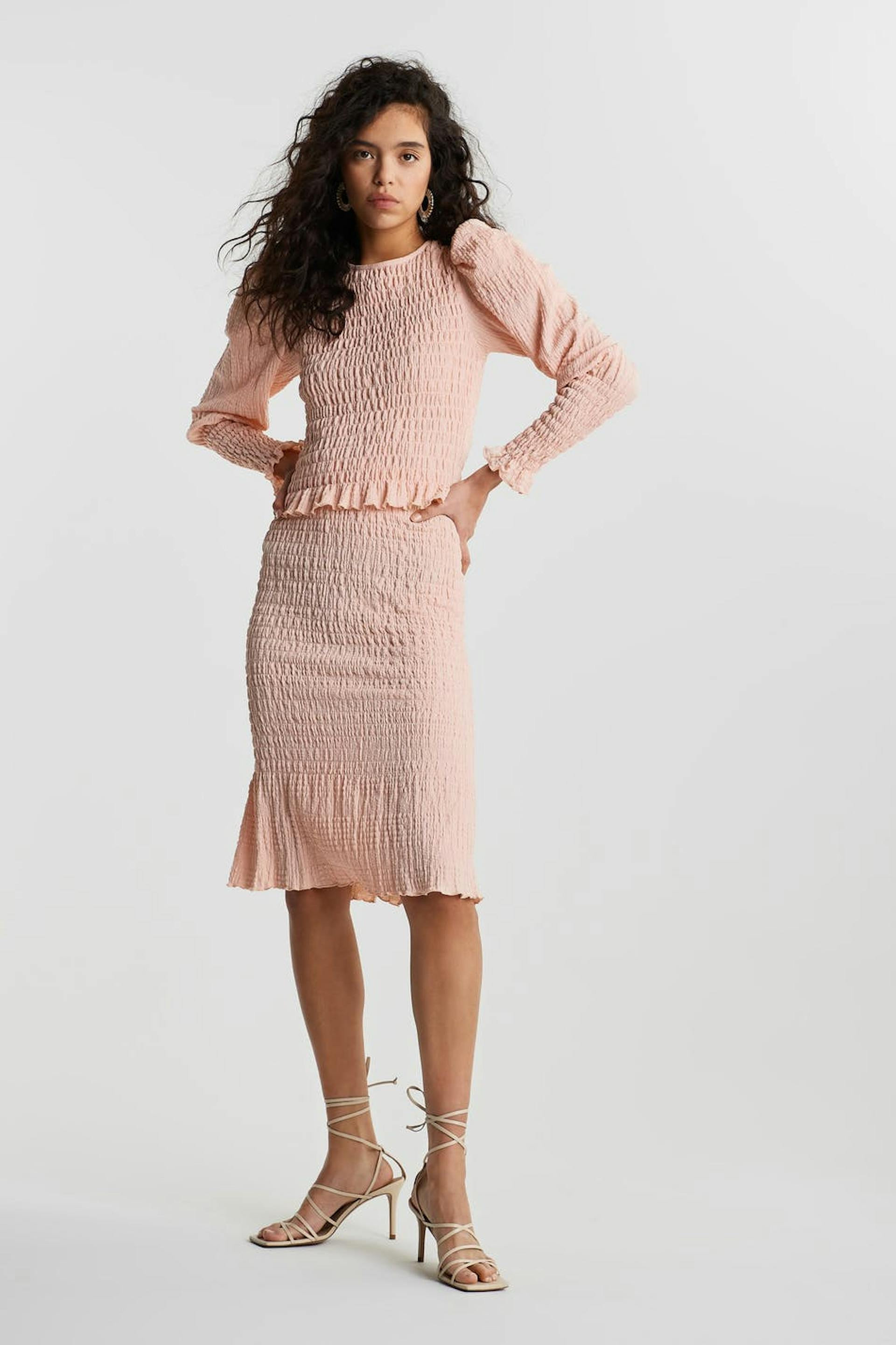 Gesmokter Rock mit einer normaler Passform. Der Rock ist rosa und hat einen Rüschenrock am Saum.