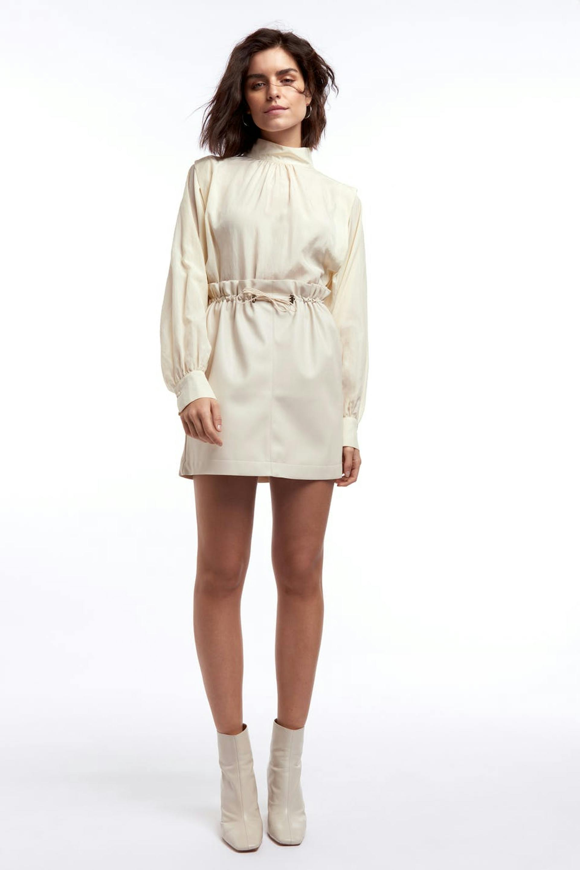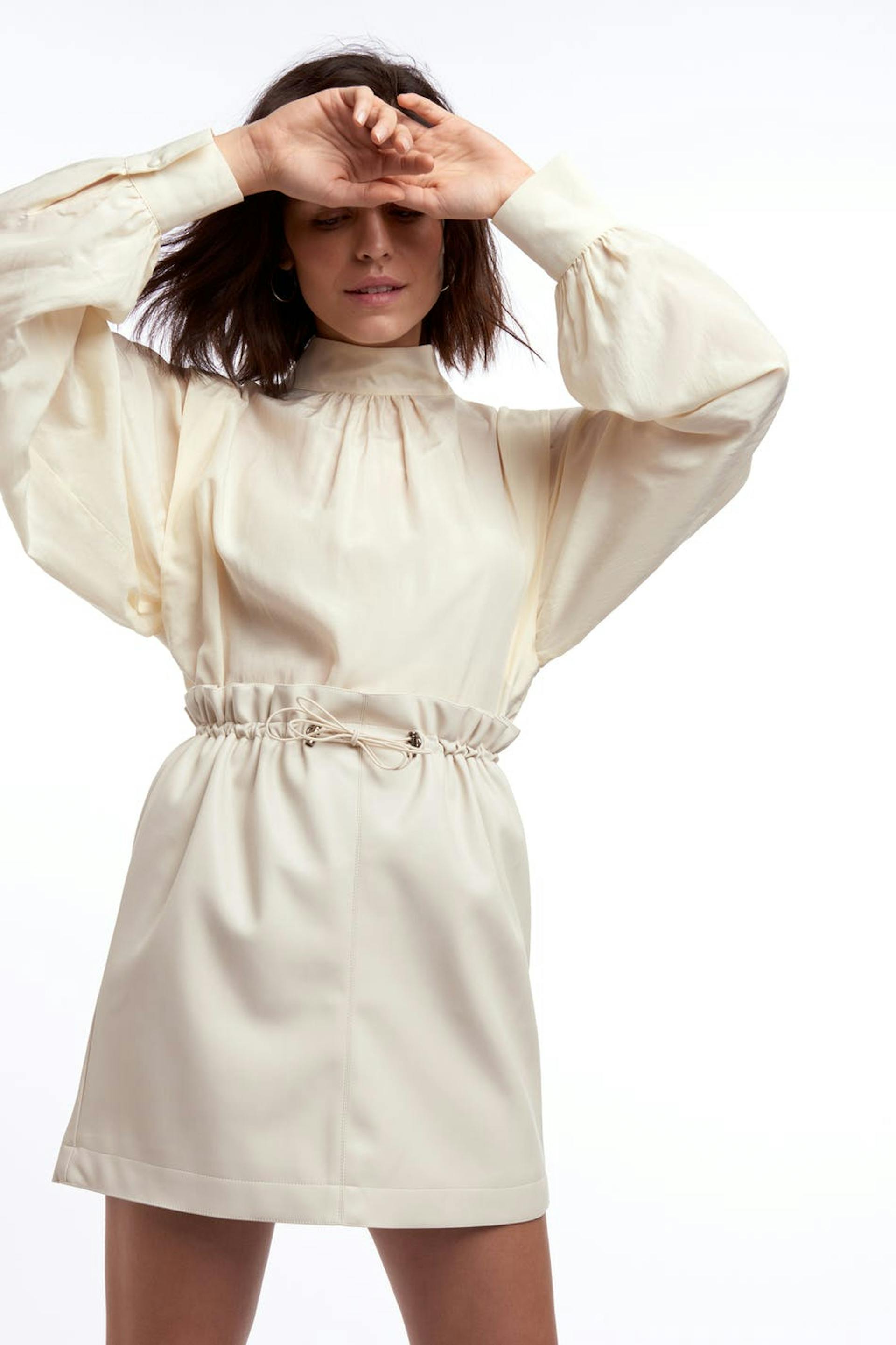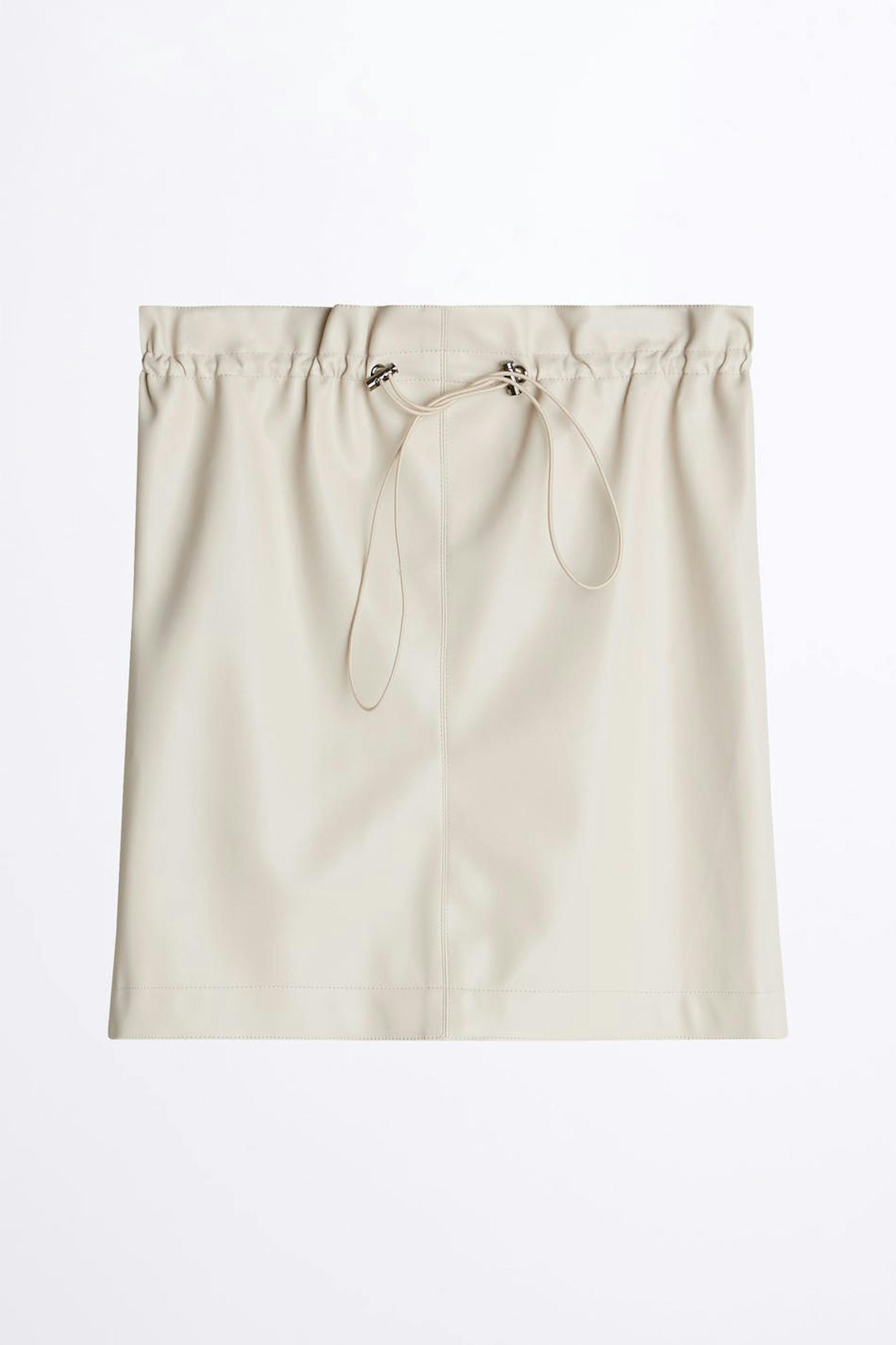 Kurzer Rock mit einem Kordelzug mit einem Paperbagen Detail in der Taille. Der Rock ist weiβ. Er ist hergestellt aus PU-Leder.