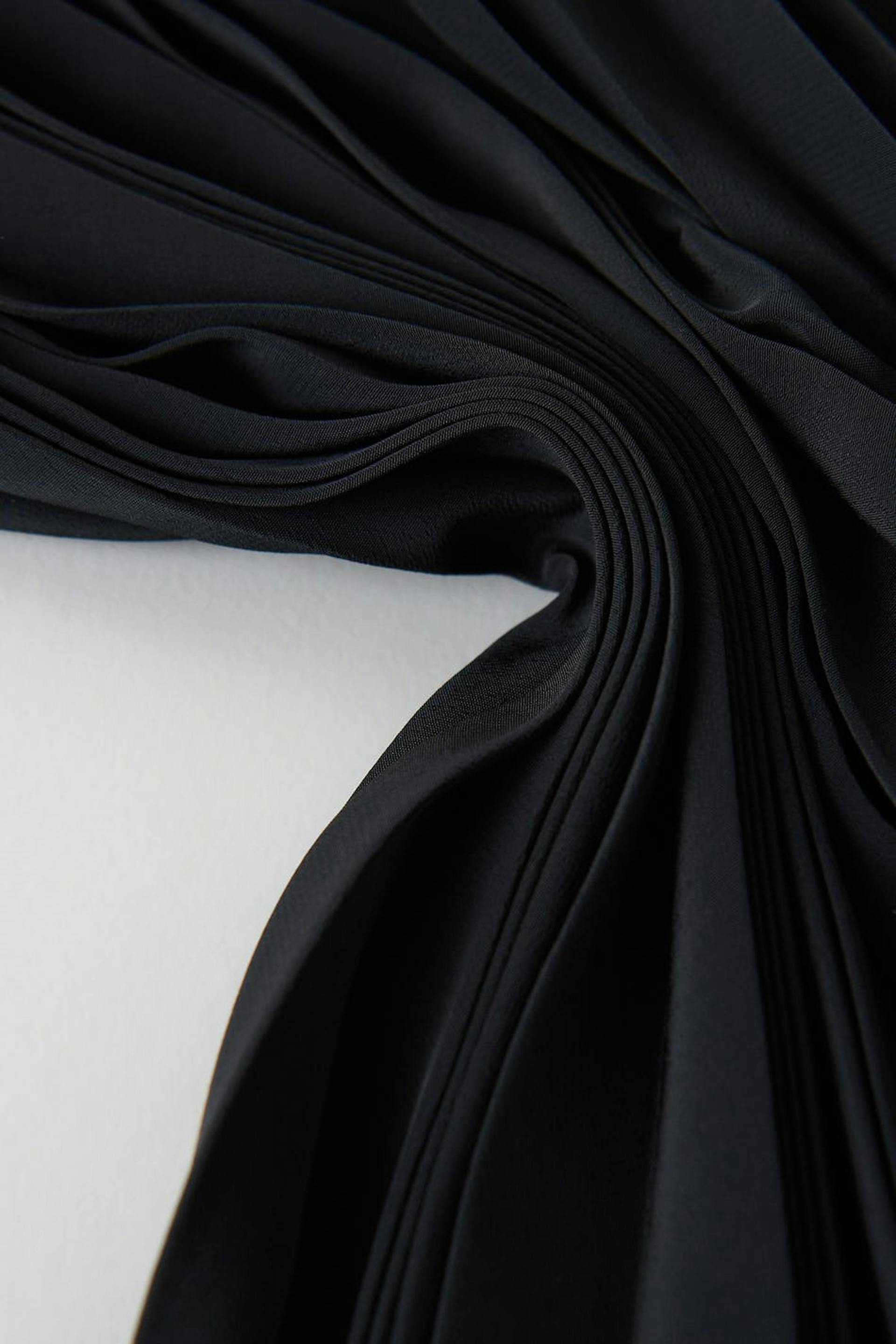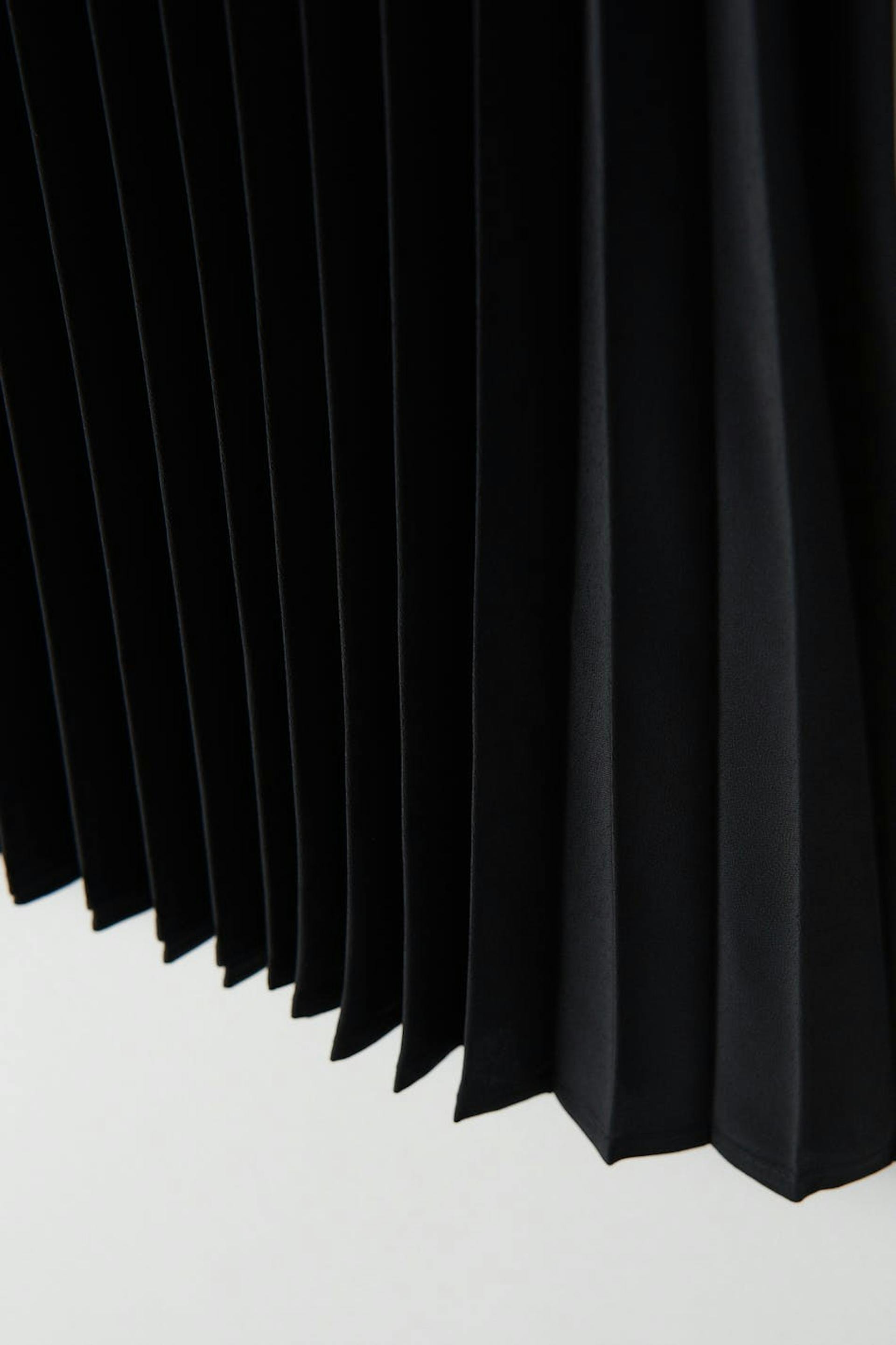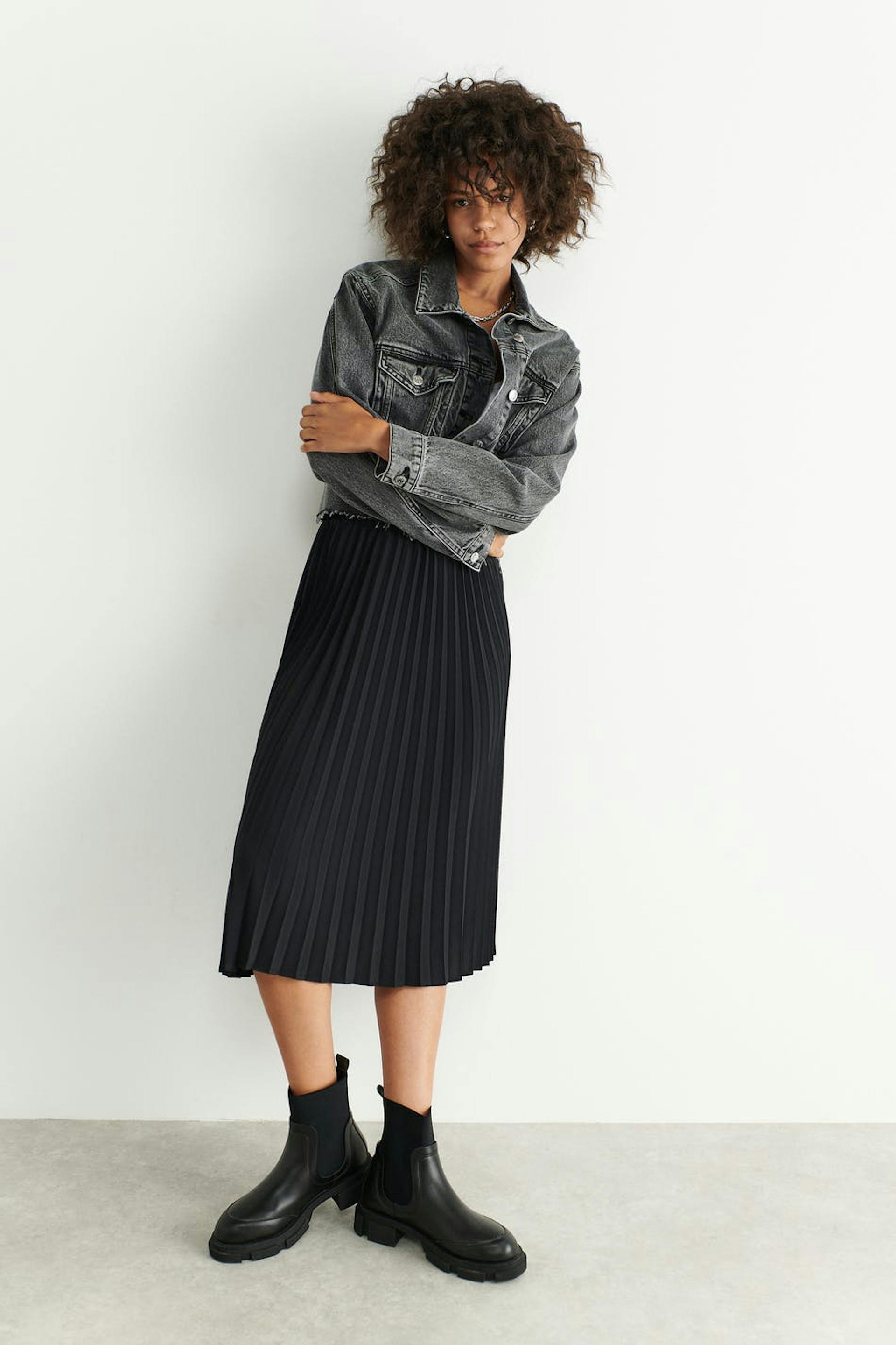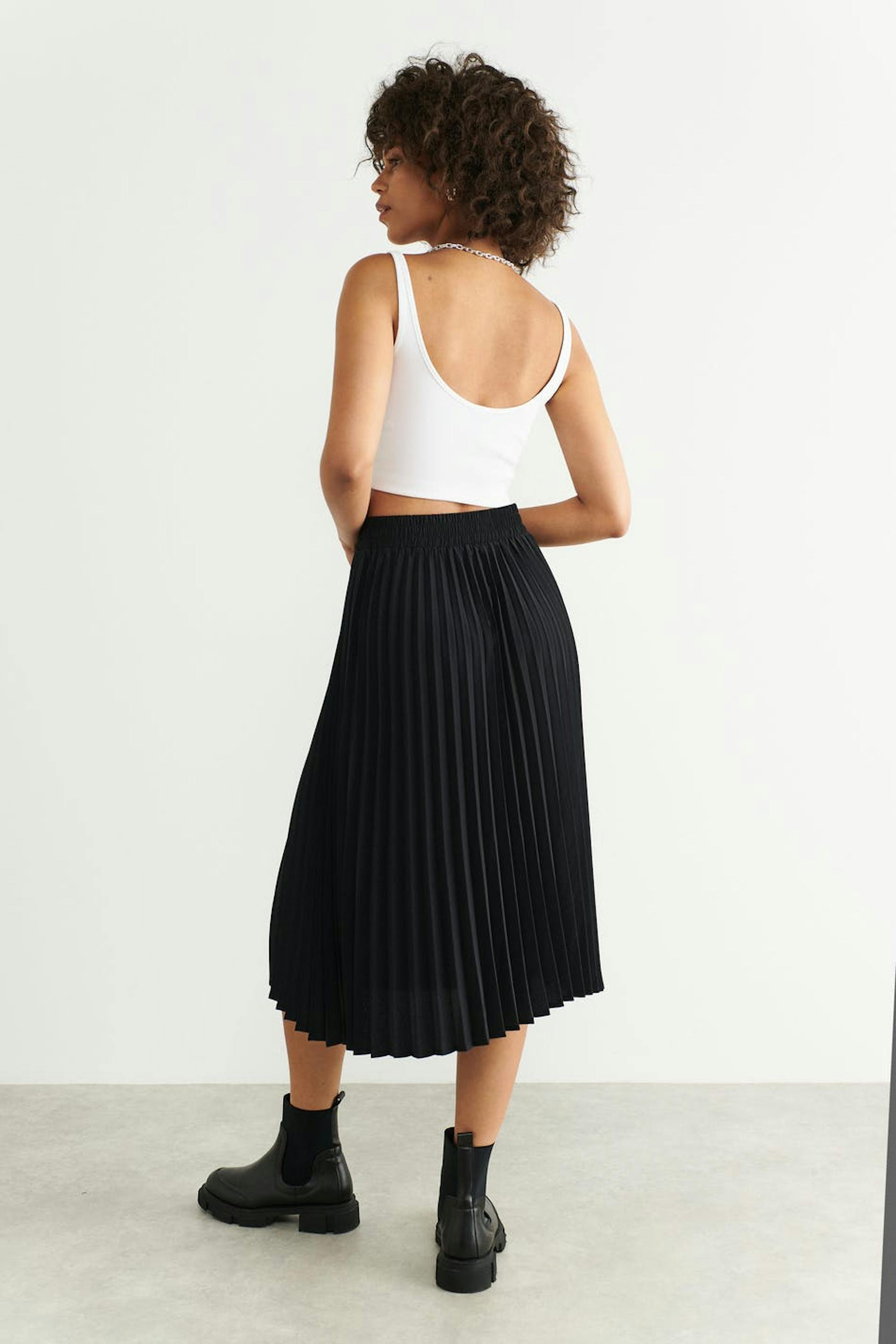 Plissierter Midirock mit Gummiband in der Taille. Der Rock ist ausgestellt und schwarz.