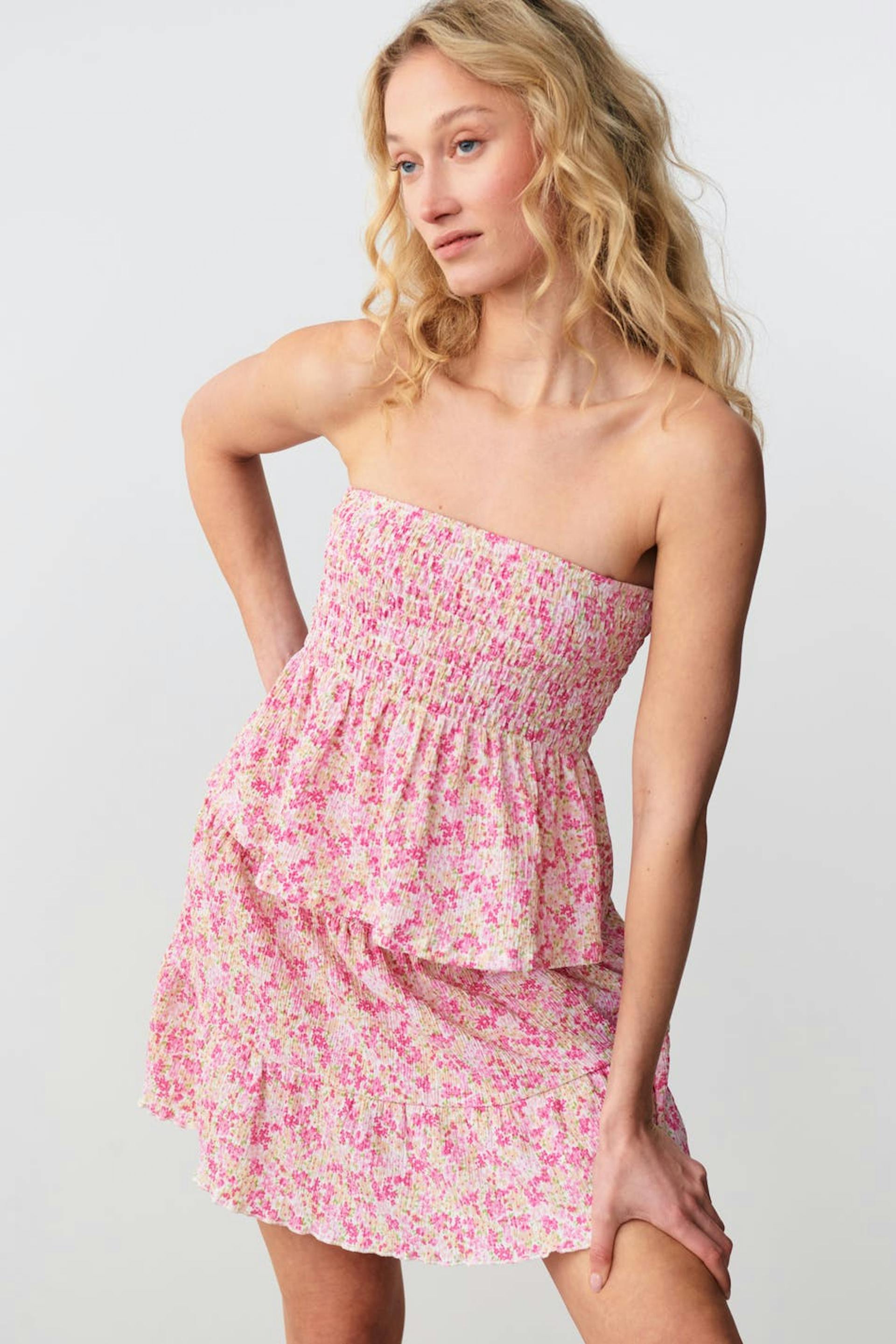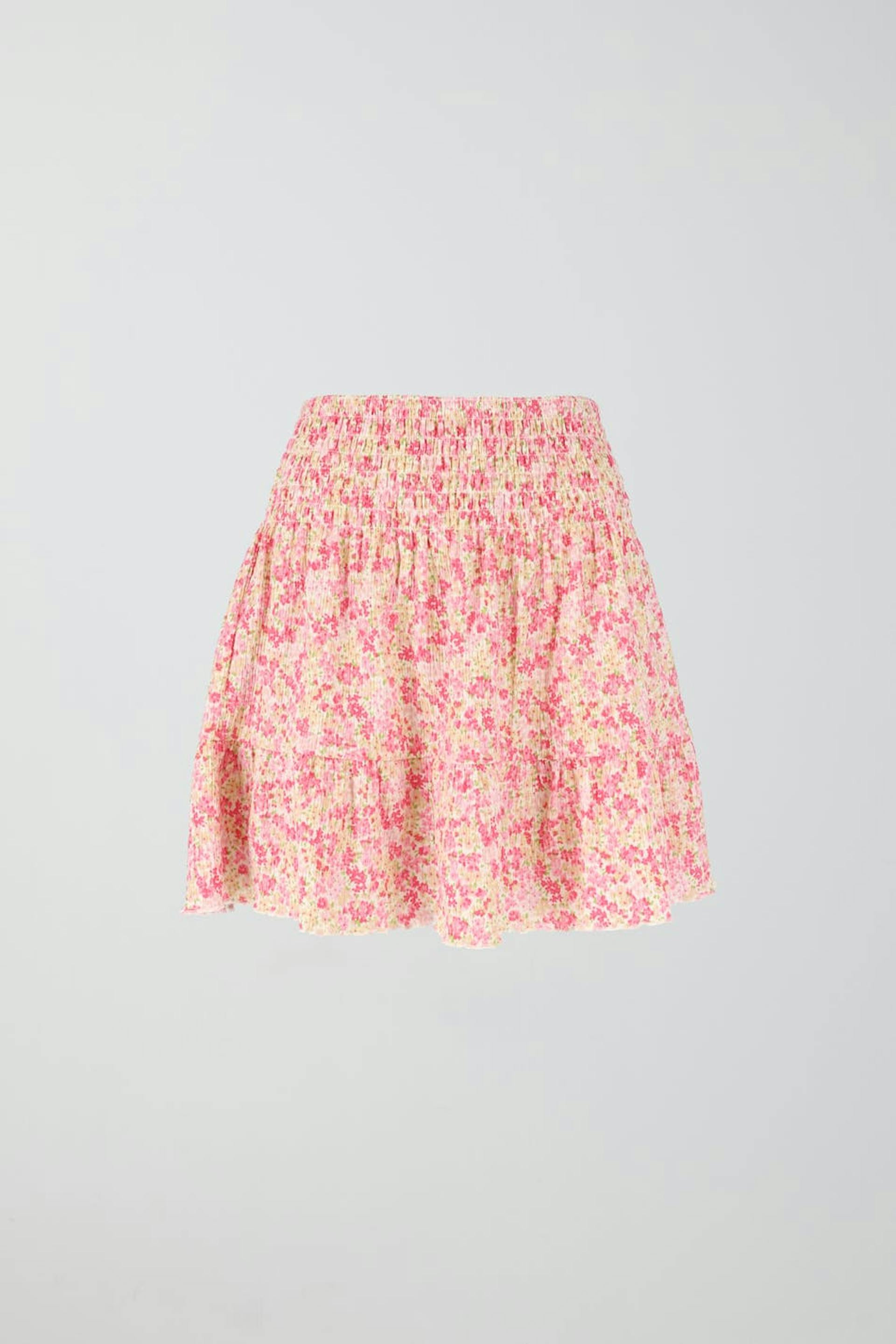 Kurzer Rock aus Jersey mit gesmokter Taille. Der Rock ist rosa und hat ein strukturiertes Material. Er hat normale Passform, gerüscht Details, Gummiband in der Taille und Rüschenröcke an der Unterkante.