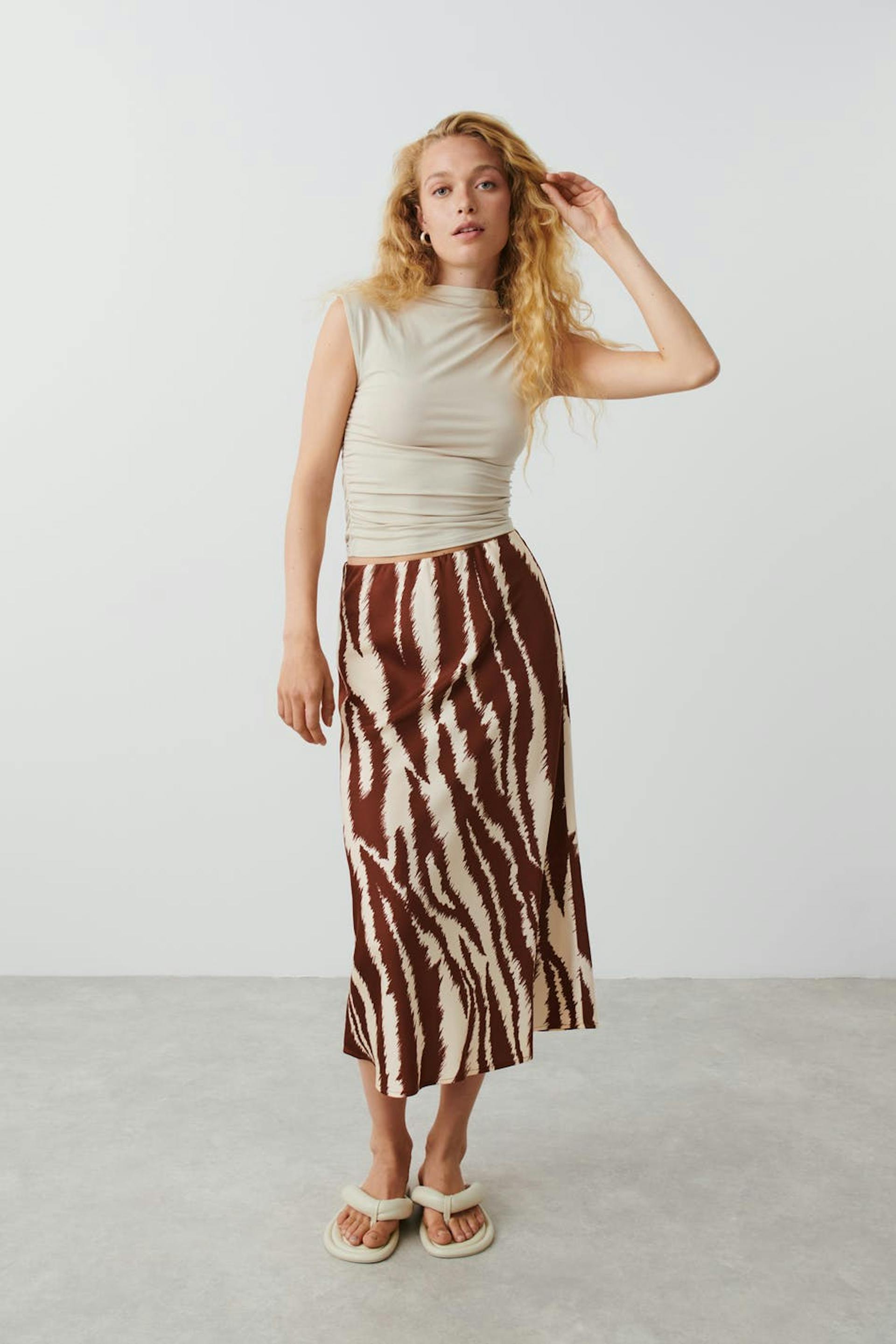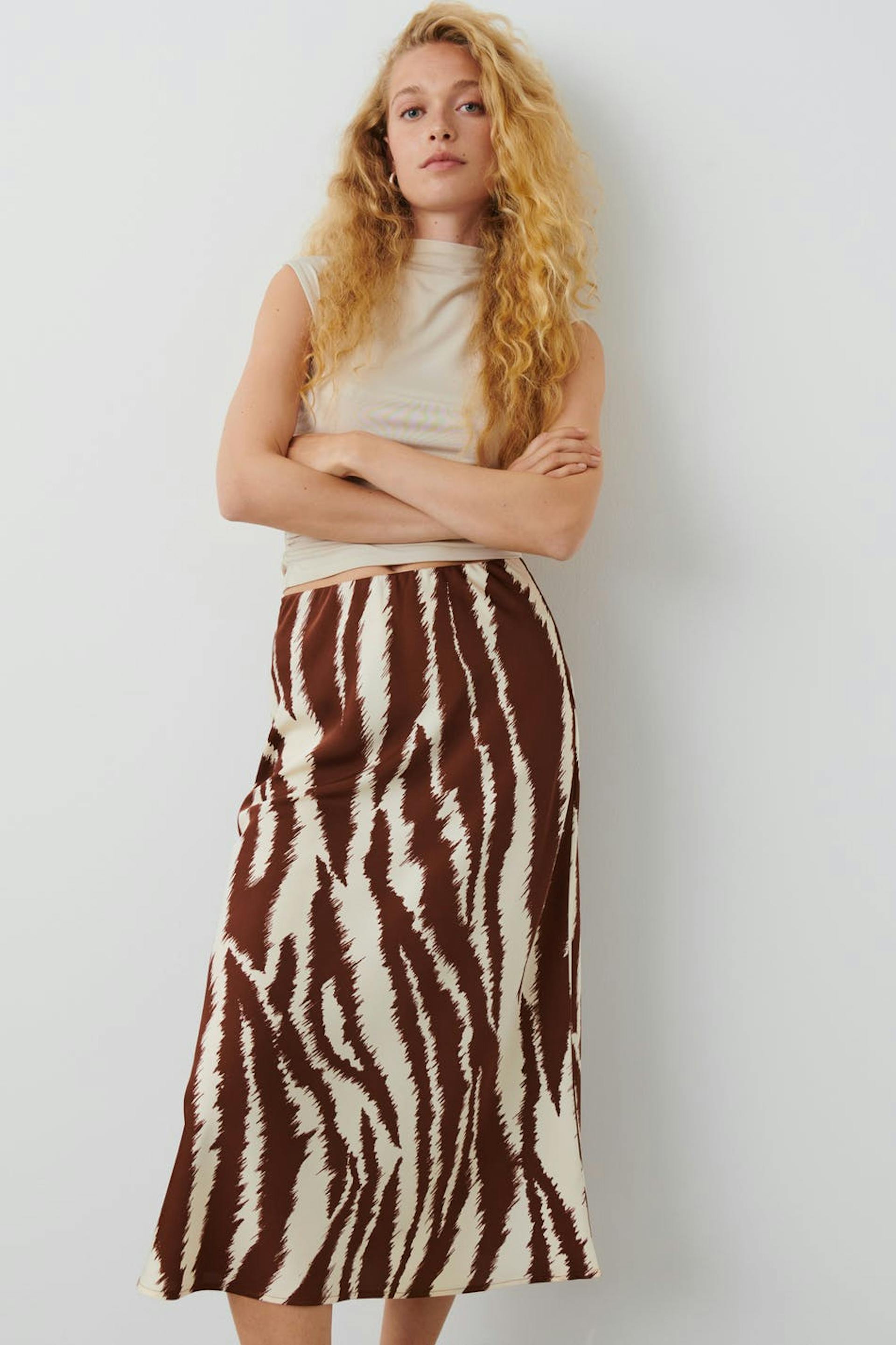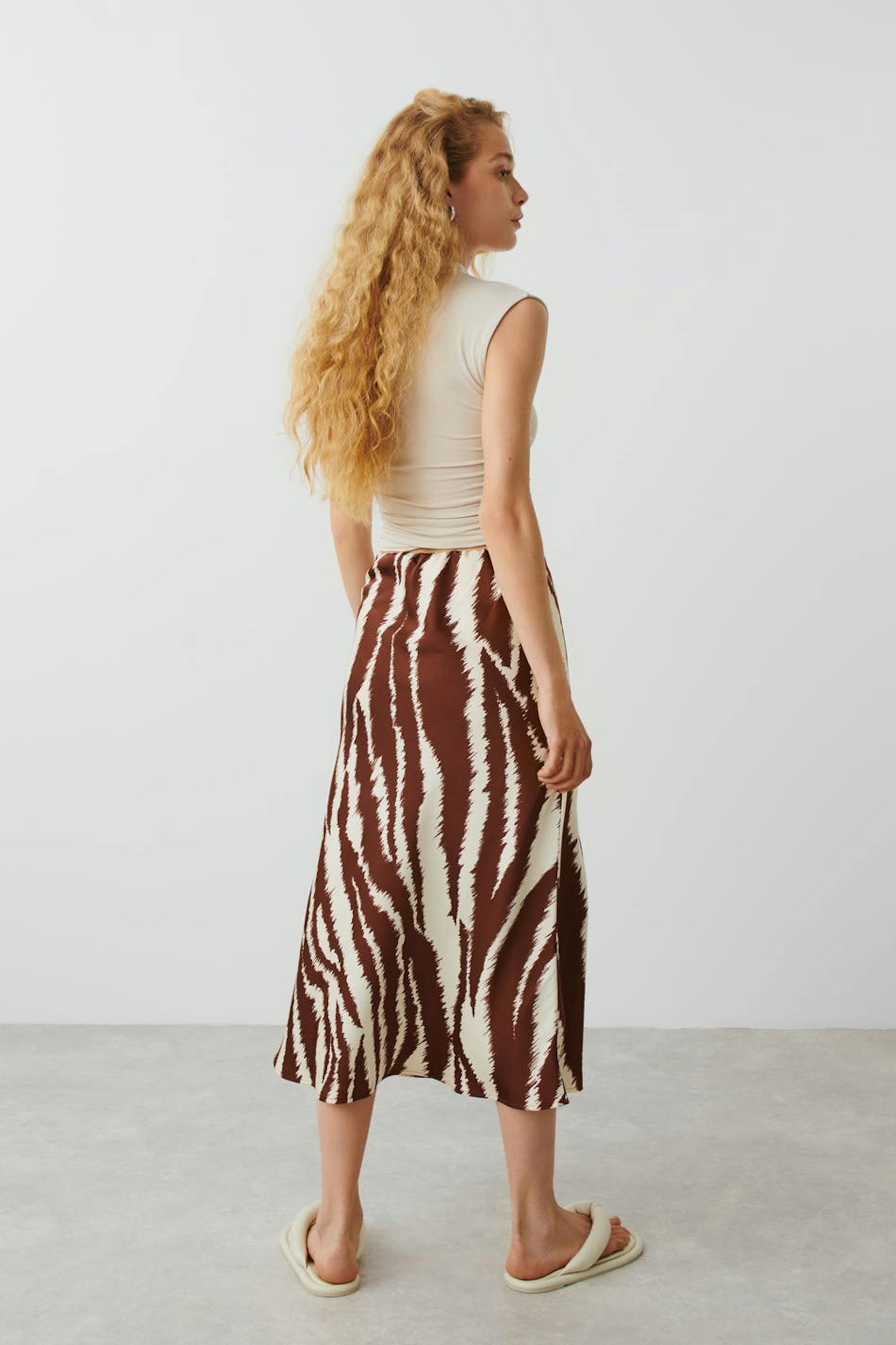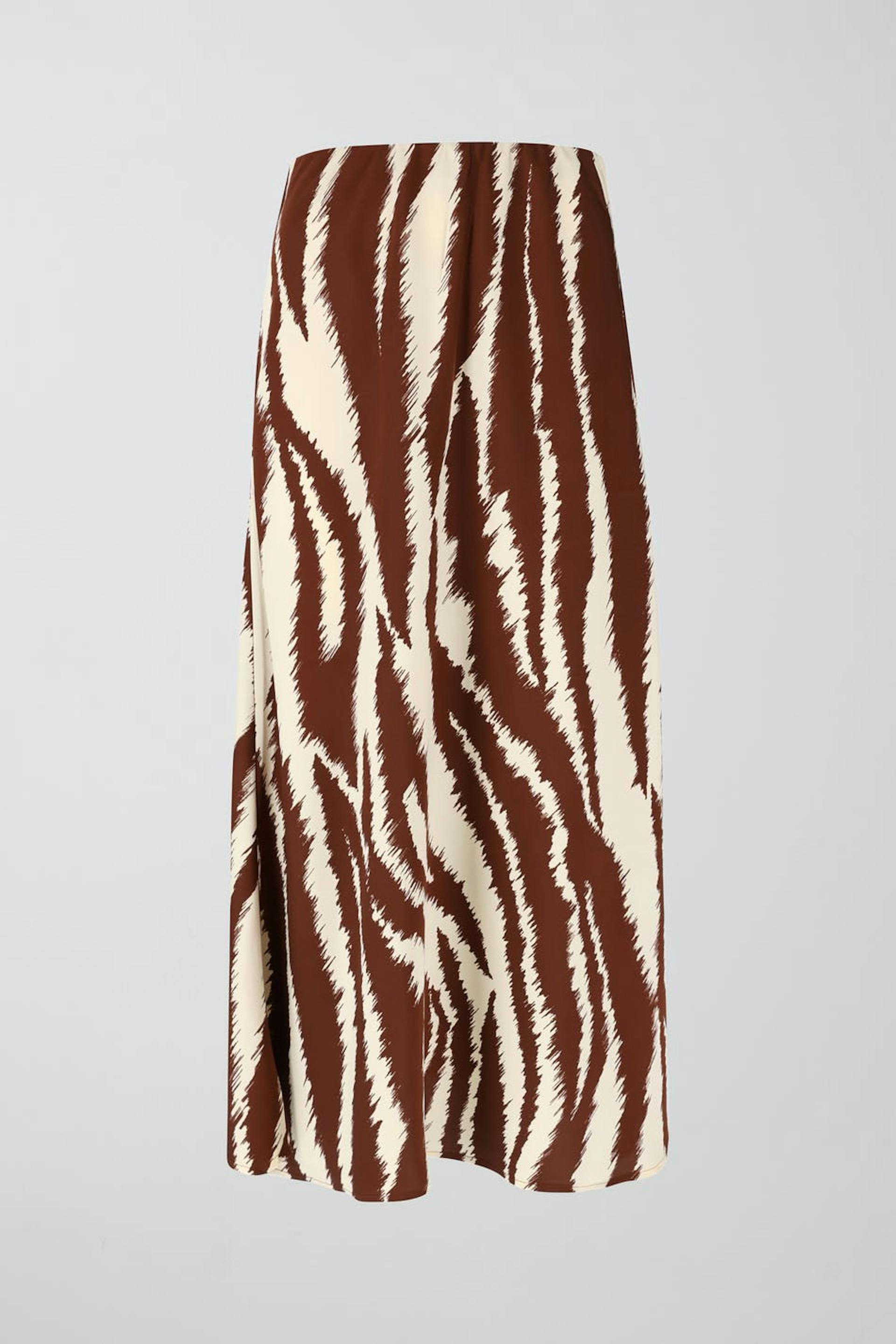 Zebra-gemusterter Satinrock mit geradem Schnitt. Der Rock hat Gummiband in der Taille. Er hat matte Qualität und eine Midi-Länge.