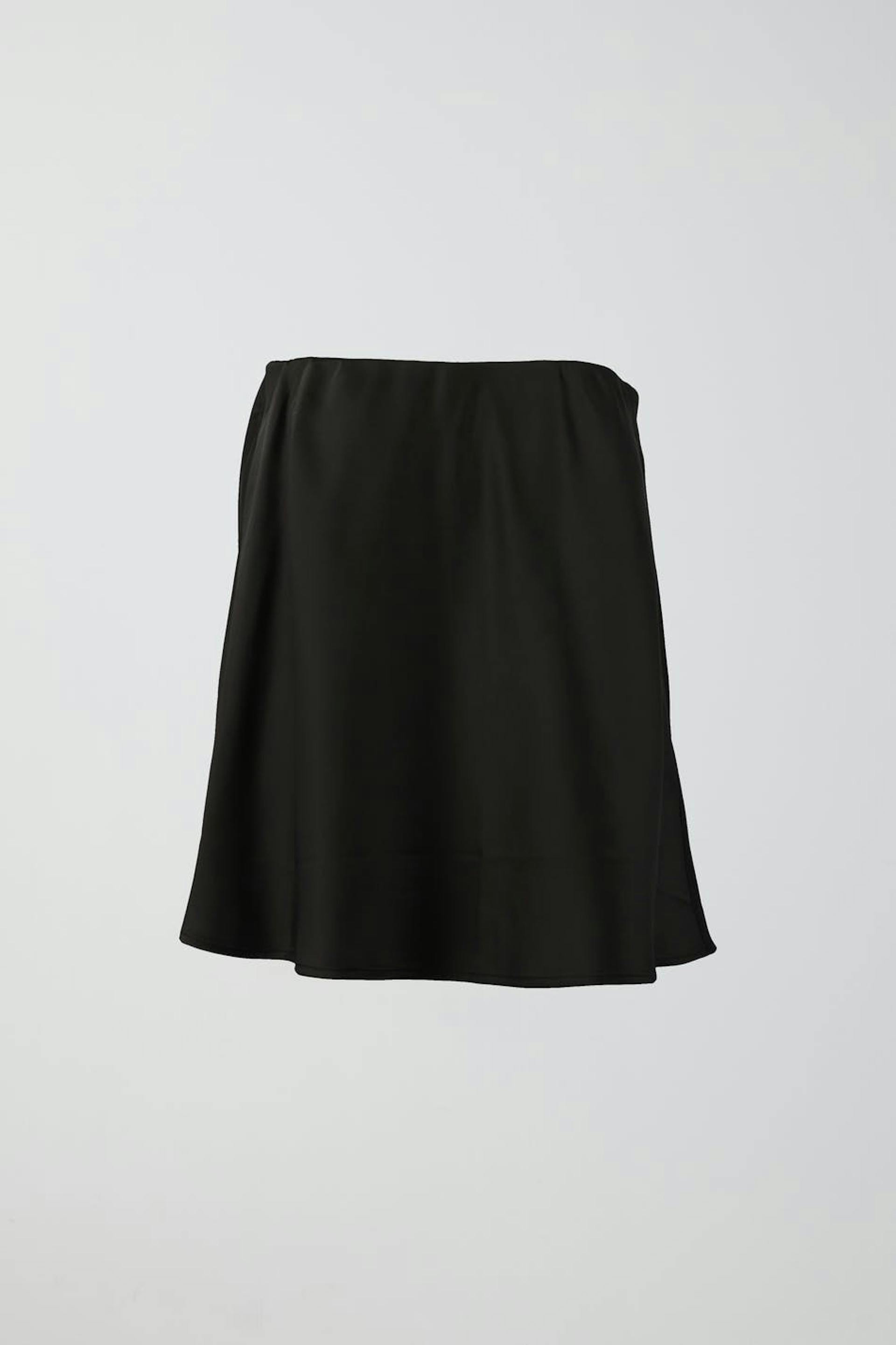 Kurzer Satinrock mit Gummiband in der Taille. Der Rock ist schwarz.