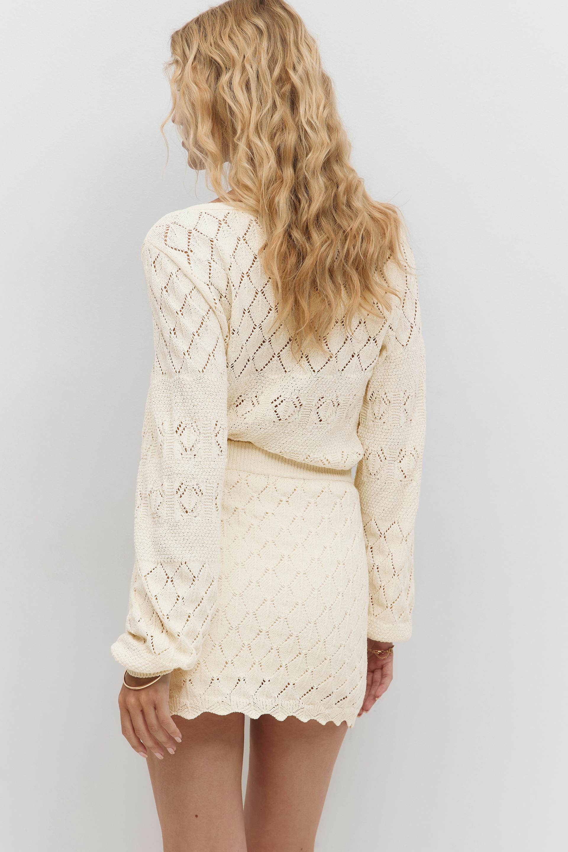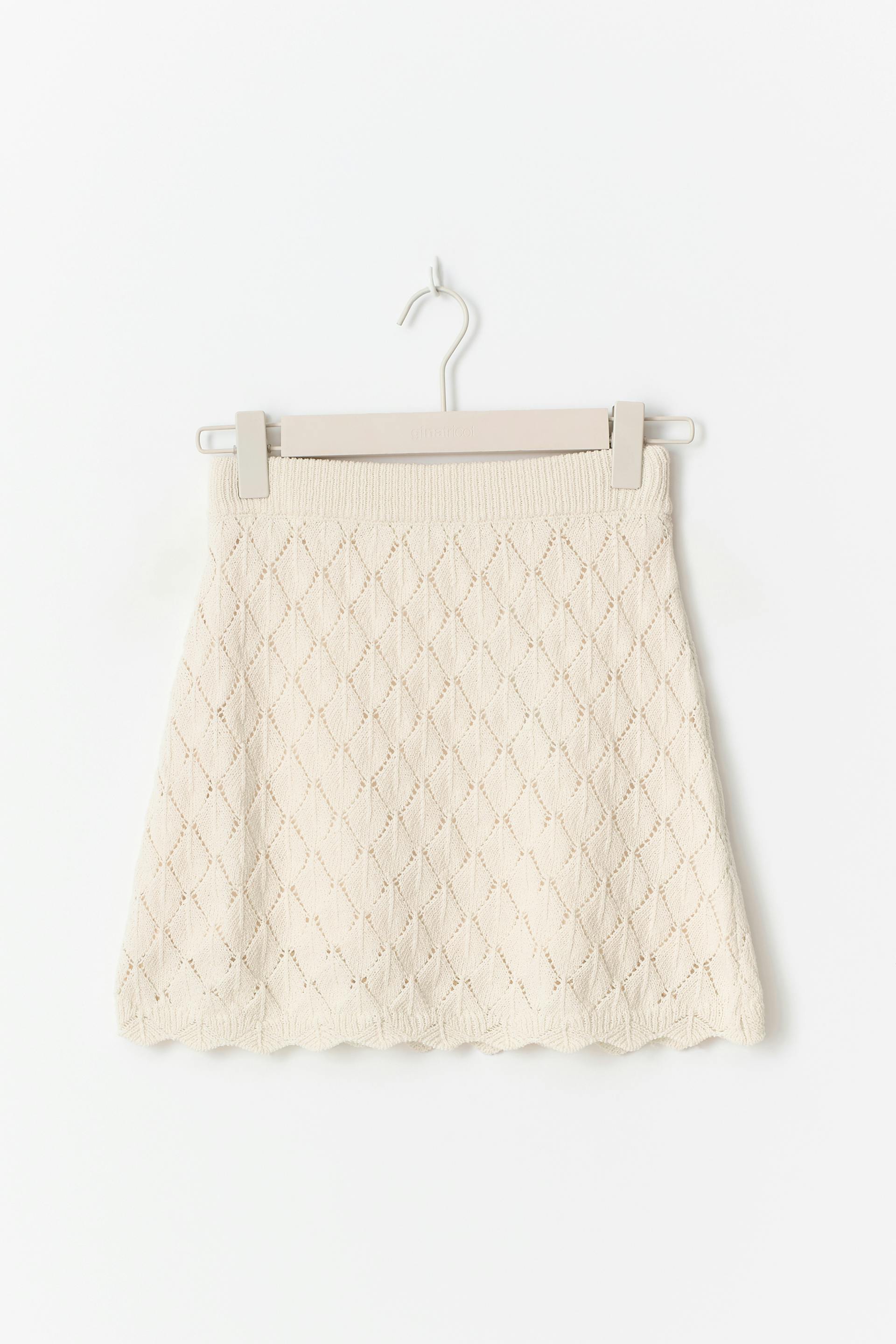 Gehäkelter Rock mit kurzer Länge. Der Rock ist weiβ und hat normale Passform. Er hat gerippten elastischen Bund, wellige Kante unten und Futter.