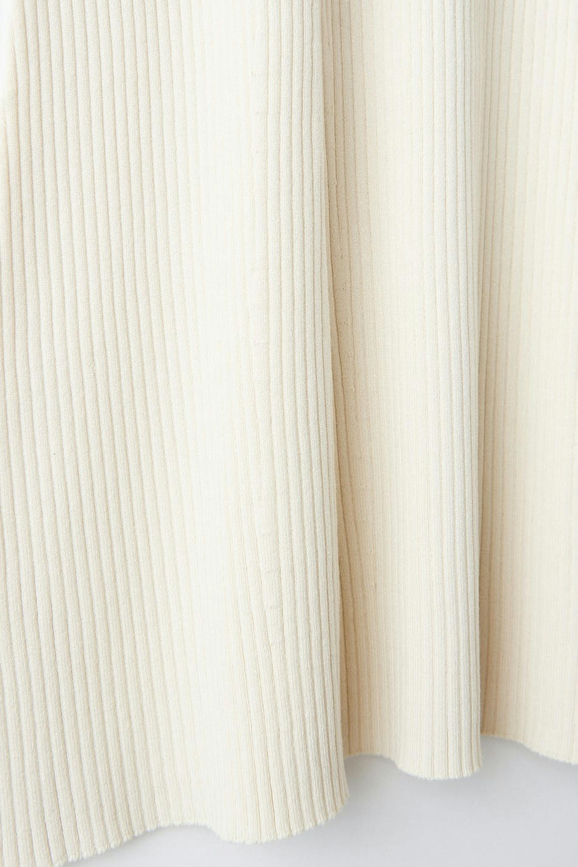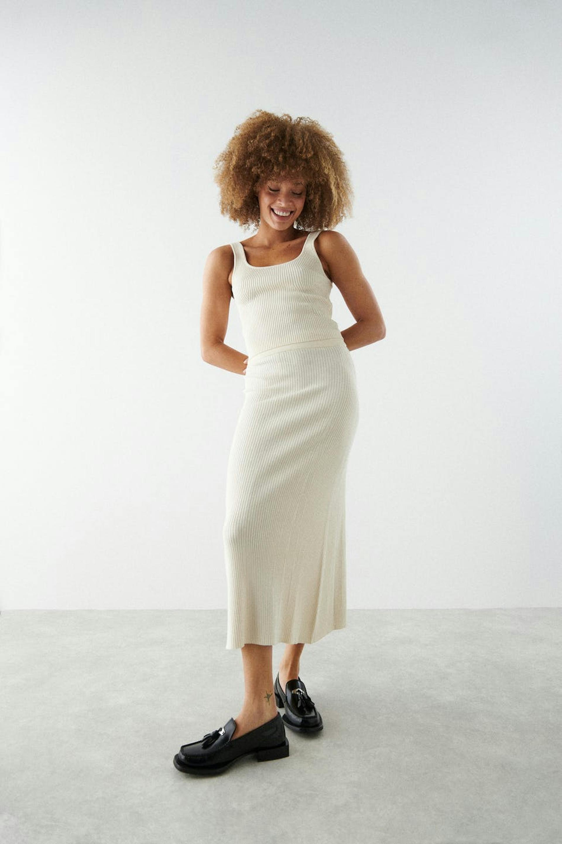 Langer Rock aus Viskose von EcoVero™ mit einer gerippten Qualität. Der Rock ist weiβ, ausgestellt und gestrickt. Er hat ein Gummiband in der Taille und eine Midi-Länge.
