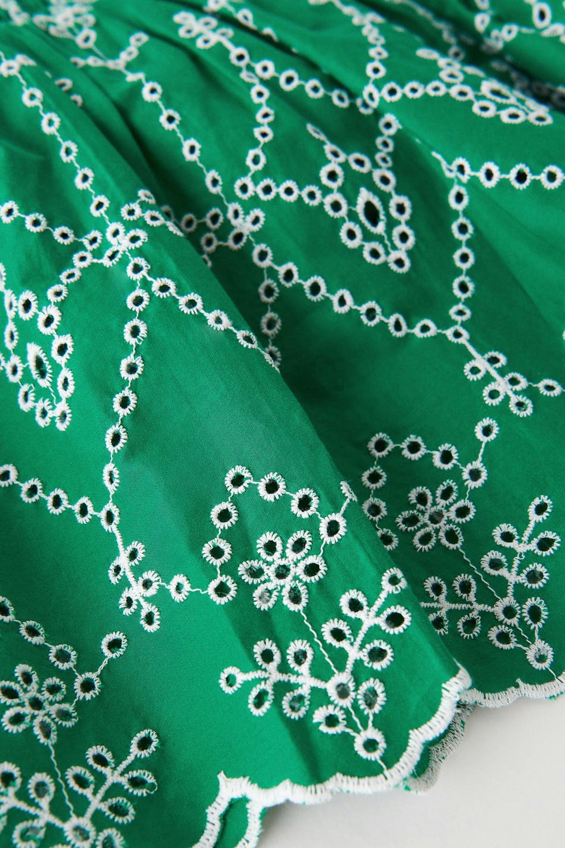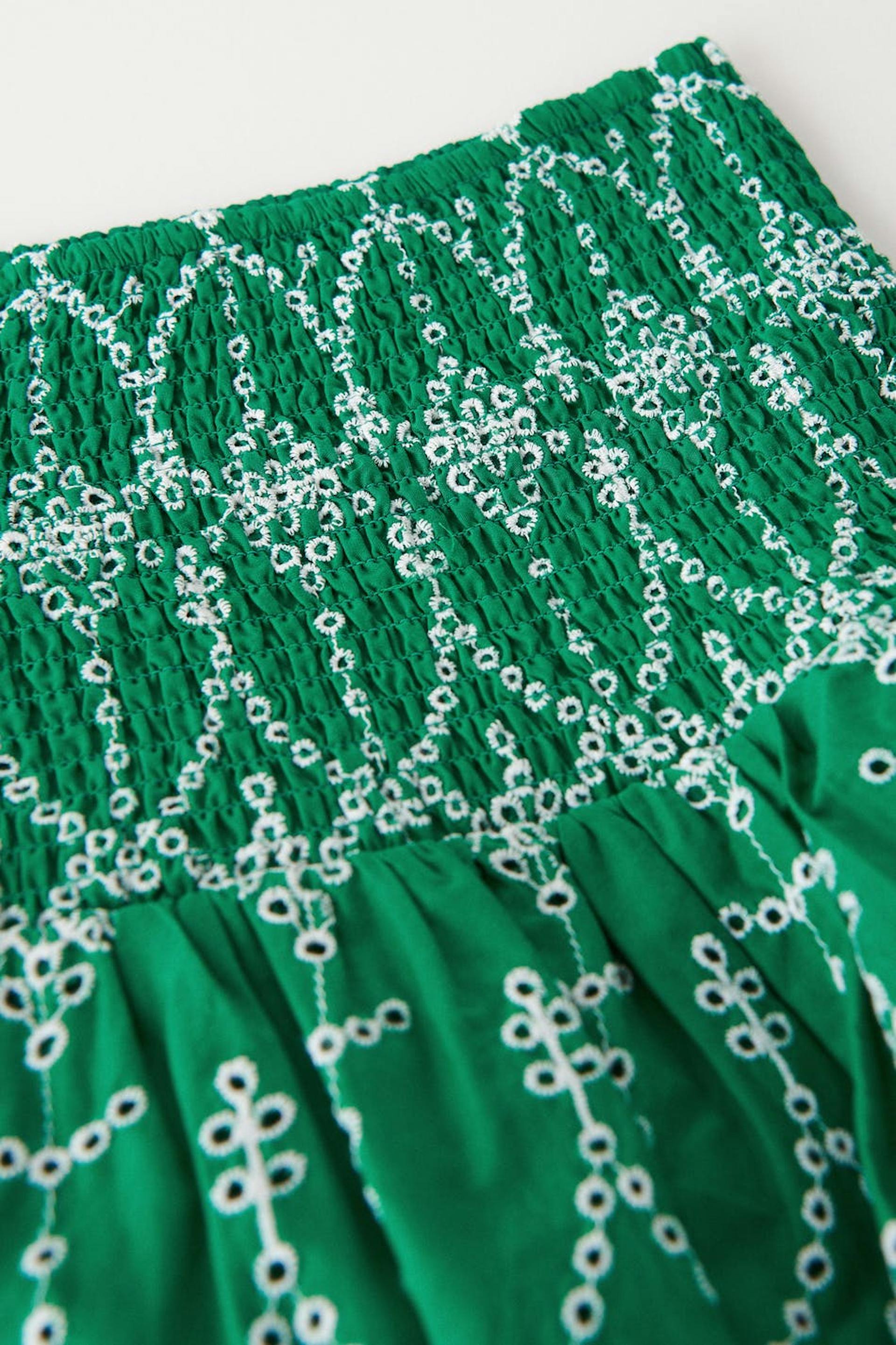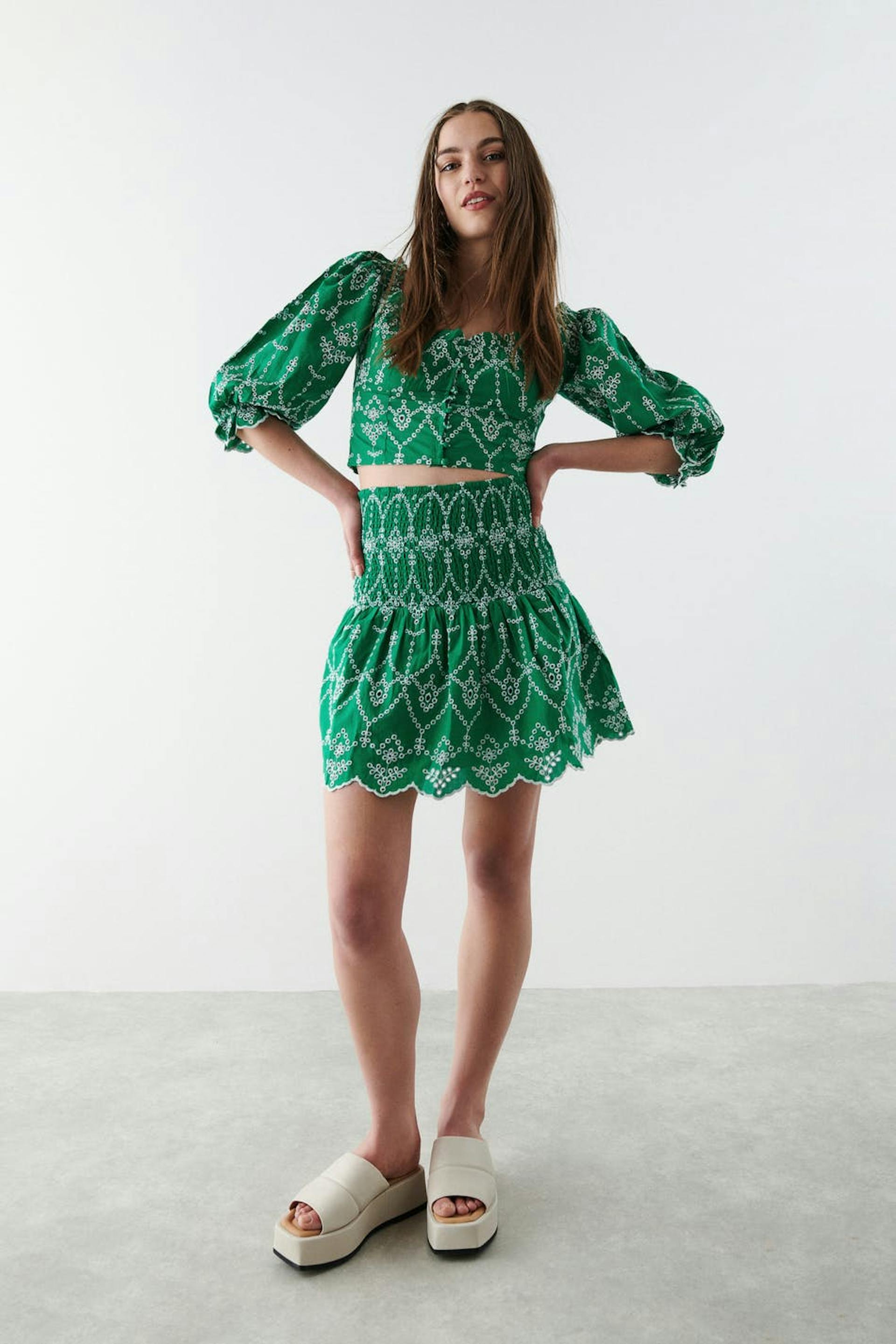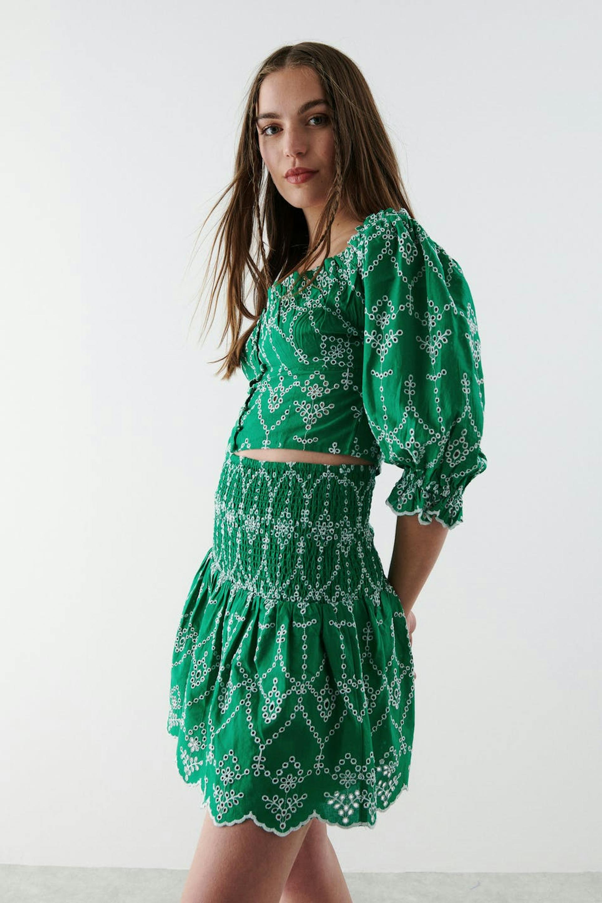 Kurzer Rock mit gesmokter Taille. Der Rock ist grün und hat Lochstickerei. Er hat ein voluminöses Design und Rüschen-Details unten.