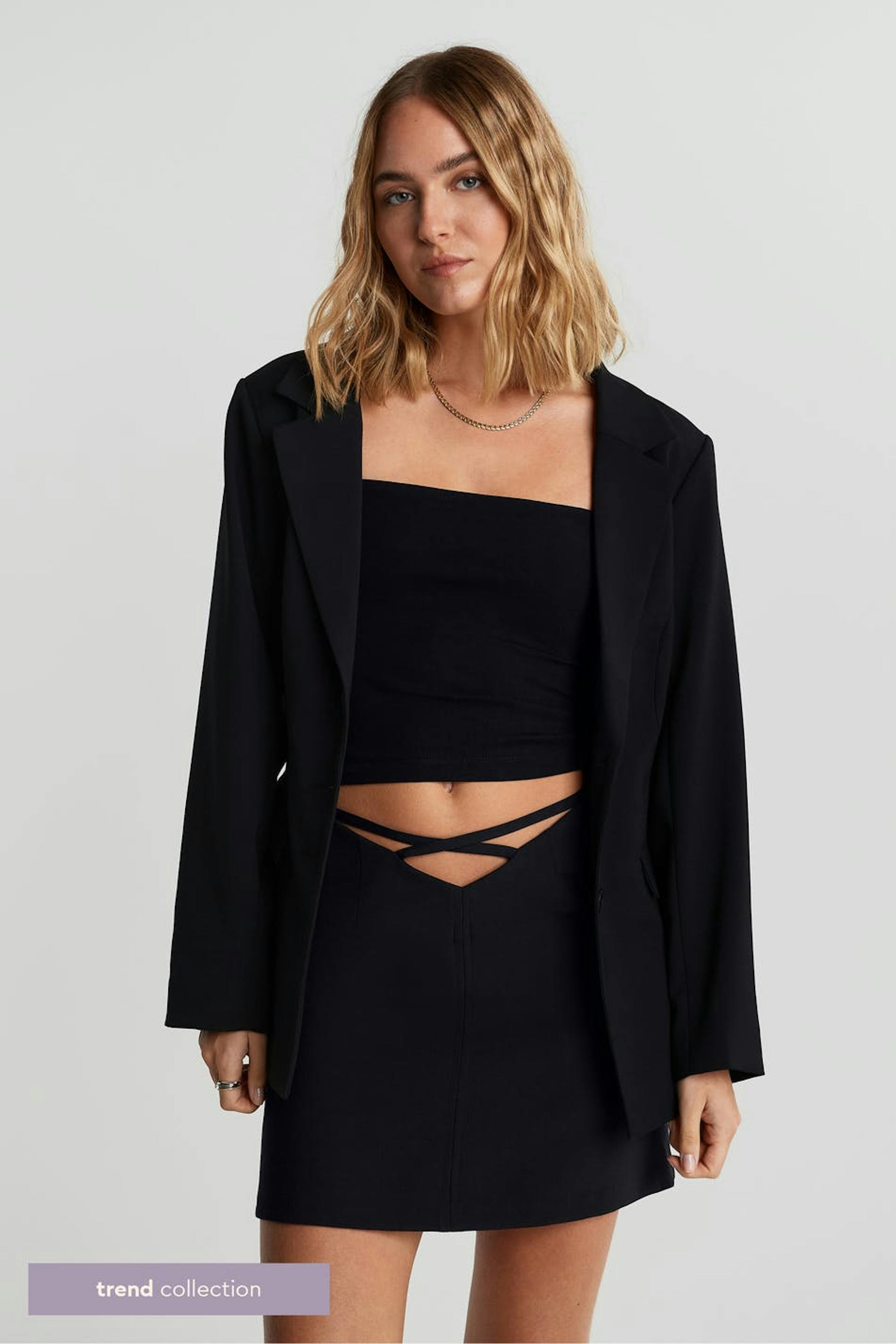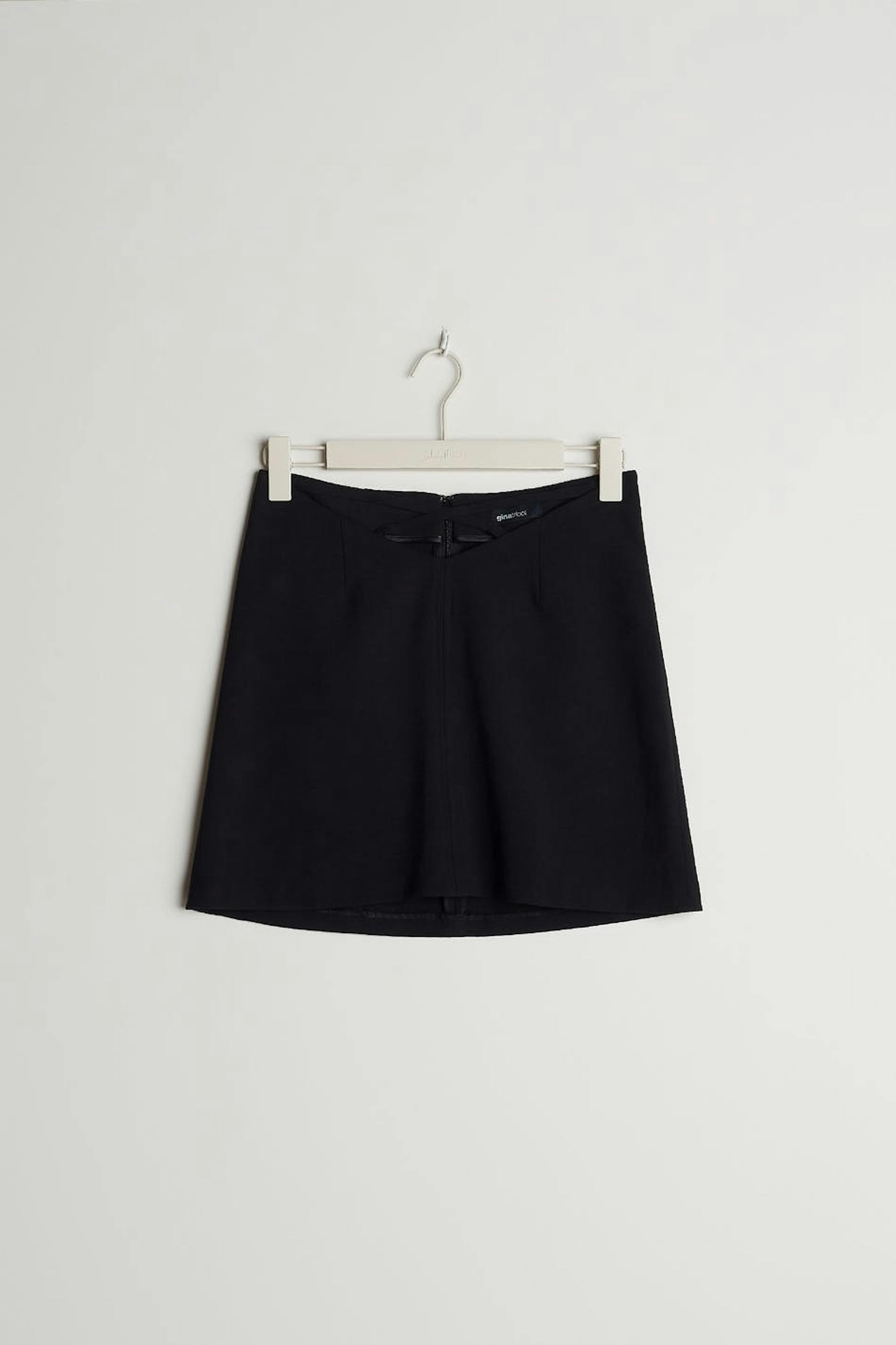 Kurzer Rock mit einer Taille mit einem ausgeschnitten Detail mit durchgekreuzten Bändern. Der Rock ist schwarz.