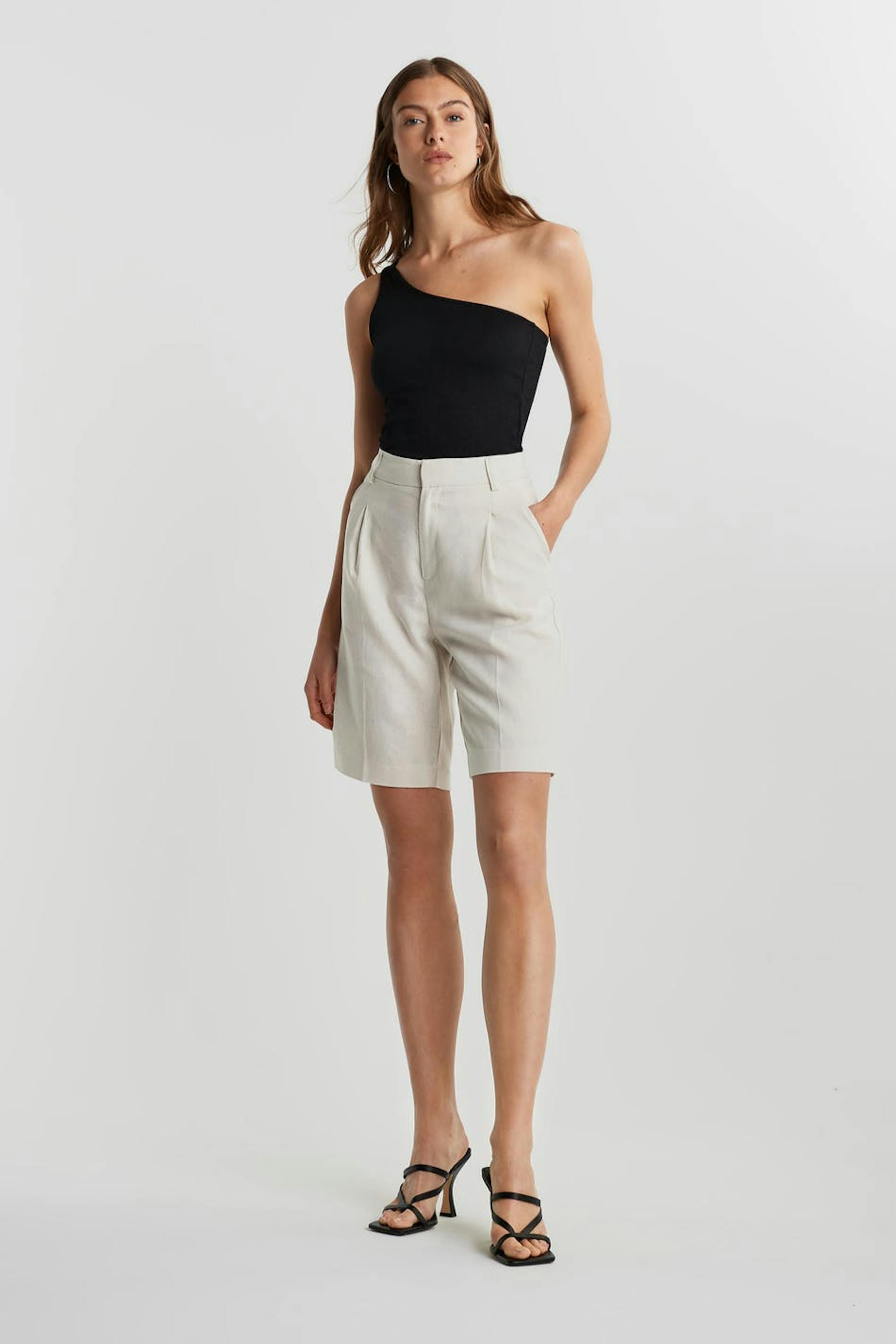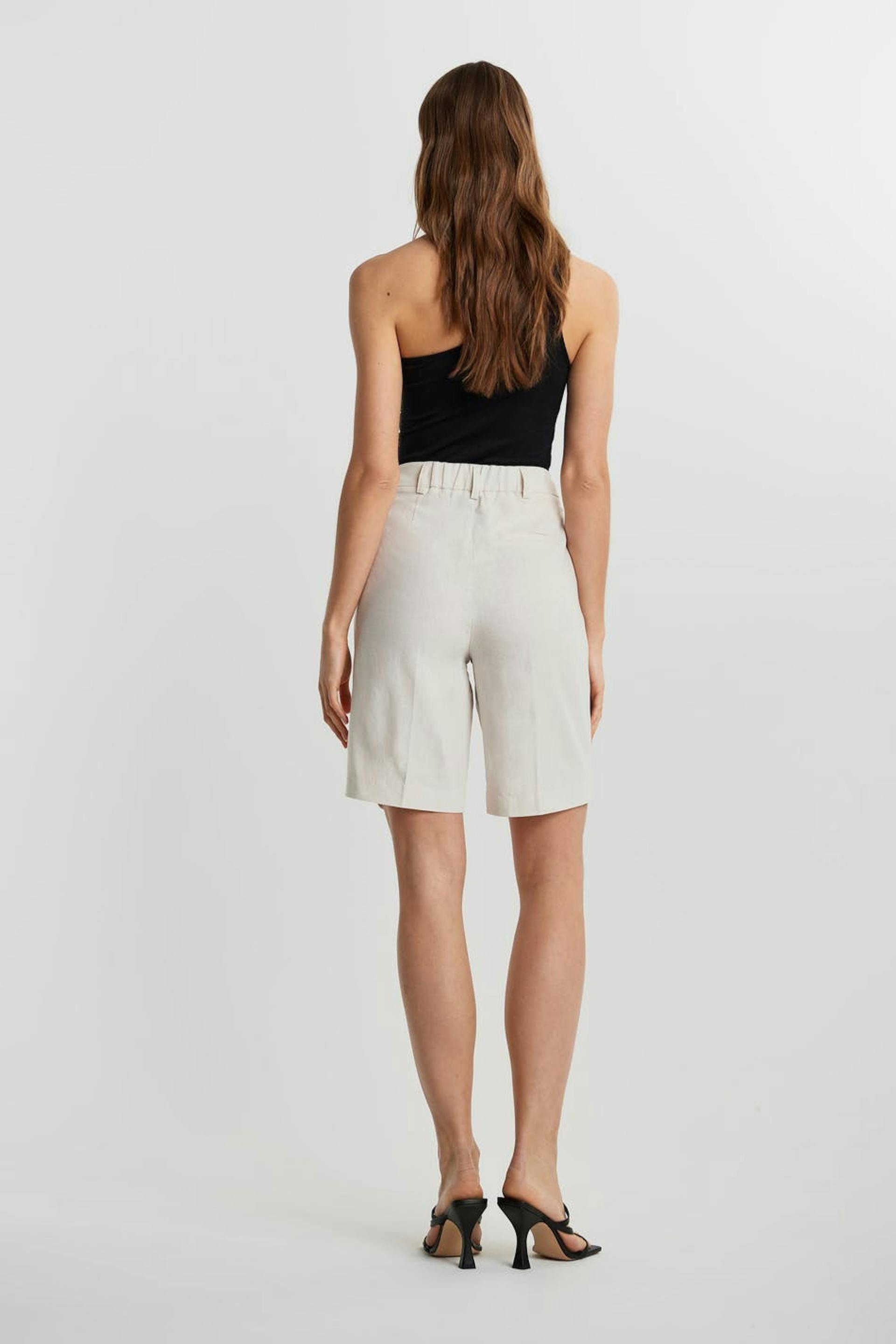 Bermudashorts mit einem weit-geschnittenen Style. Die Shorts sind beige und haben Falten vorne. Sie haben einen elastischen Gurt hinten.