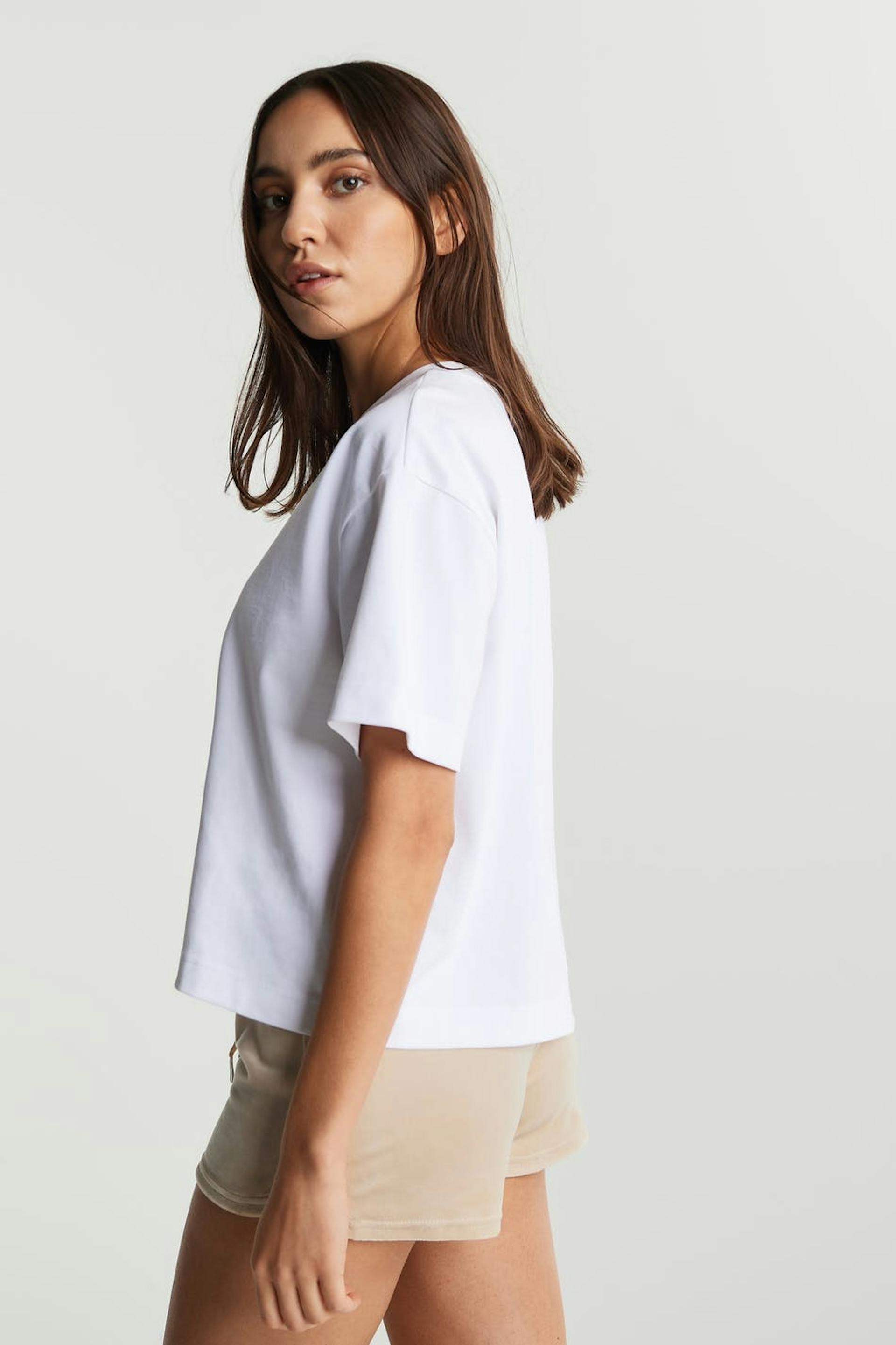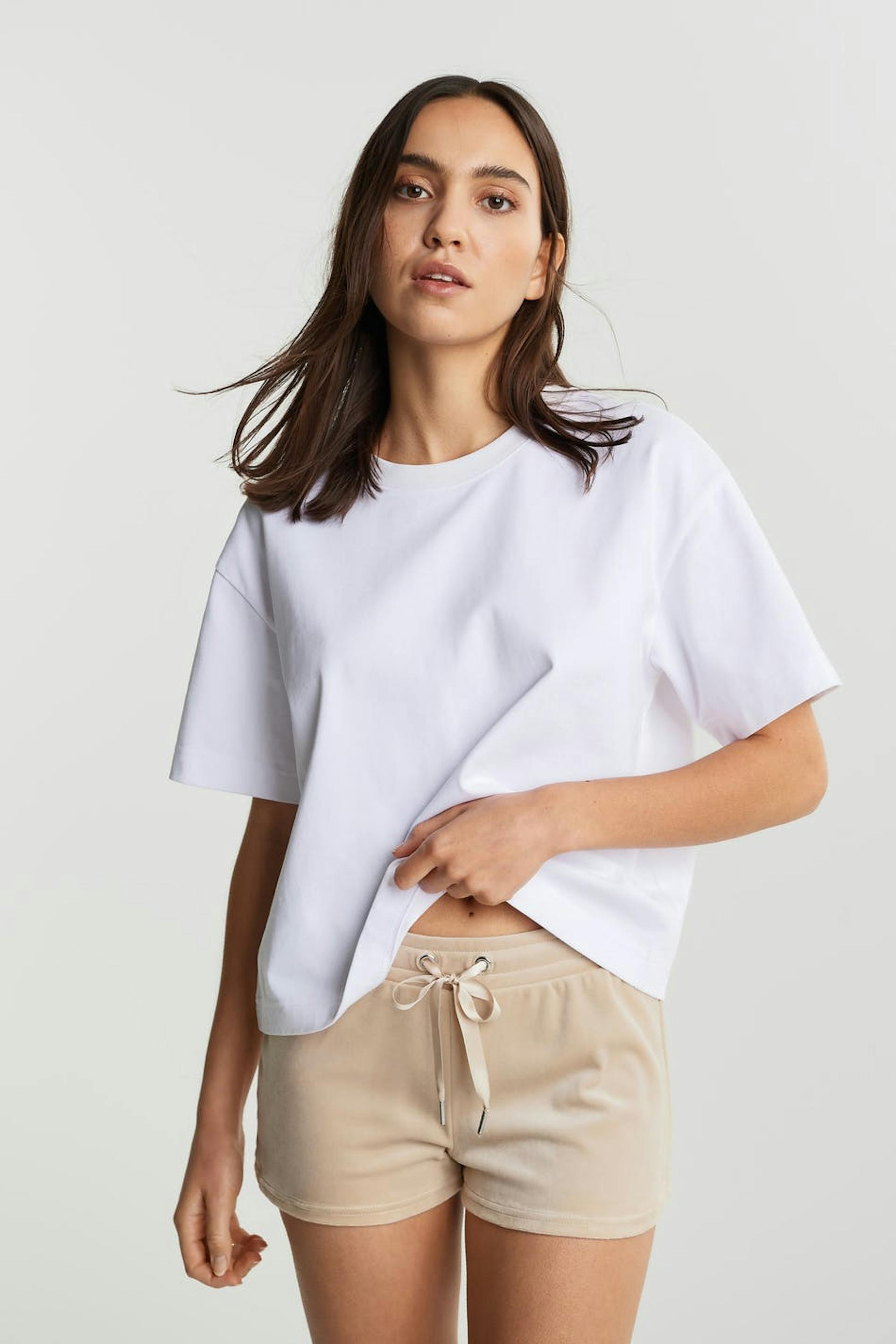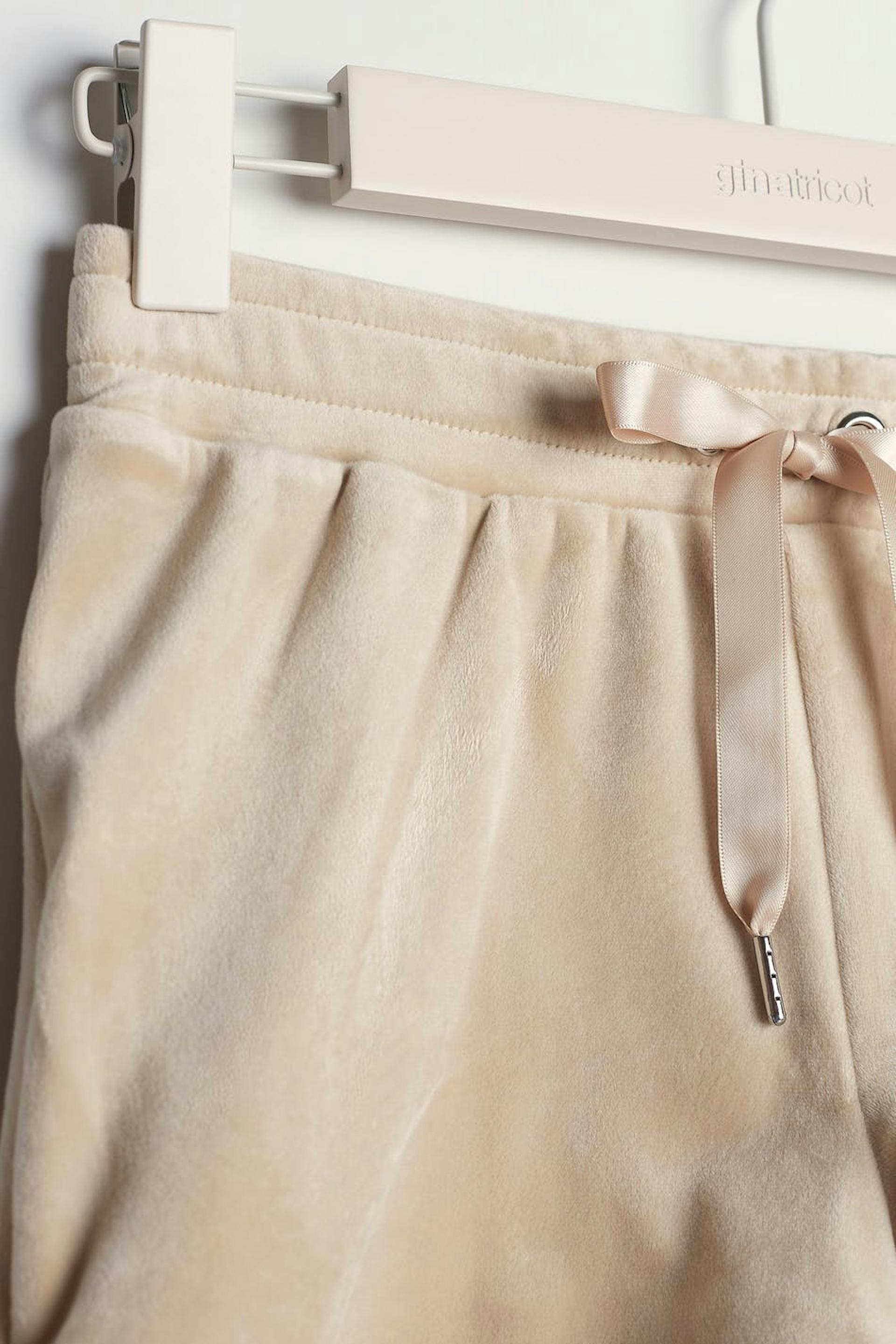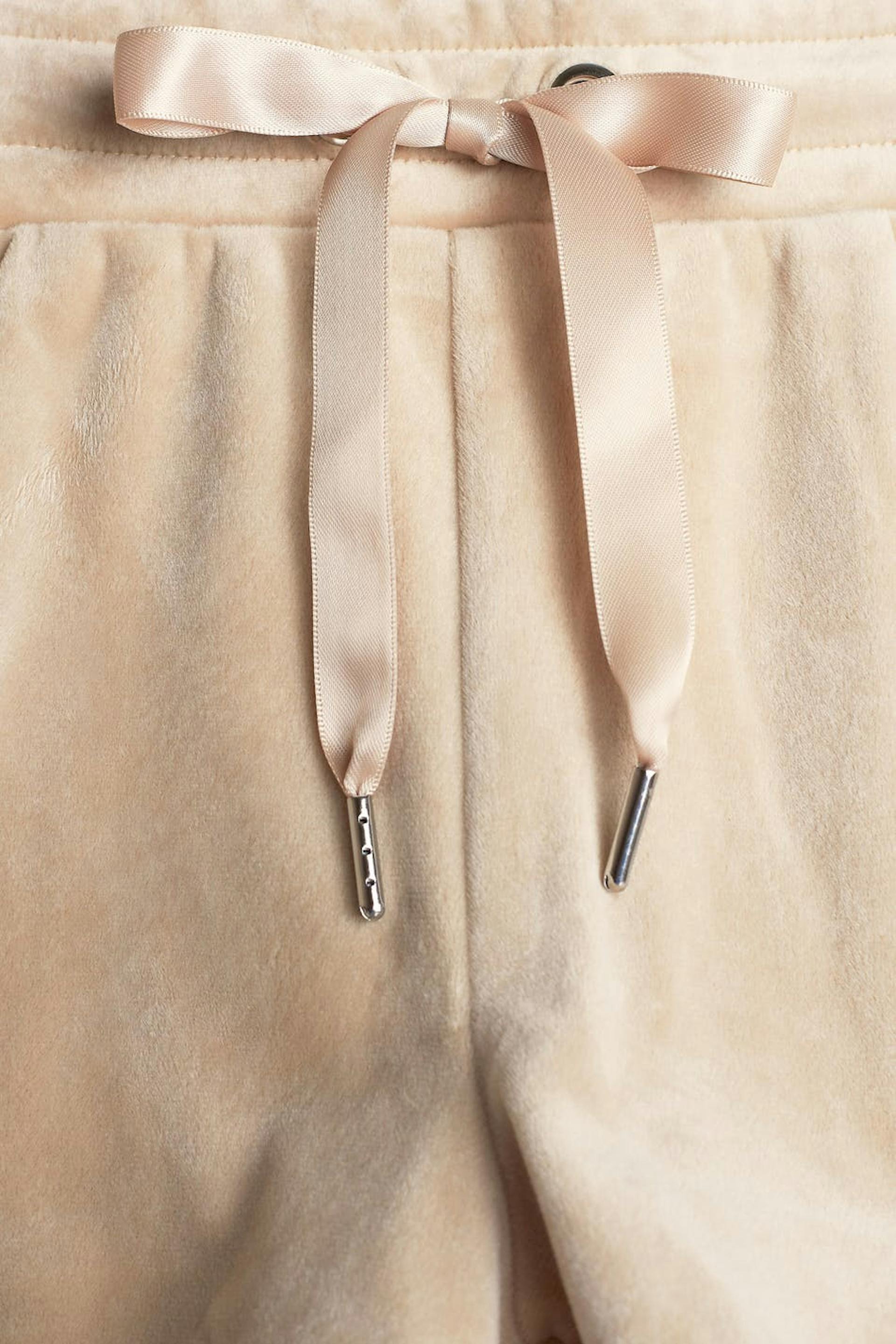 Kurze Shorts mit einem geraden Schnitt. Die Shorts sind beige und haben einen elastischen Bund mit einem Kordelzug aus Satin. Sie sind hergestellt aus Velours. Von Feuerquellen fernhalten.