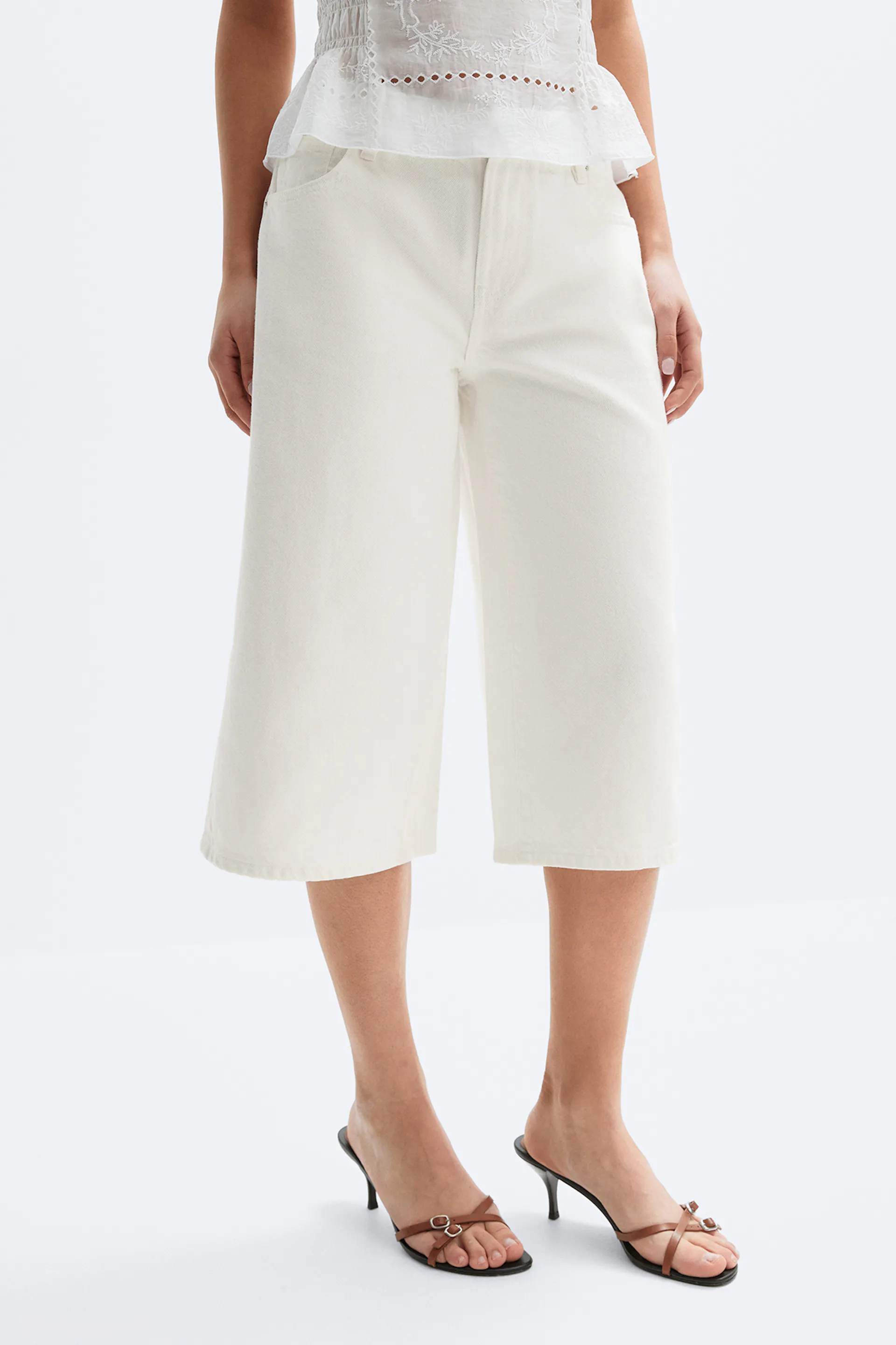 Weiße bestickte Ösenbluse mit Flatterärmeln, Schlüssellochausschnitt zum Binden und gesmokter Taille, kombiniert mit einer cremefarbenen Hose mit weitem Bein und braunen Pantoletten mit Riemchenabsätzen.
