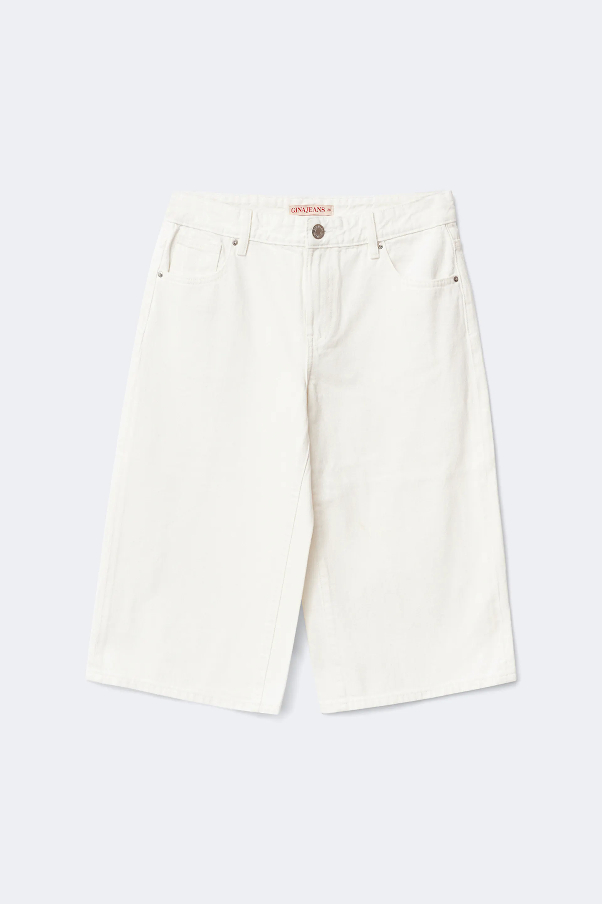 Denim-Shorts mit einer Knielänge und mittlerer Taille. Die Shorts sind off-white und haben weite Passform. Sie haben Taschen vorne und hinten, Reißverschluss, Knopfverschluss und Gürtelschlaufen. Nicht dehnbar. Benutze unsere Größentabelle, um deine Größe zu finden.