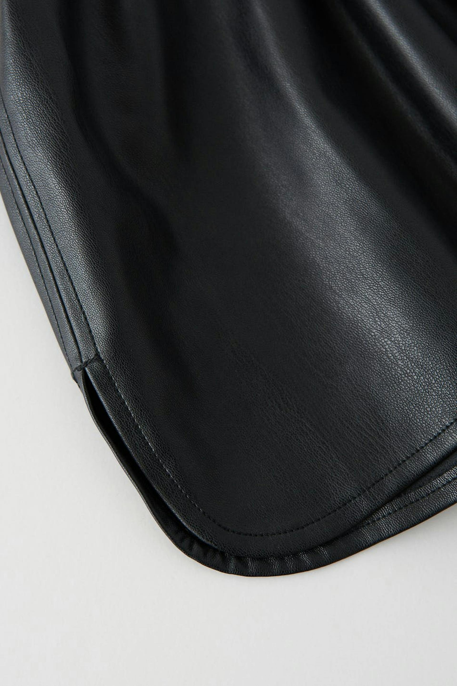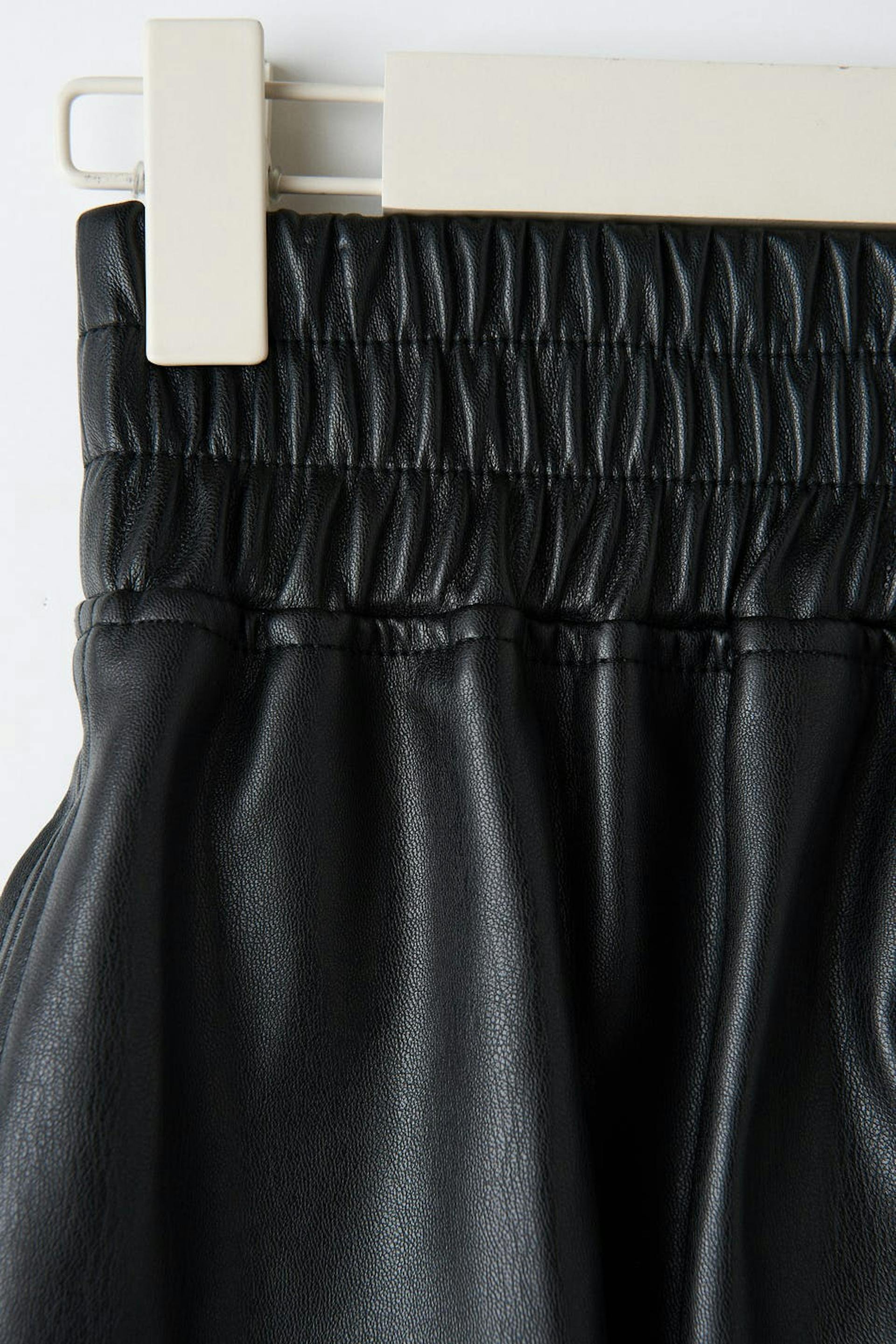 Lockere Shorts aus PU mit Taschen. Die Shorts sind schwarz und haben einen elastischen Bund mit Schlitzen auf den Seiten.
