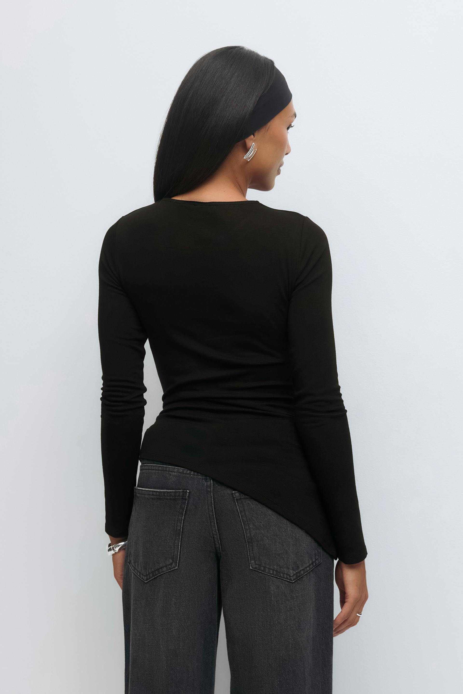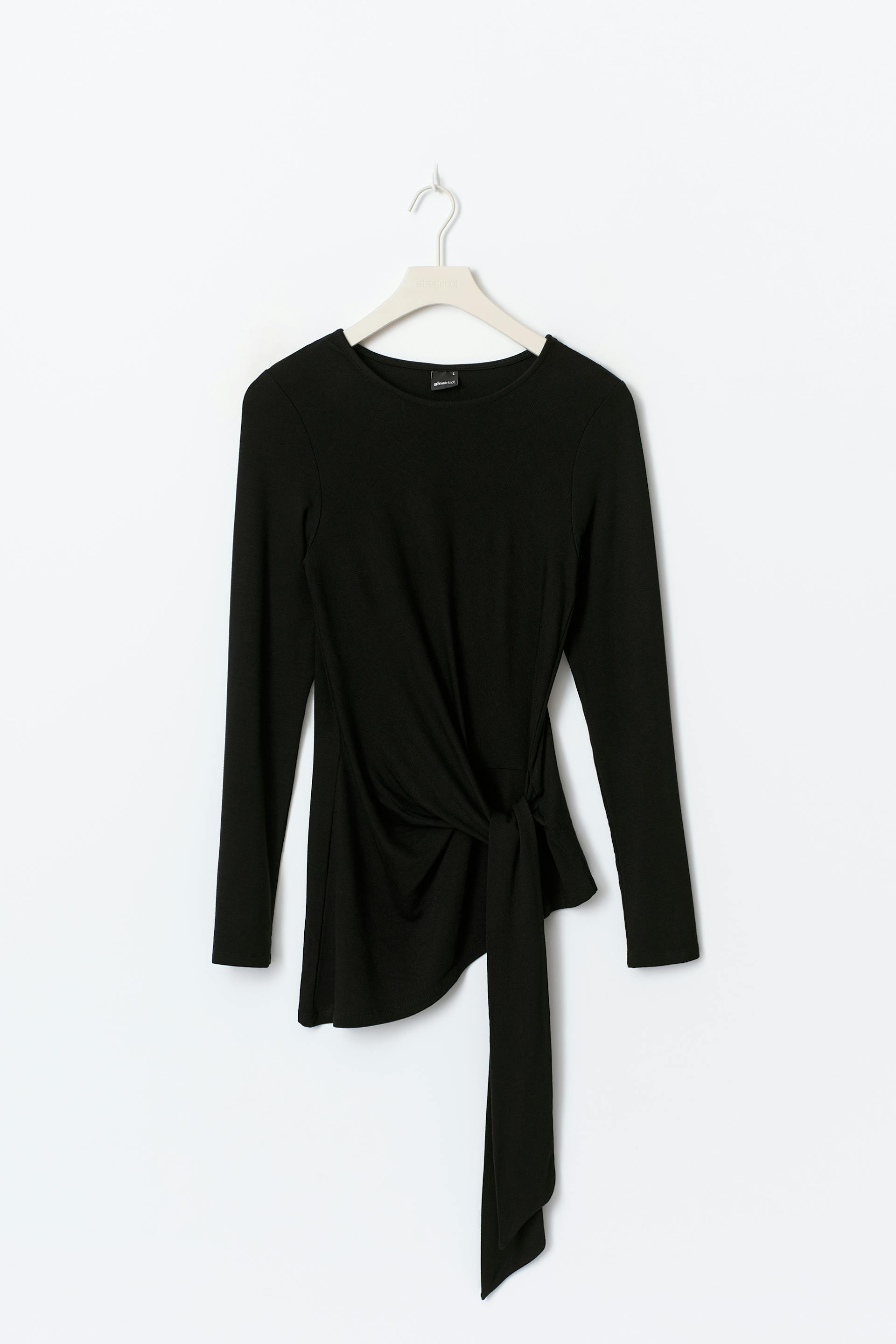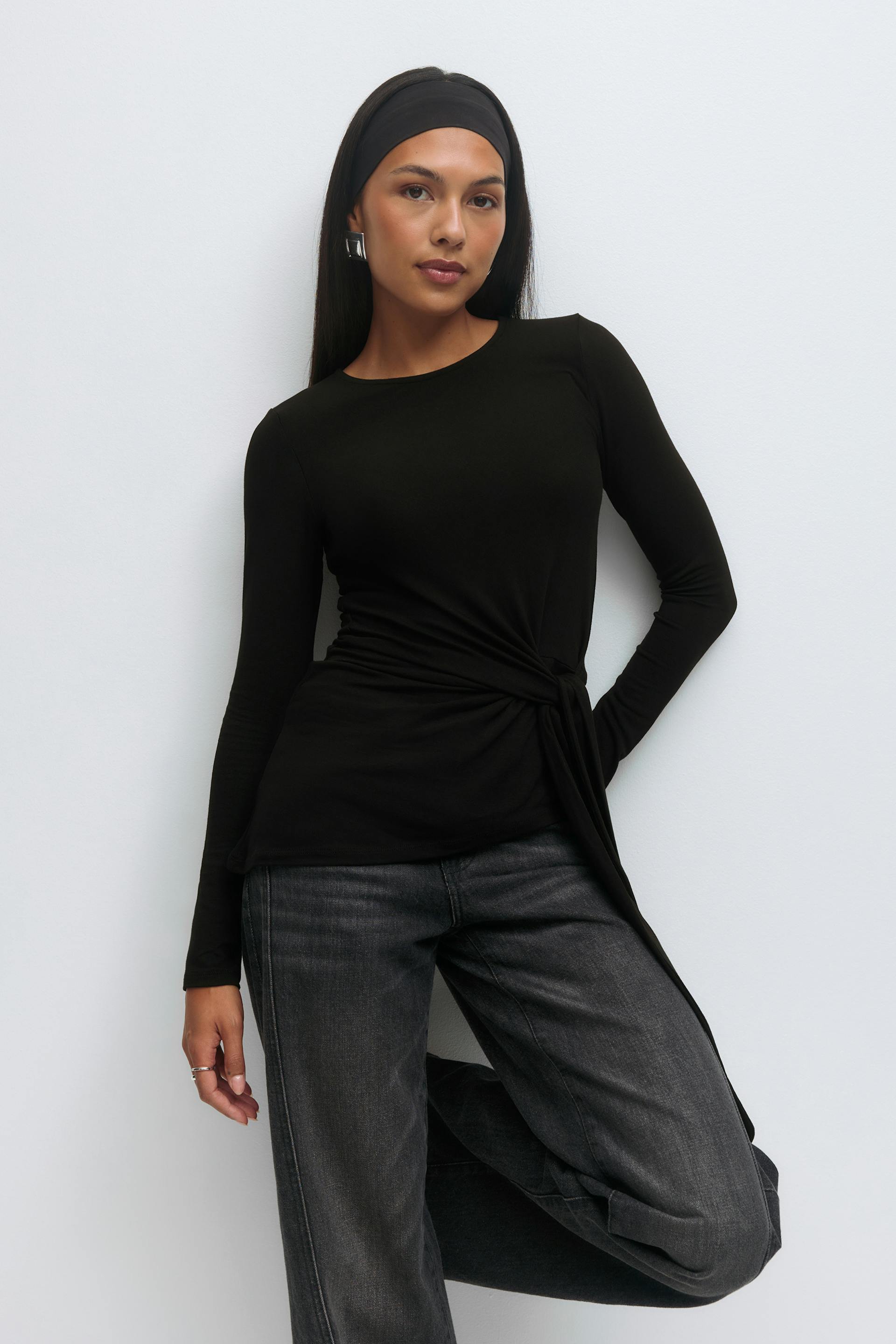 Asymmetrisches Oberteil mit Knoten-Detail an der Seite. Das Oberteil ist schwarz und hat elastisches Material. Es hat lange Ärmel, Rundhalsausschnitt und normale Passform.