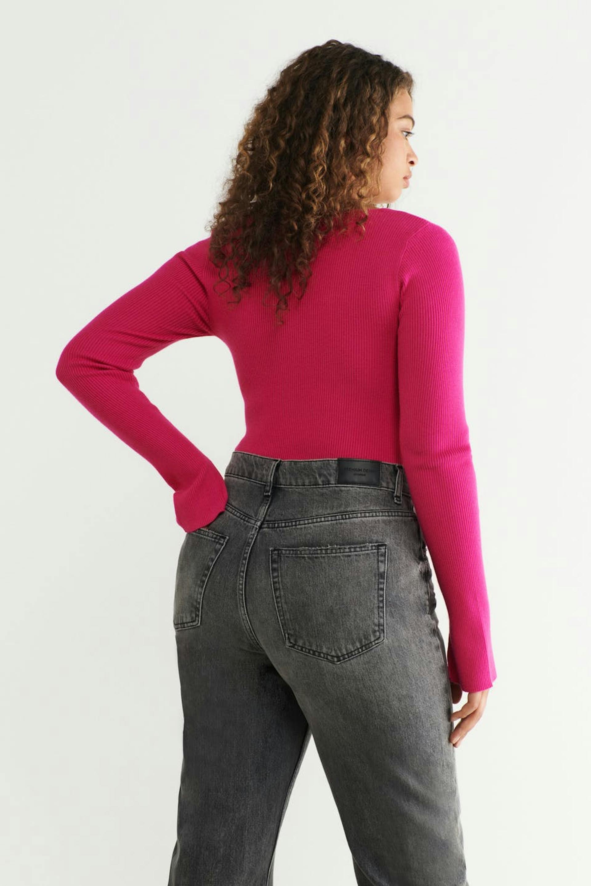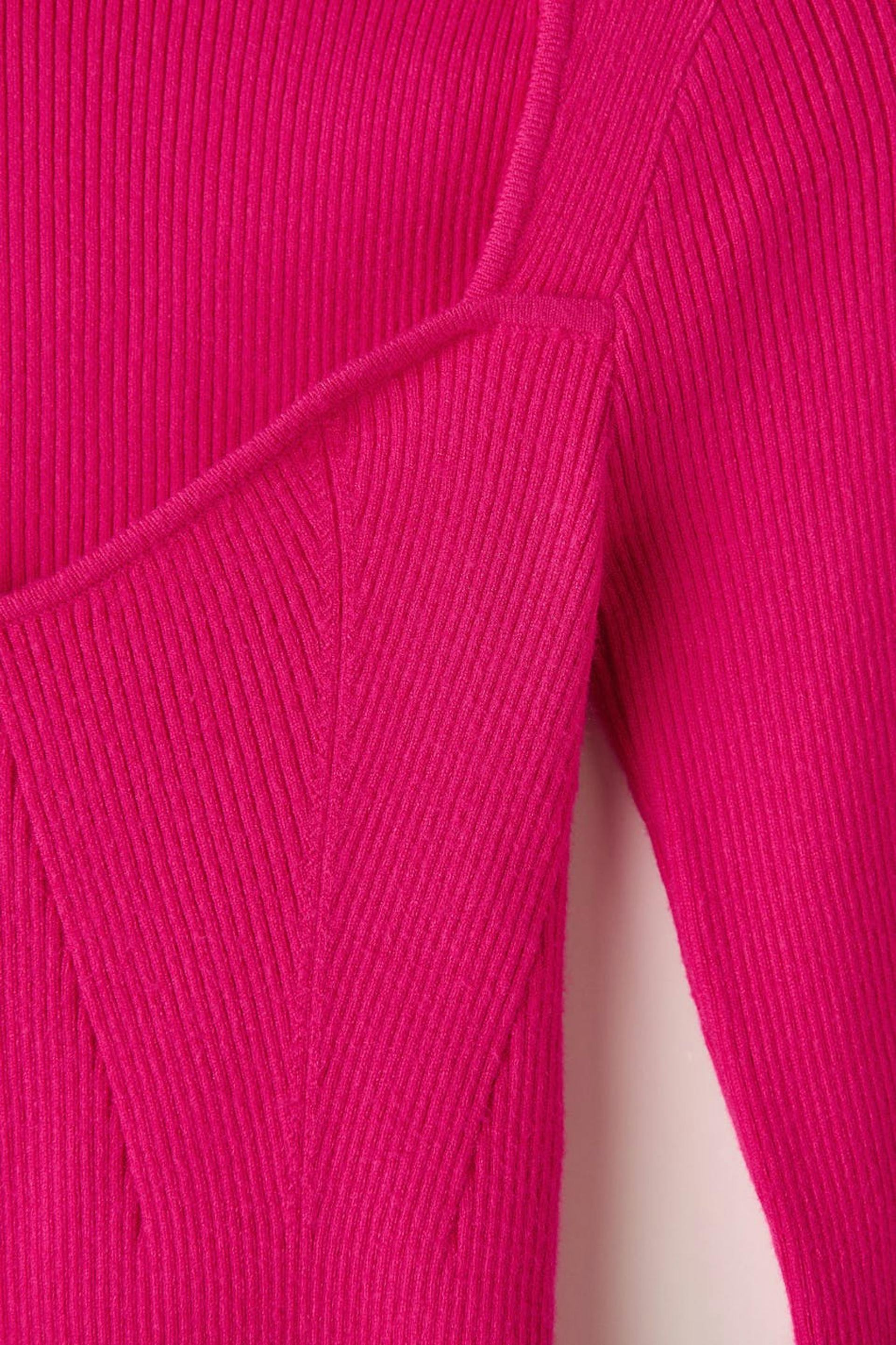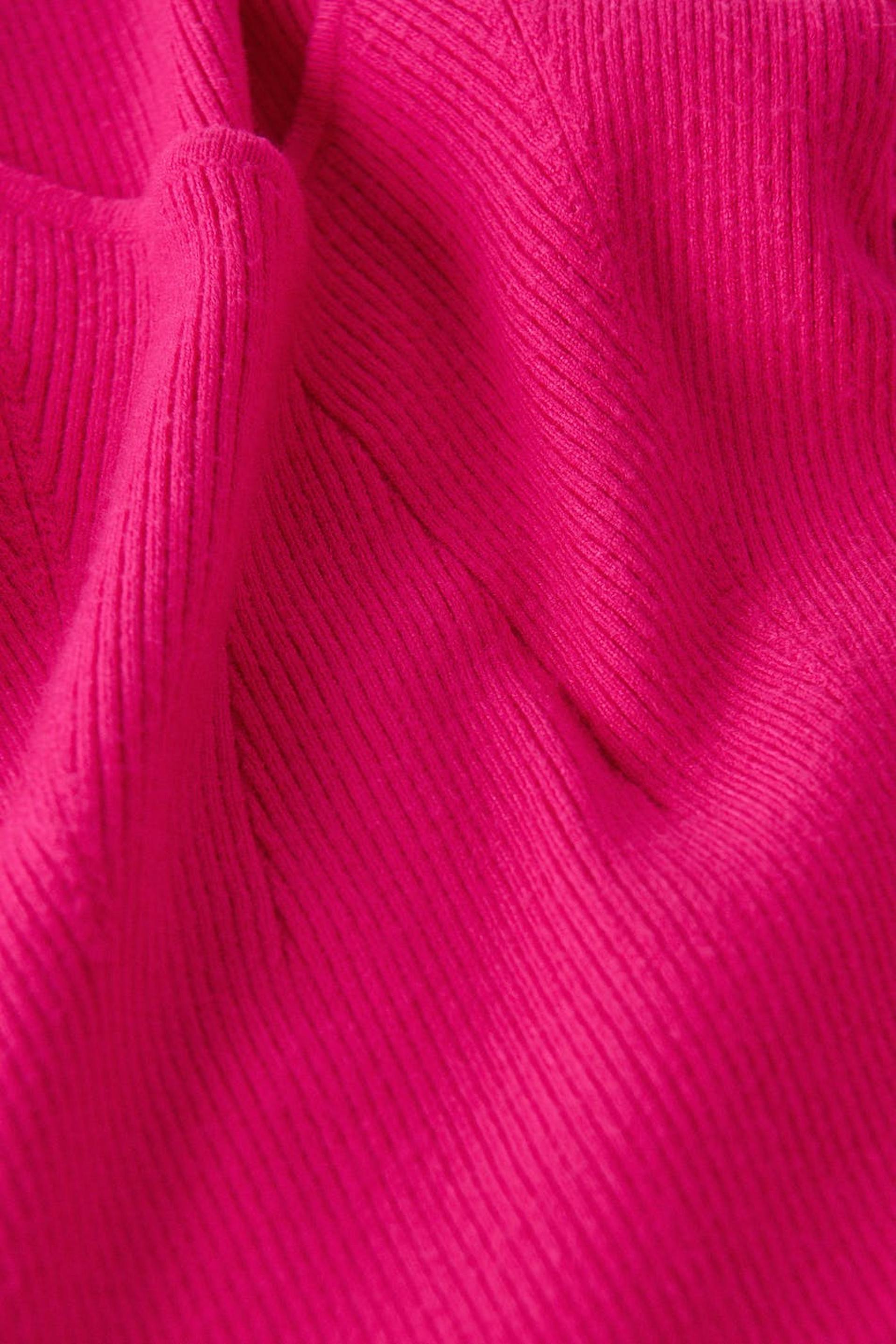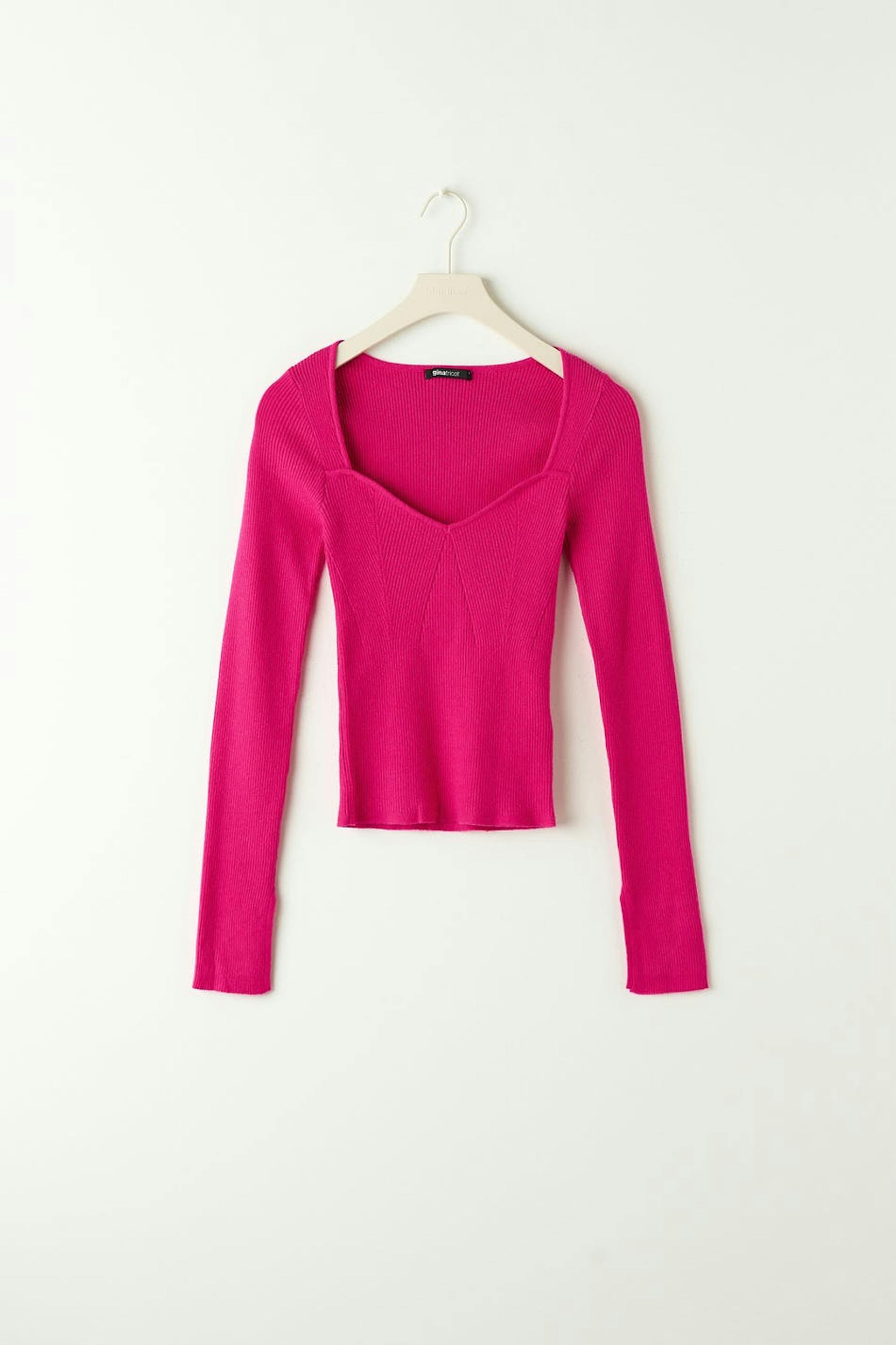 Pullover im Rippenstrick mit Herzausschnitt. Der Pullover ist rosa und hat eine taillierte Passform mit gestalteten Teilen.