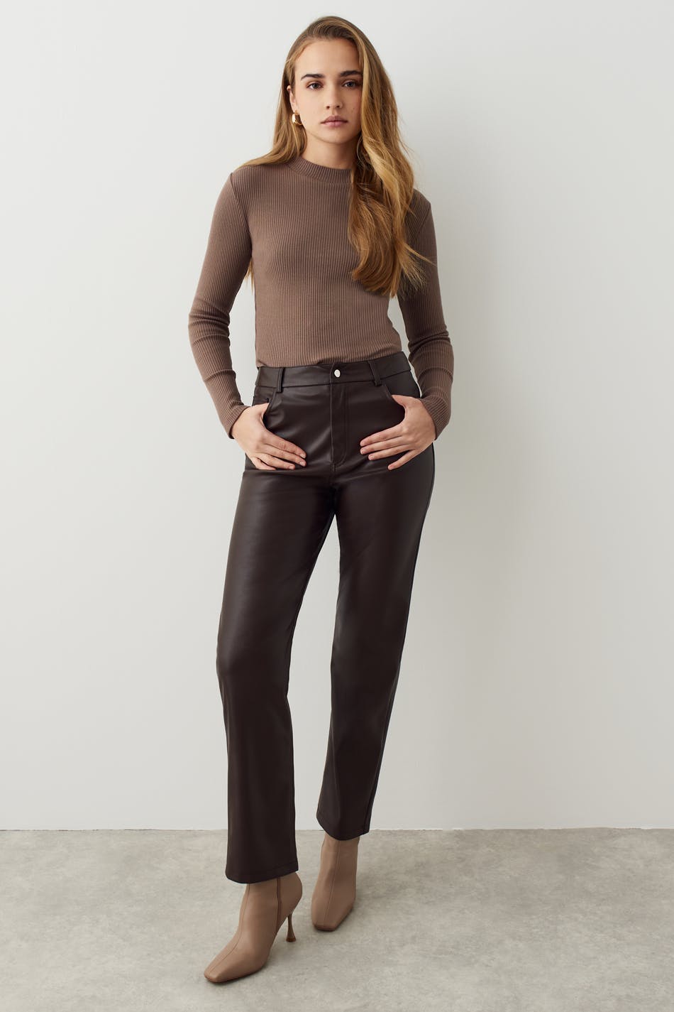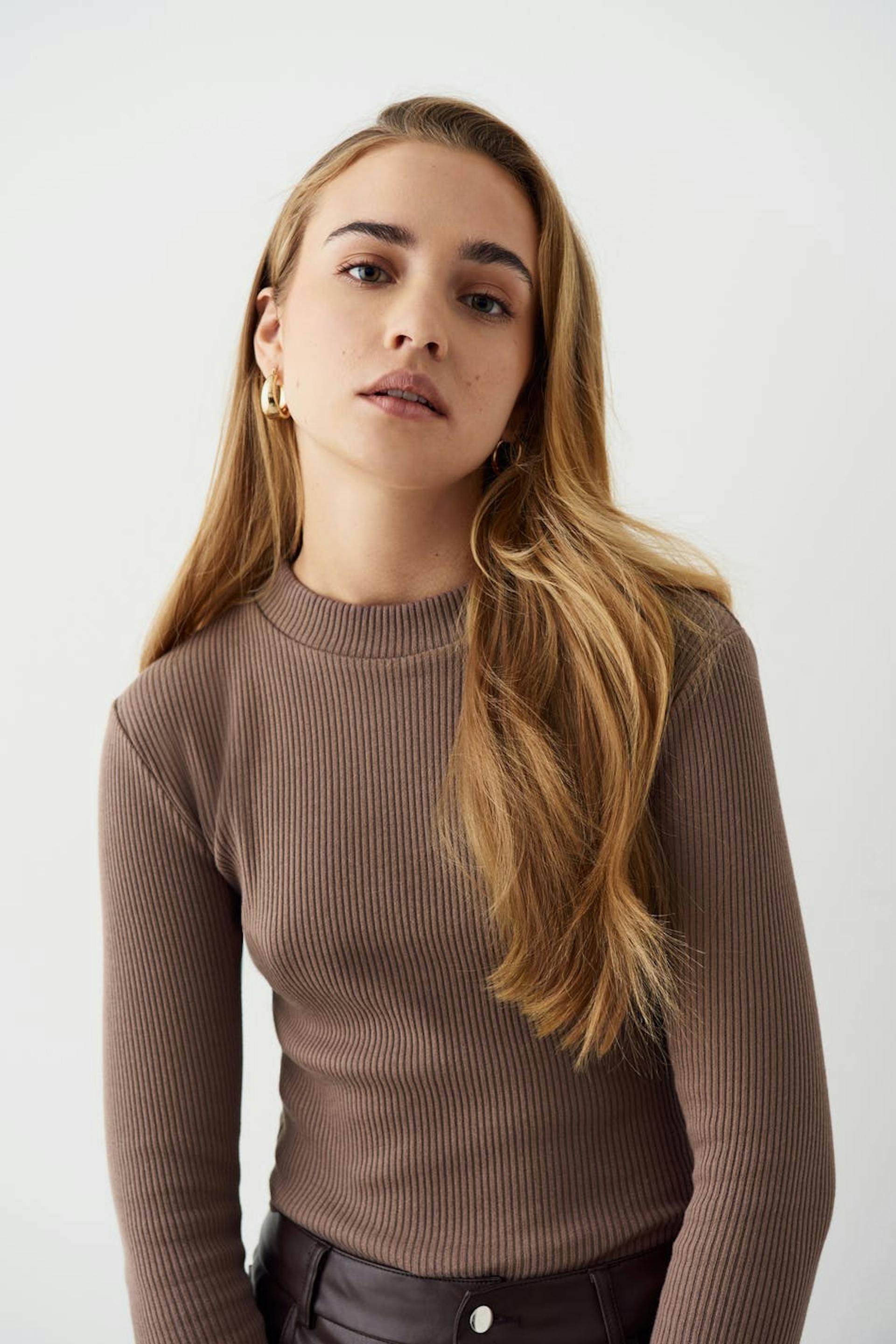 Langärmliges Oberteil aus Jersey mit halblangem Rollkragen. Das Oberteil ist beige und hat gerippte Qualität. Es hat figurbetonte Passform und abgerundeten Saum.