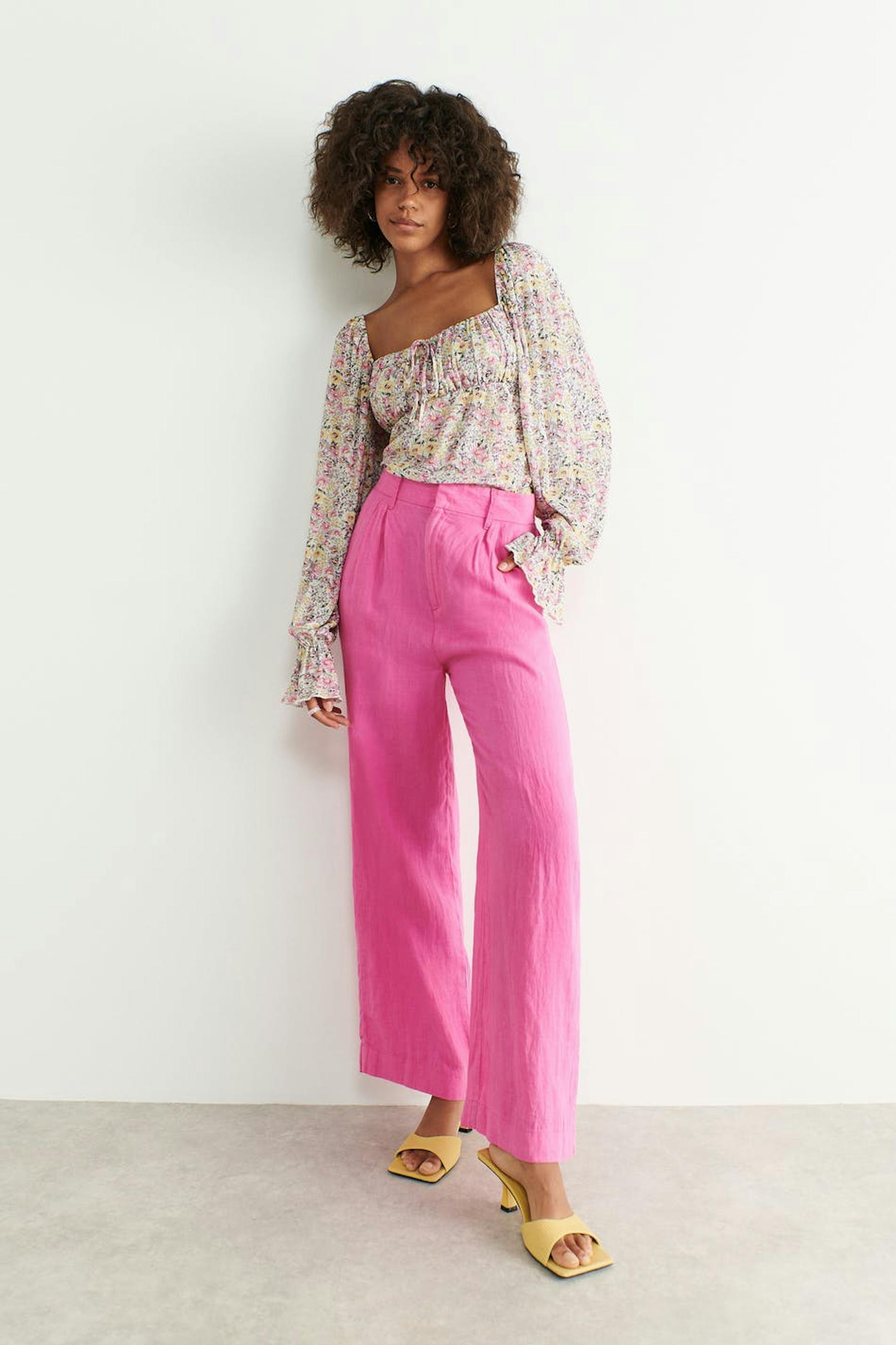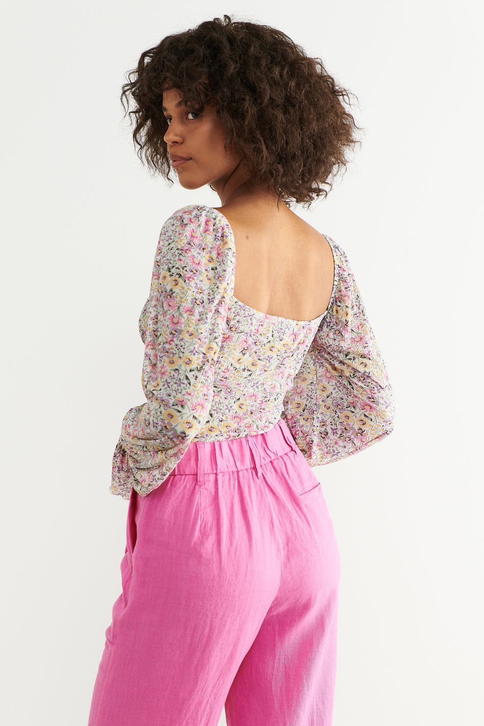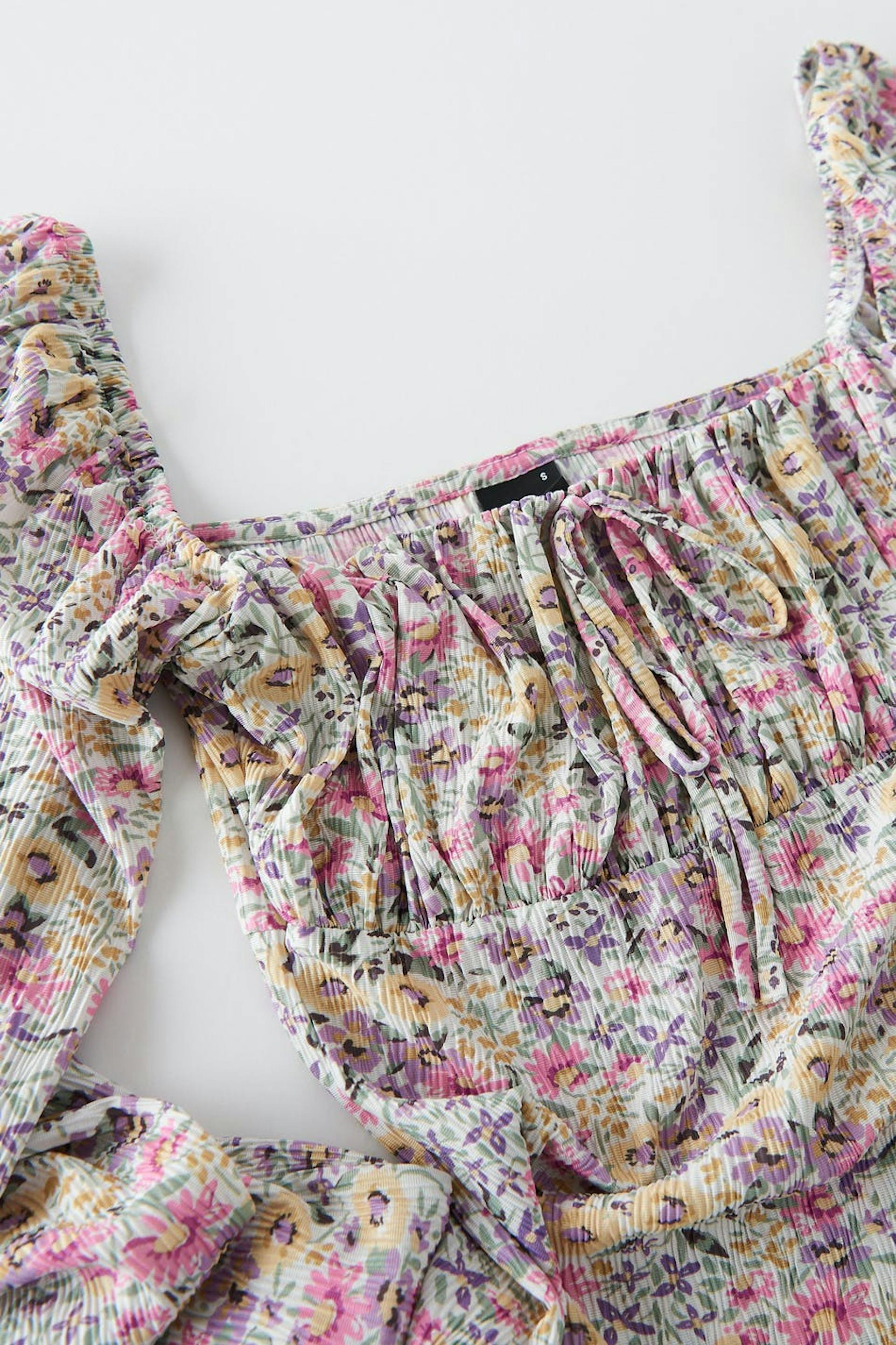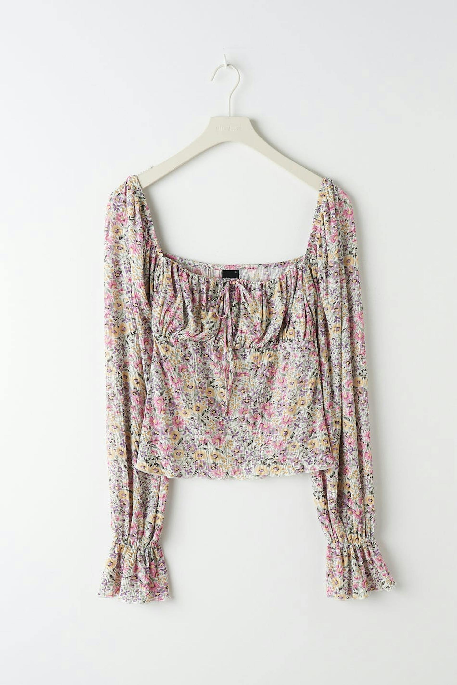 Blumiges Oberteil aus Jersey mit Puffärmeln. Das Oberteil hat quadratischen Ausschnitt mit einem Knoten-Detail vorne und Raffungen auf der Brust.