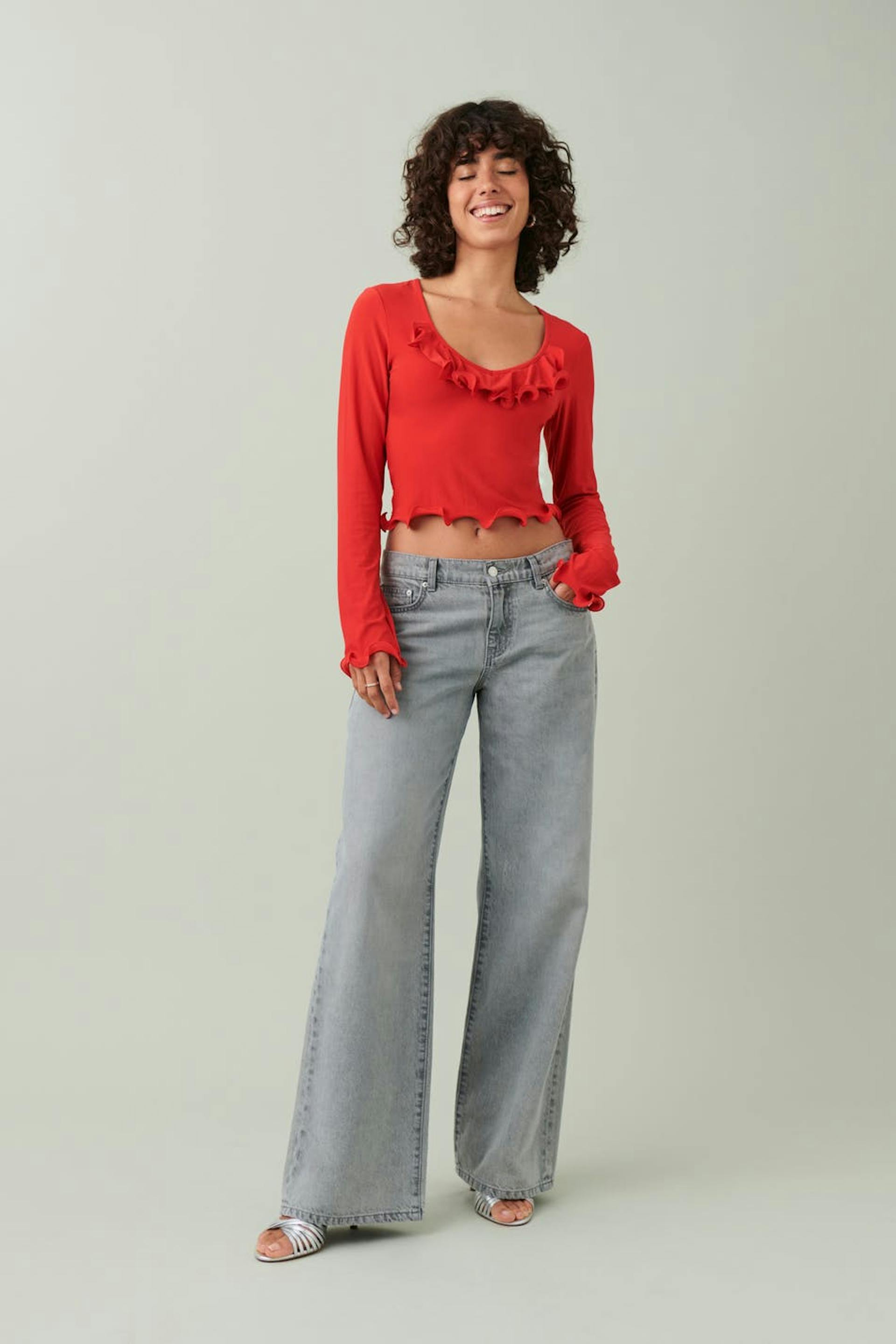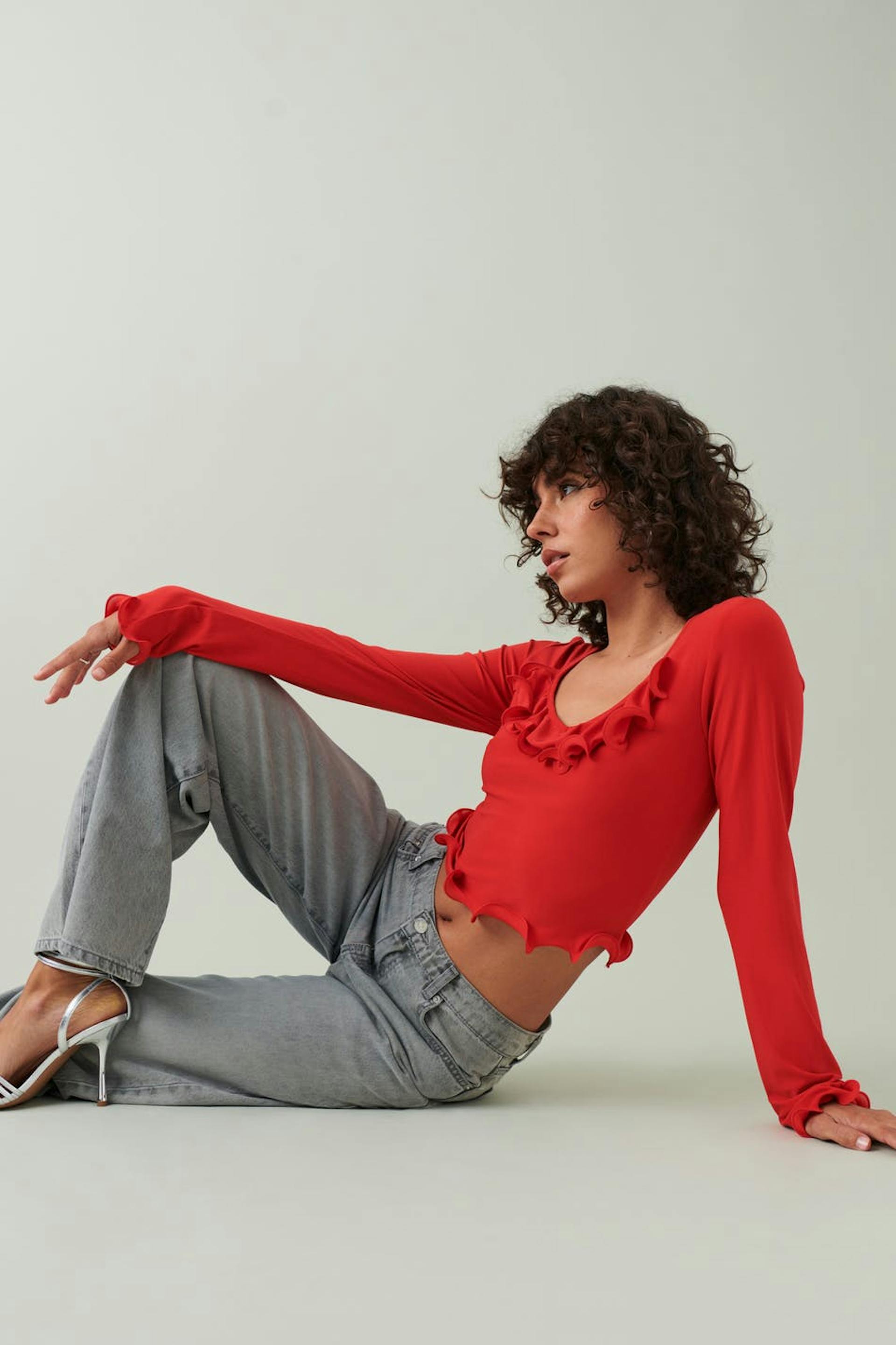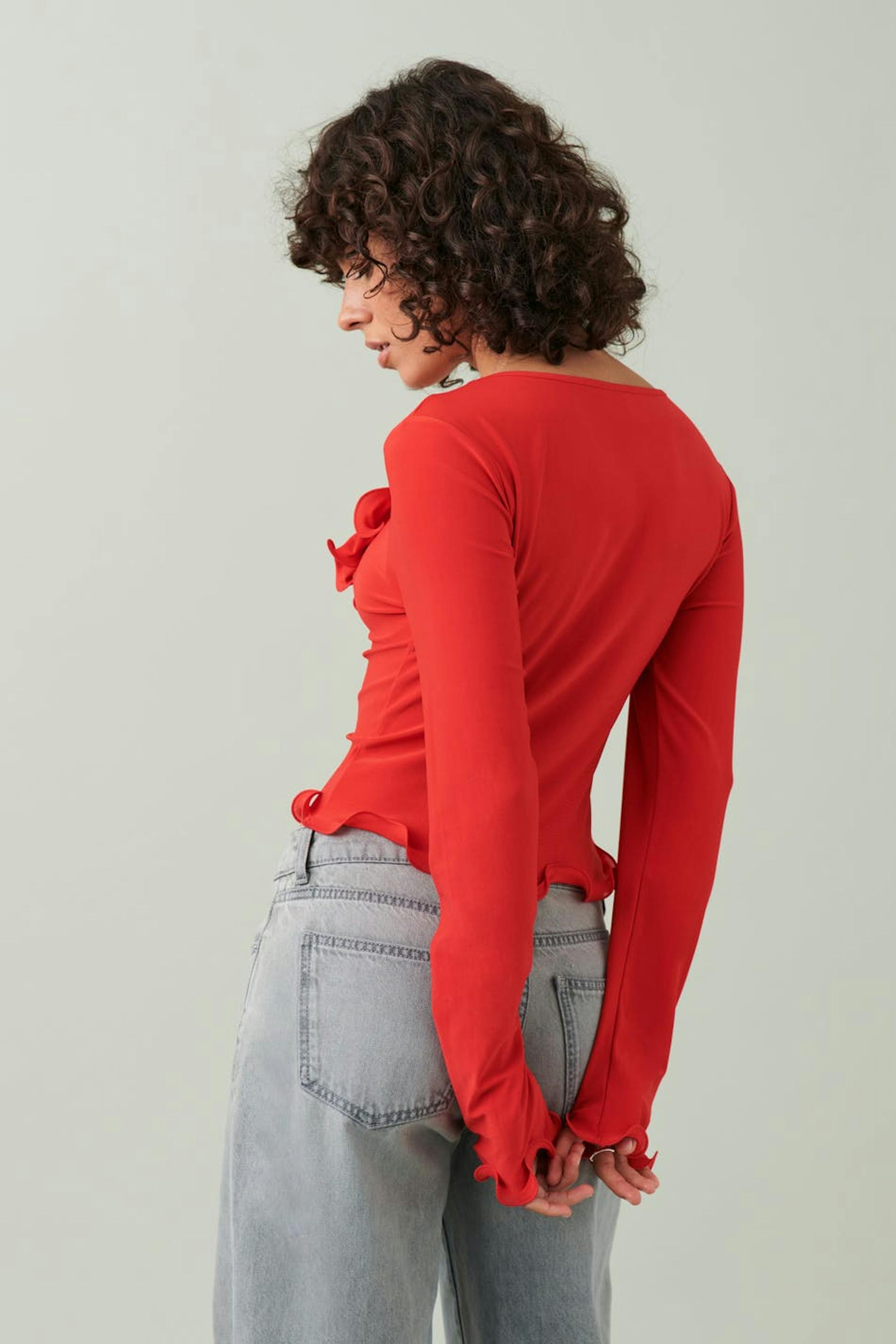 Langärmliges Oberteil aus Jersey mit Rüschenröcken vorne. Das Oberteil ist rot und hat figurbetonte Passform. Es hat elastische Qualität und abgeschnittene Länge.