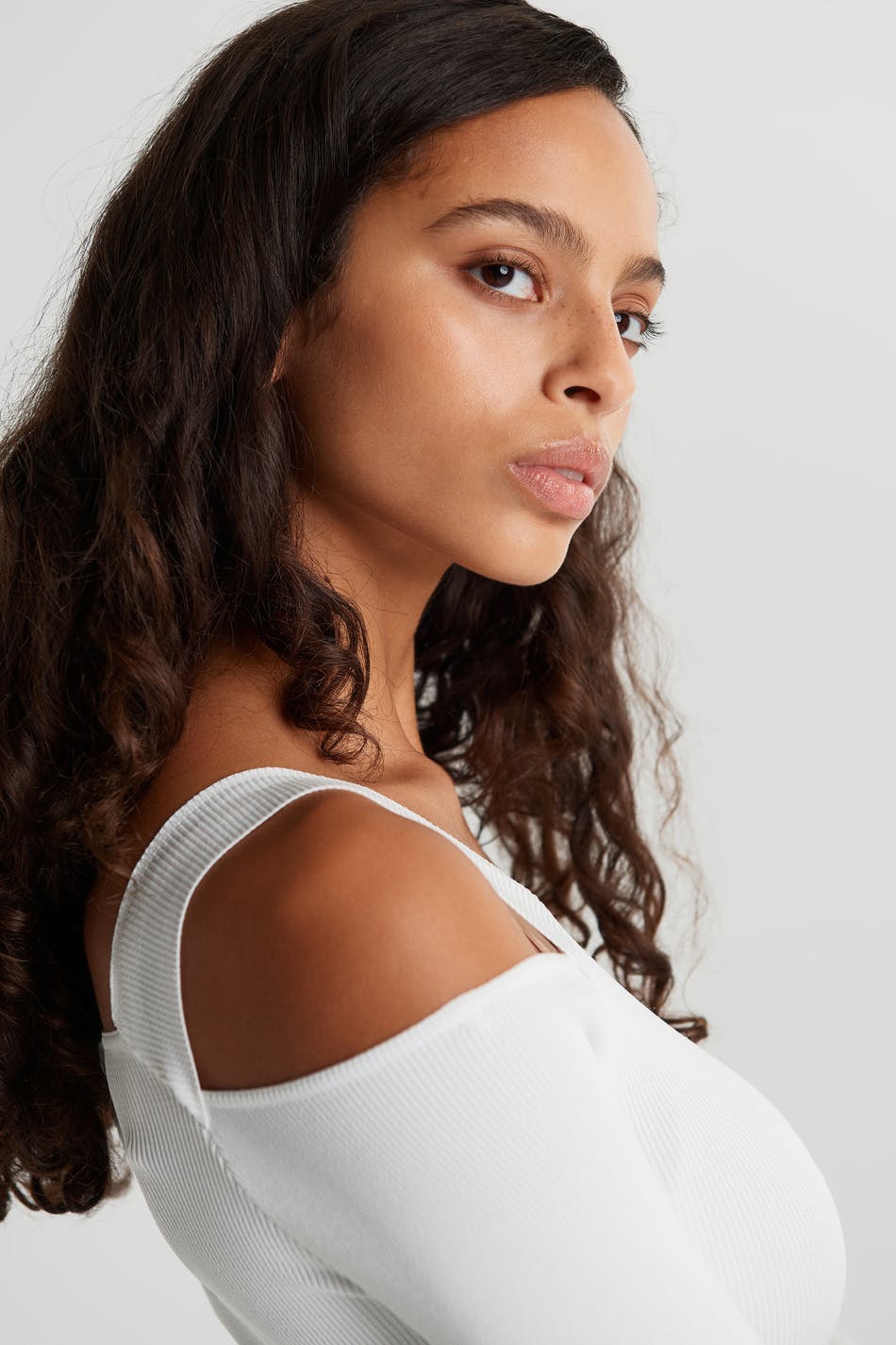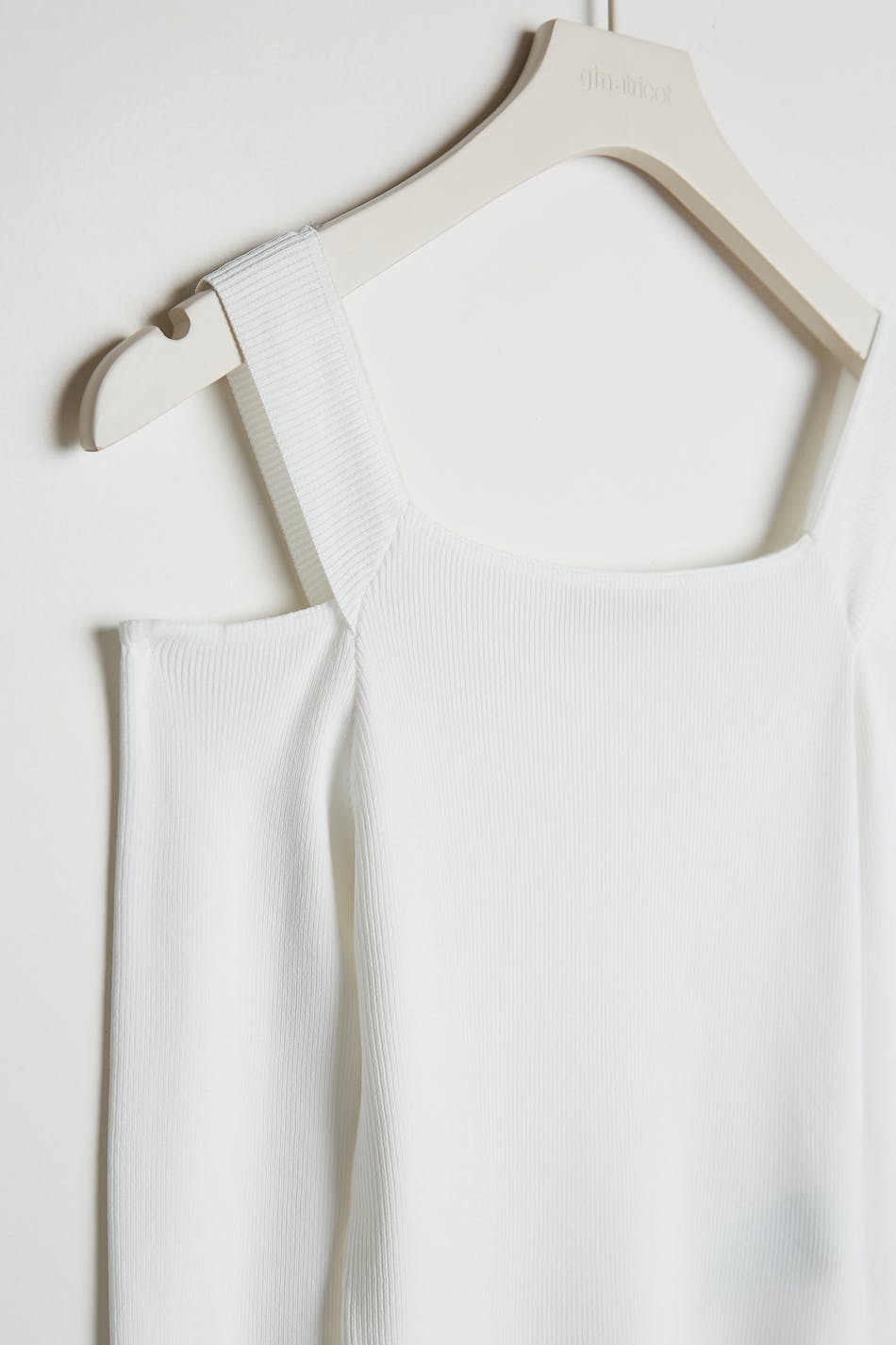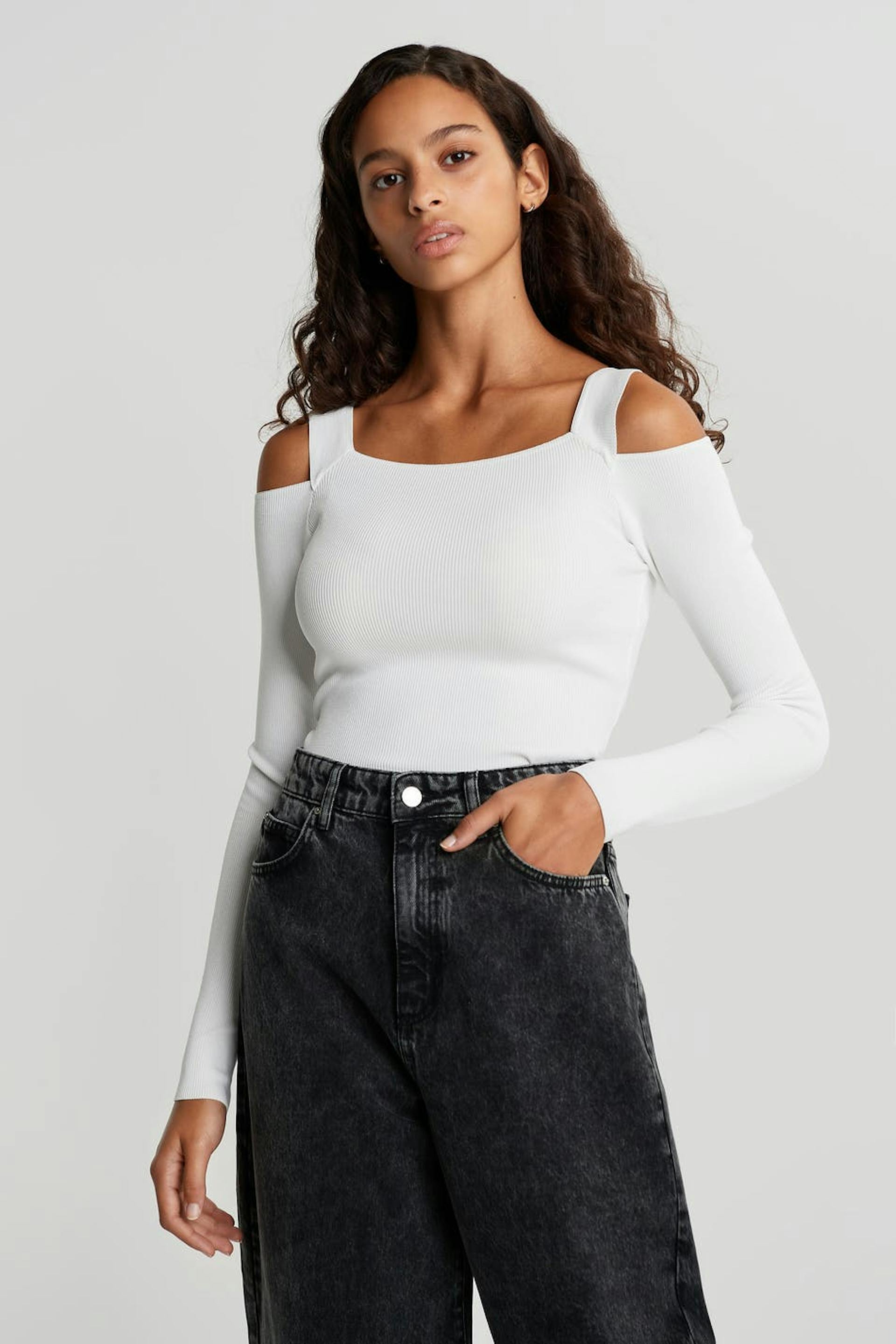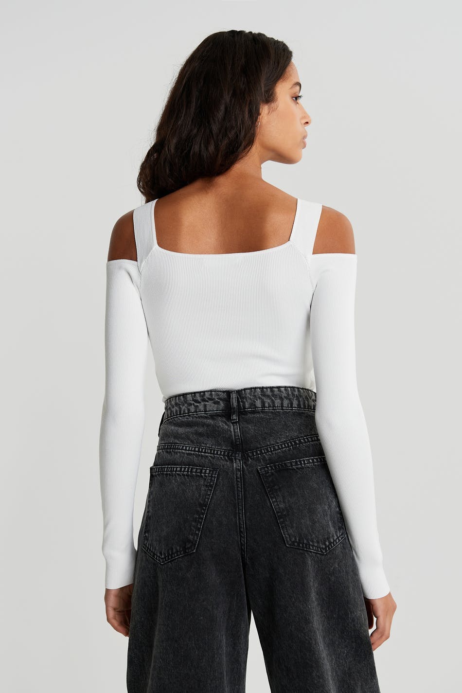 Top mit einem Rippenstrick und einem ausgeschnitten Detail an den Schultern. Das Top ist weiβ und langärmlig.