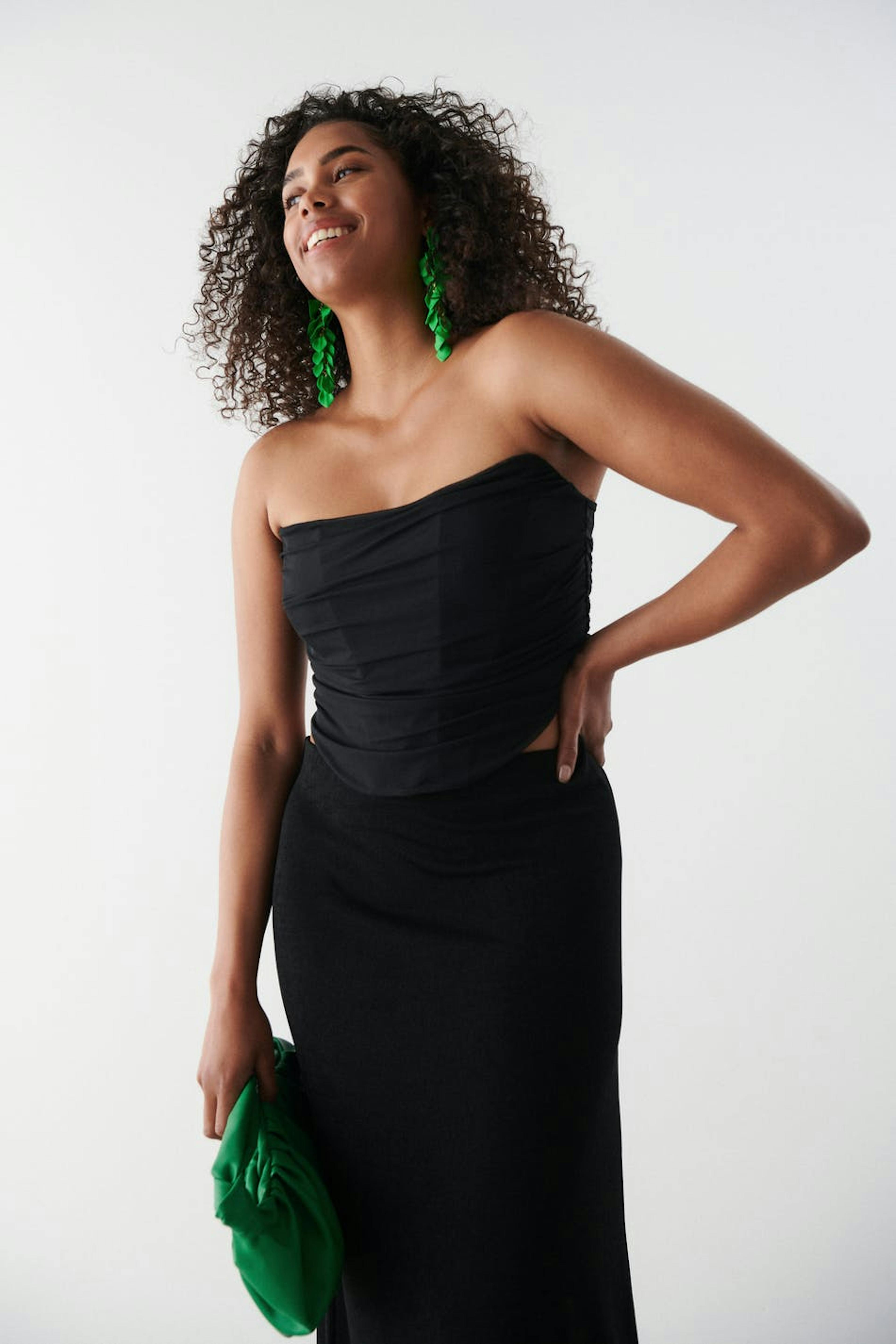 Korsett mit Schnürung am Rücken. Das Korsett ist perfekt für eine Party und schwarz und hat eine gesammelte Wirkung vorne. Es hat Stäbchen vorne und hinten für zusätzlichen Support.