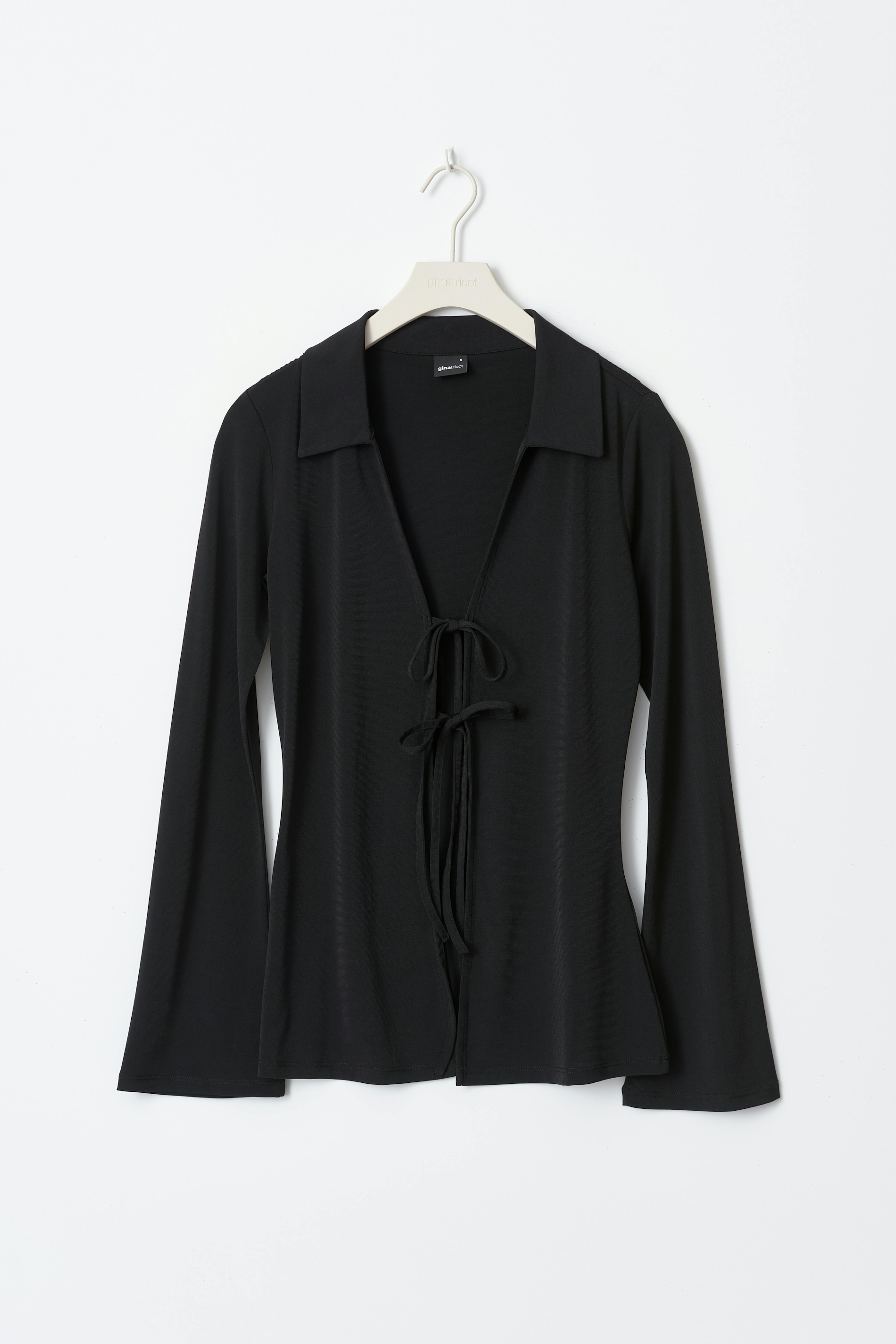 Oberteil mit einer normalen Passform. Das Oberteil ist schwarz und hat V-Ausschnitt. Es hat Knotenverschlüsse vorne und eine normale Passform.