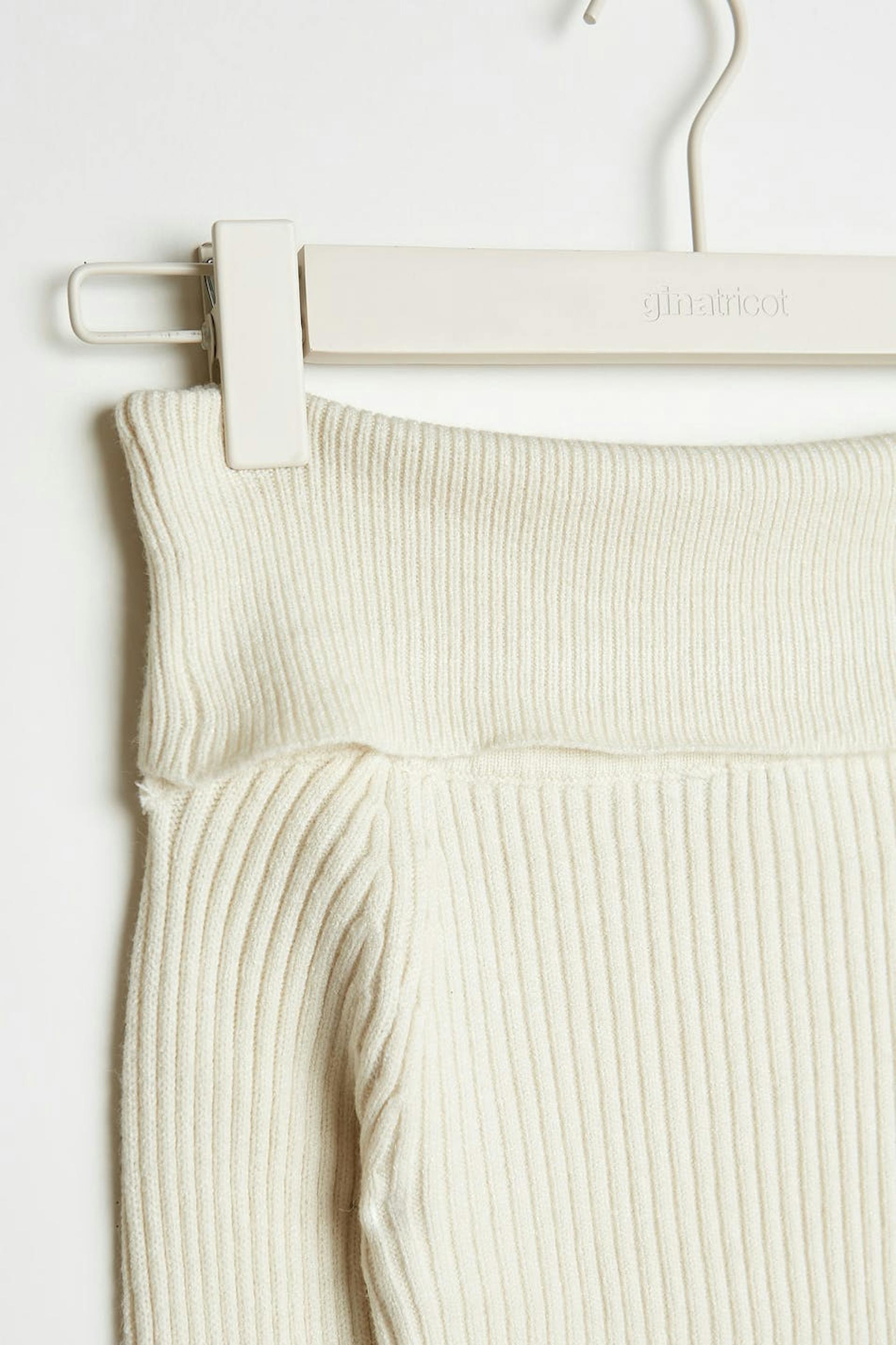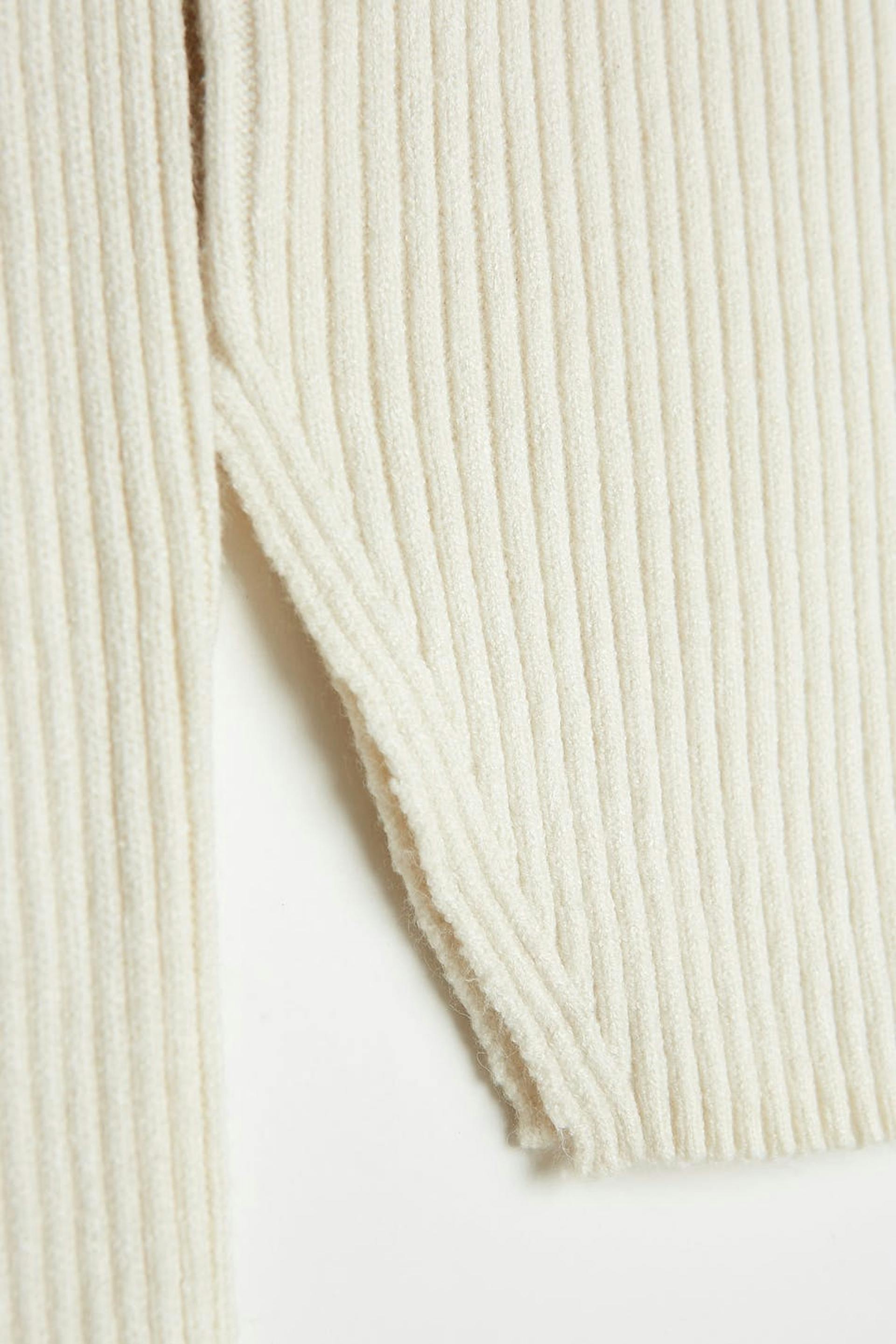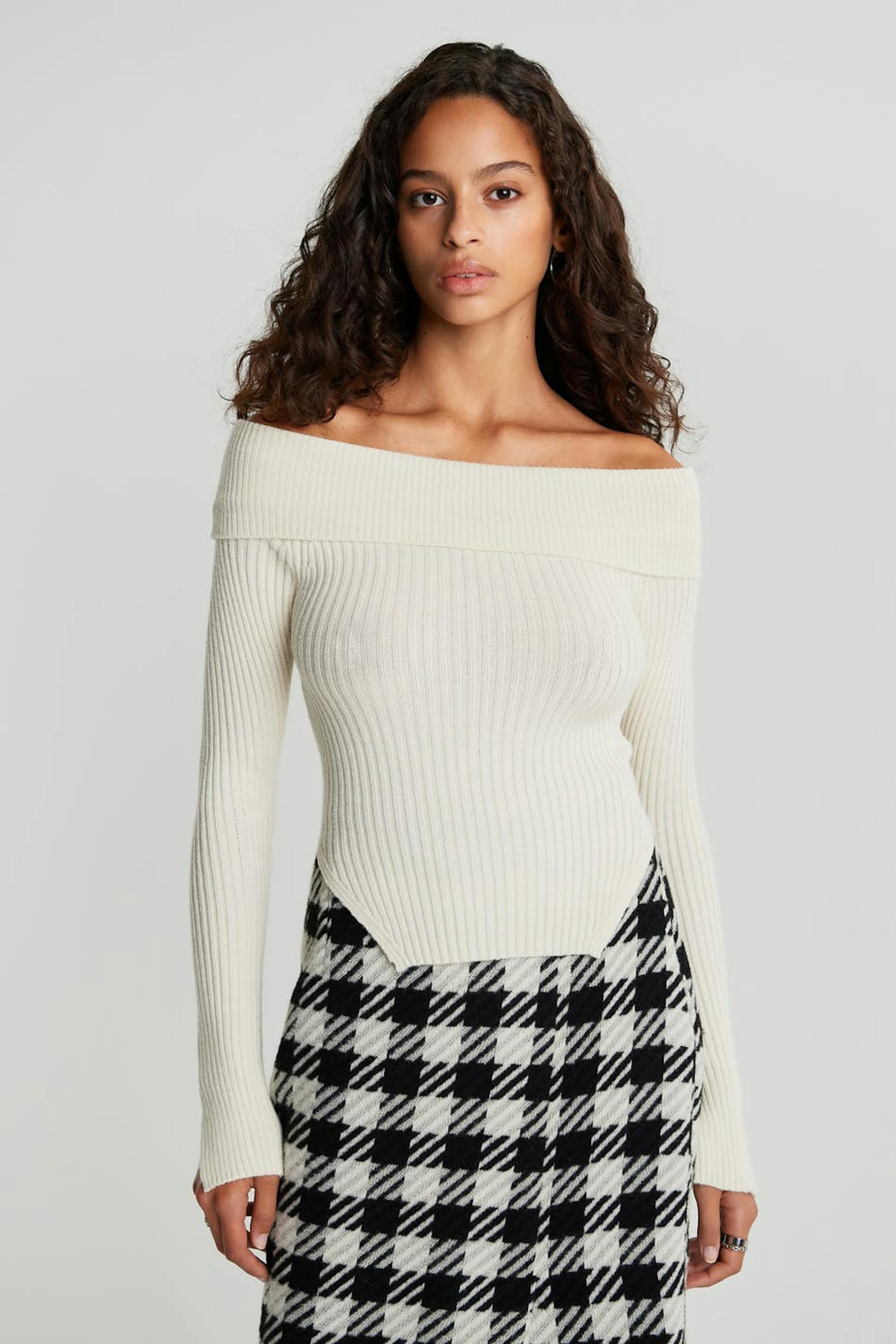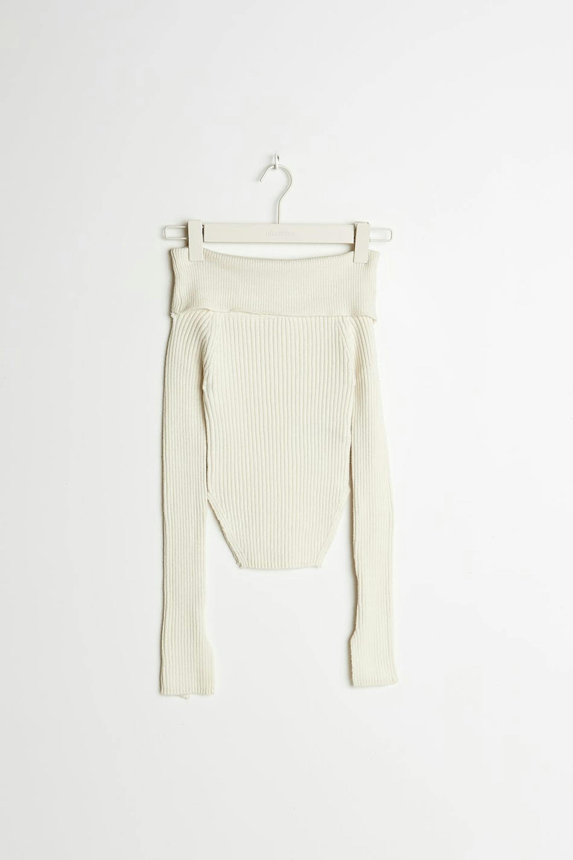 Schulterfreier Pullover mit einem gefalteten oberem Rand. Der Pullover ist beige und gestrickt und hat lange Ärmel. Er hat Spaltungen an den Ärmelenden und auf den Seiten.
