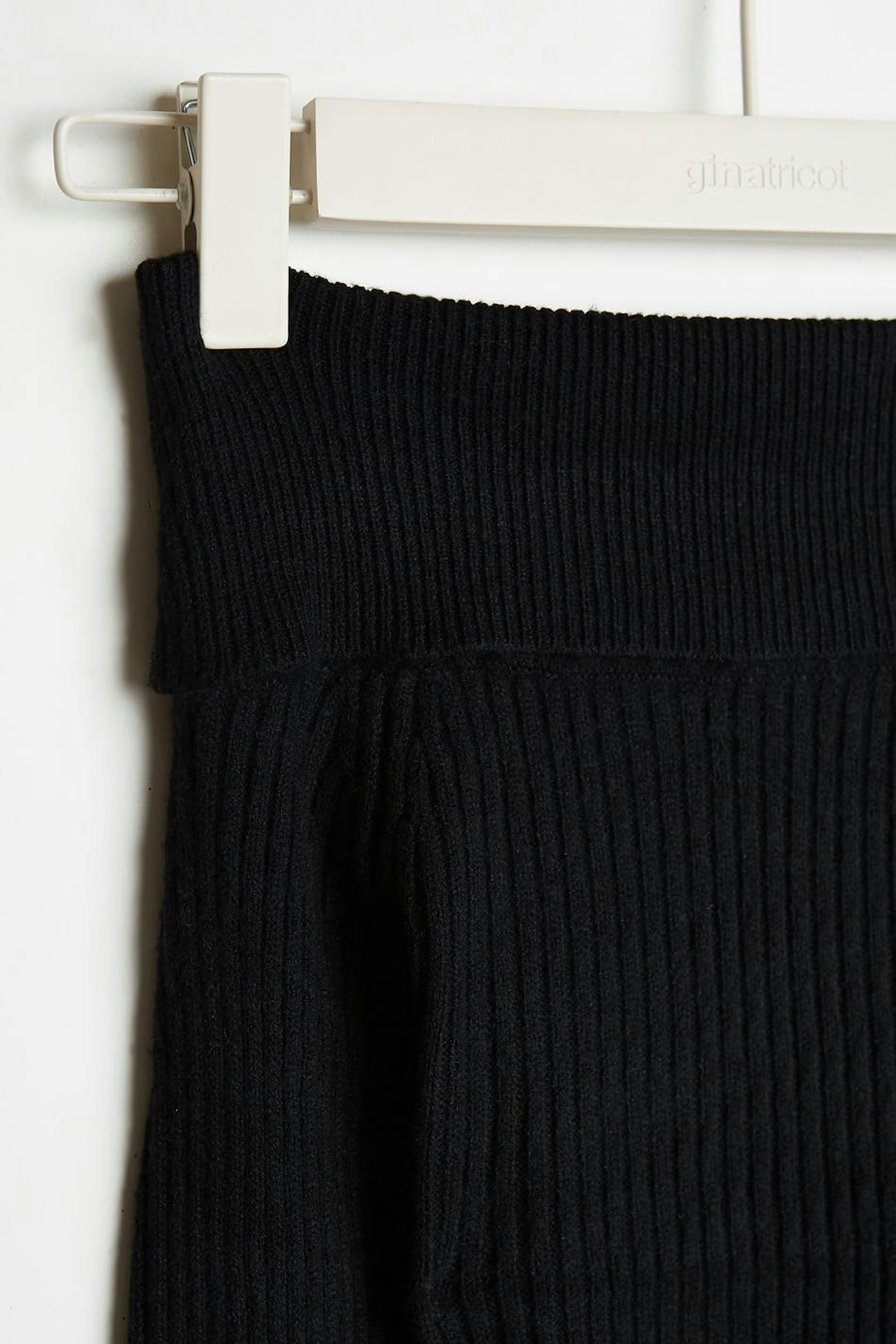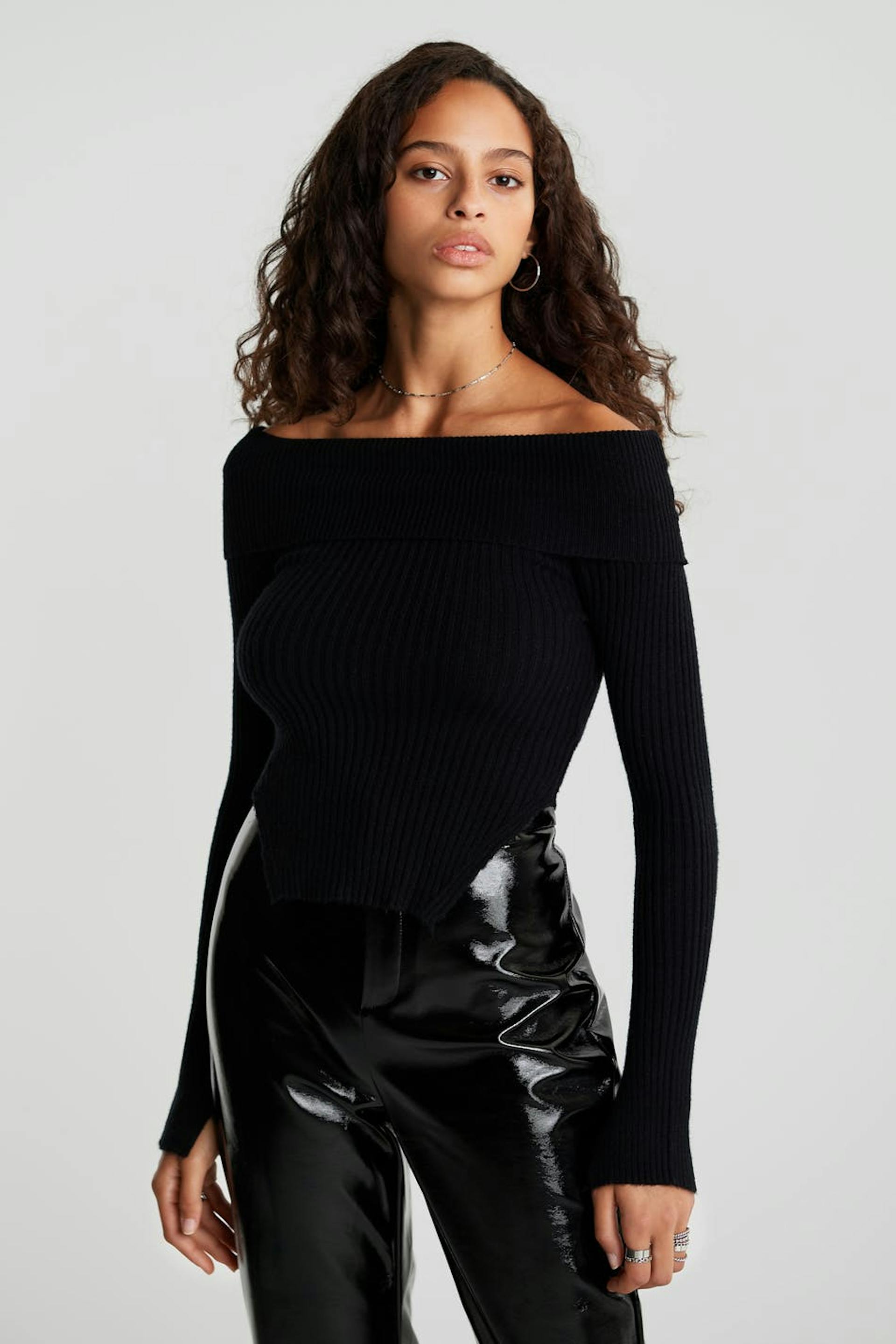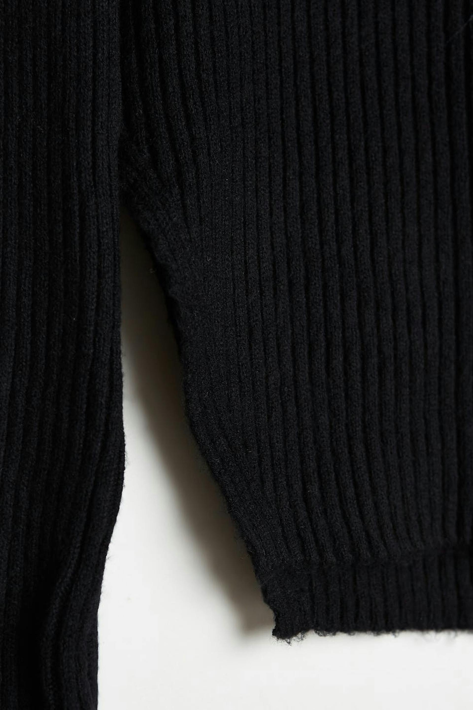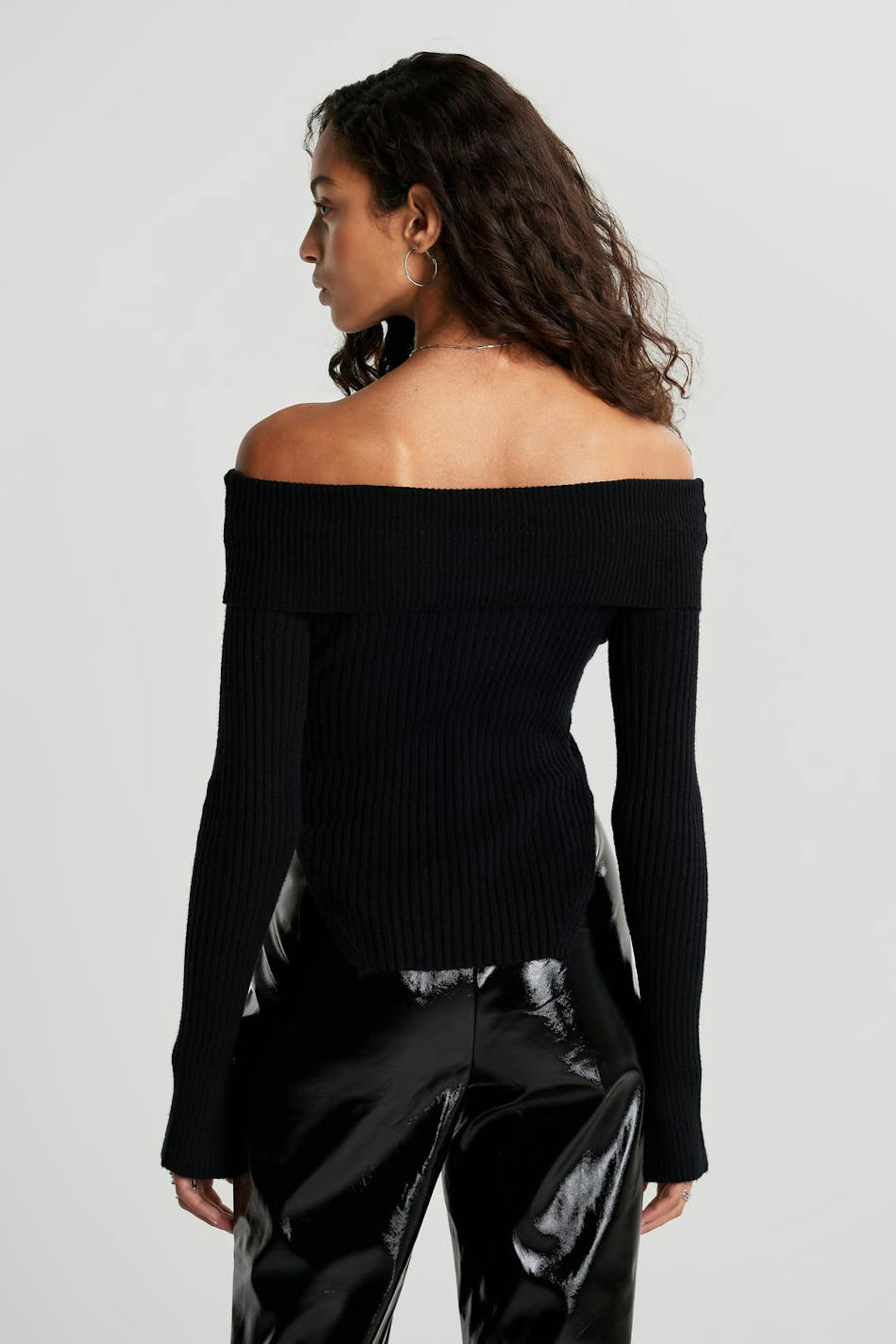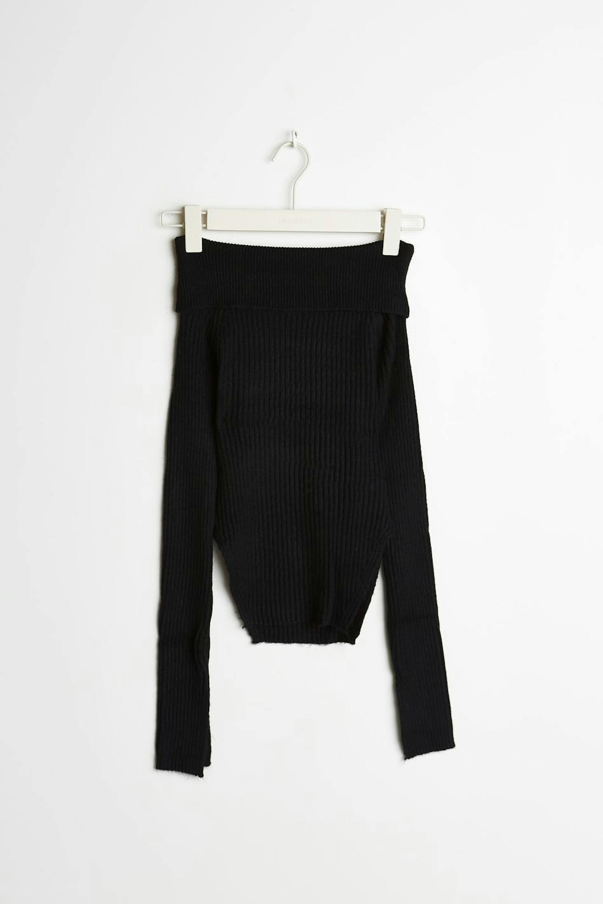 Schulterfreier Pullover mit einem gefalteten oberem Rand. Der Pullover ist schwarz und gestrickt und hat lange Ärmel. Er hat Spaltungen an den Ärmelenden und auf den Seiten.