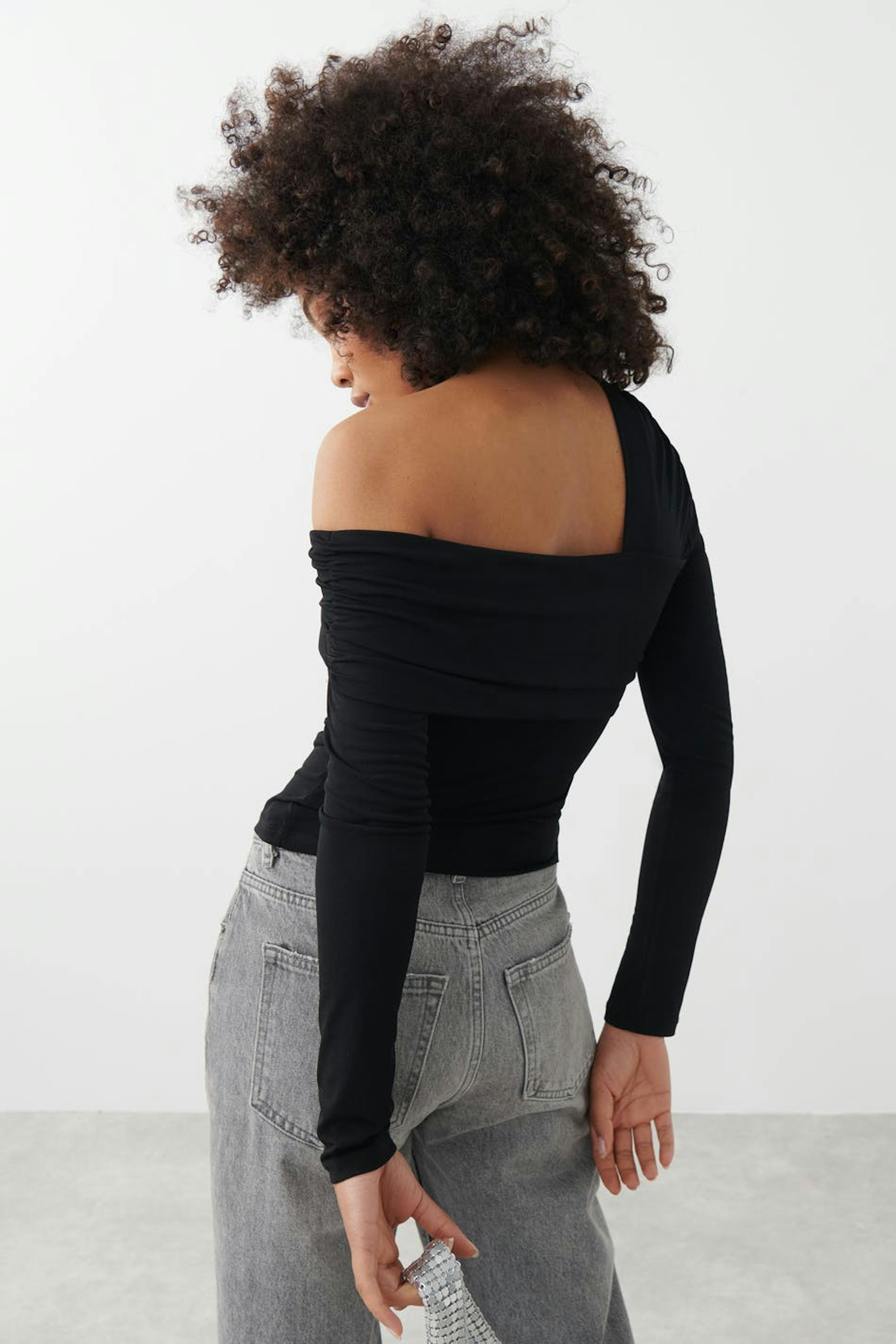 Figurbetontes One-Shoulder-Top mit langen Ärmeln. Das Oberteil ist schwarz und hat Falten entlang der Schulter. Es hat eine asymmetrische Passform.