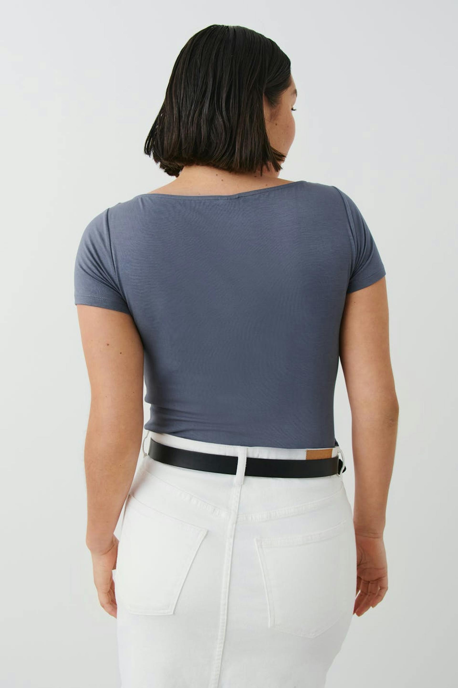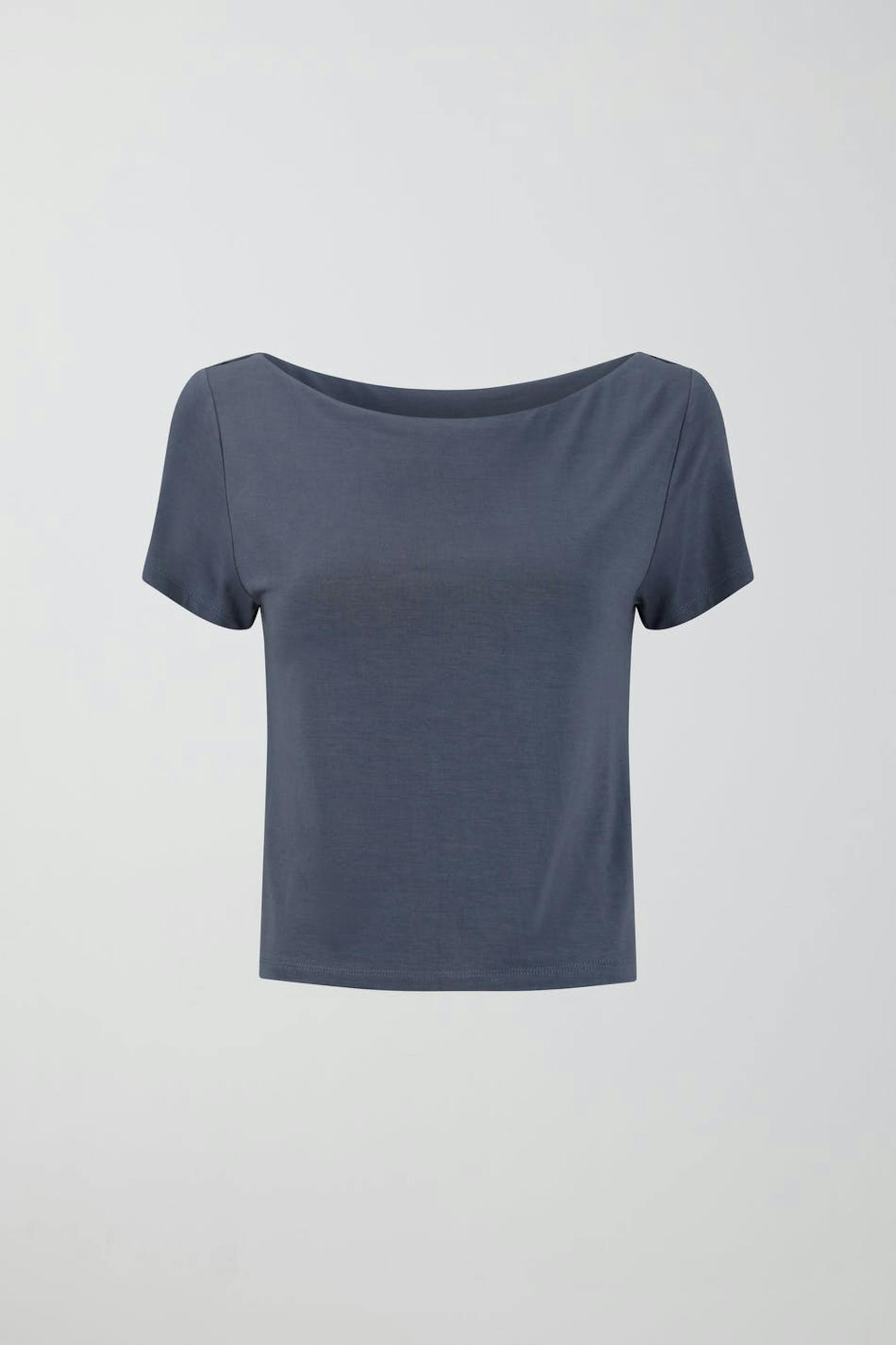 Soft touch – second skin comfort. Kurzärmliges Oberteil aus weicher Viskose mit U-Boot-Ausschnitt. Das Oberteil ist grau und hat abgeschnittene Länge.