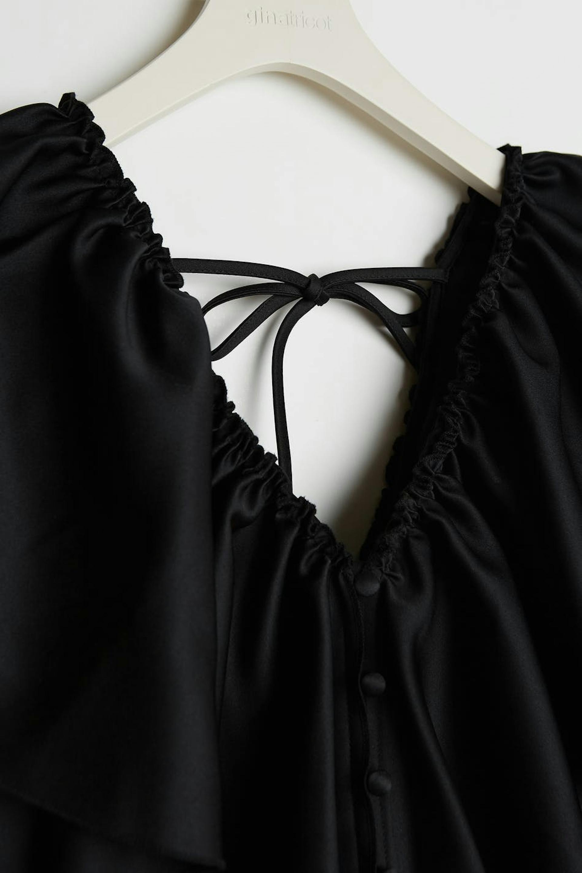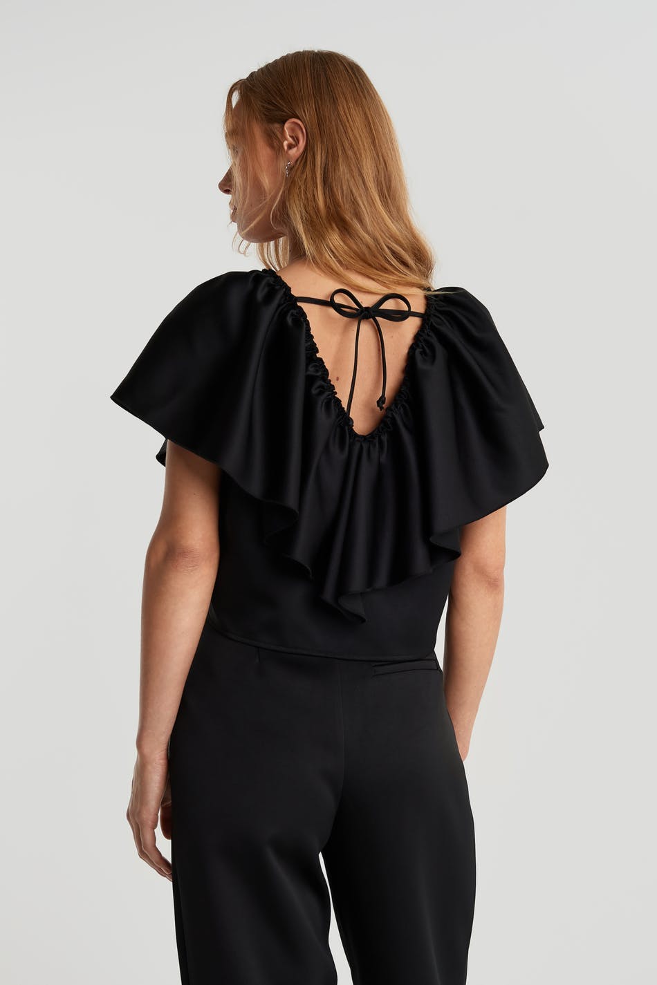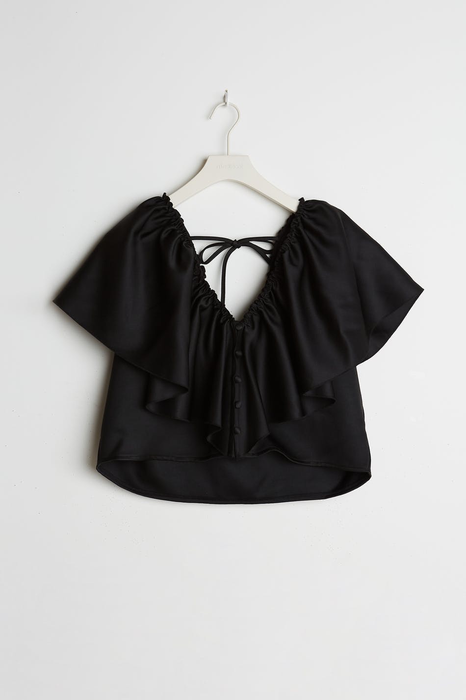 Kurzärmliges Top mit einem Rüschenrock auf der Oberseite. Das Top ist schwarz und hat Knöpfe vorne. Es ist hergestellt aus Satin und hat eine Schnürung am Rücken und einen V-Ausschnitt.