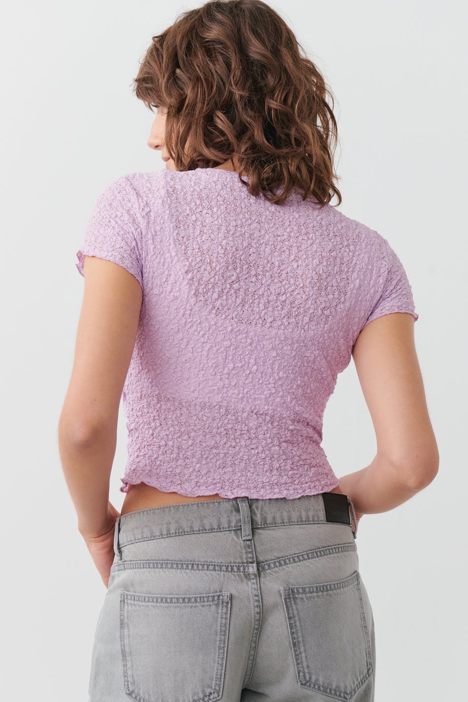 Kurzärmliges Spitzenbustier mit Kappenärmel. Das Oberteil ist lila und hat normale Passform. Es hat hochgeschlossenen Ausschnitt, strukturierte Qualität, abgeschnittene Länge und gekettelte Naht.