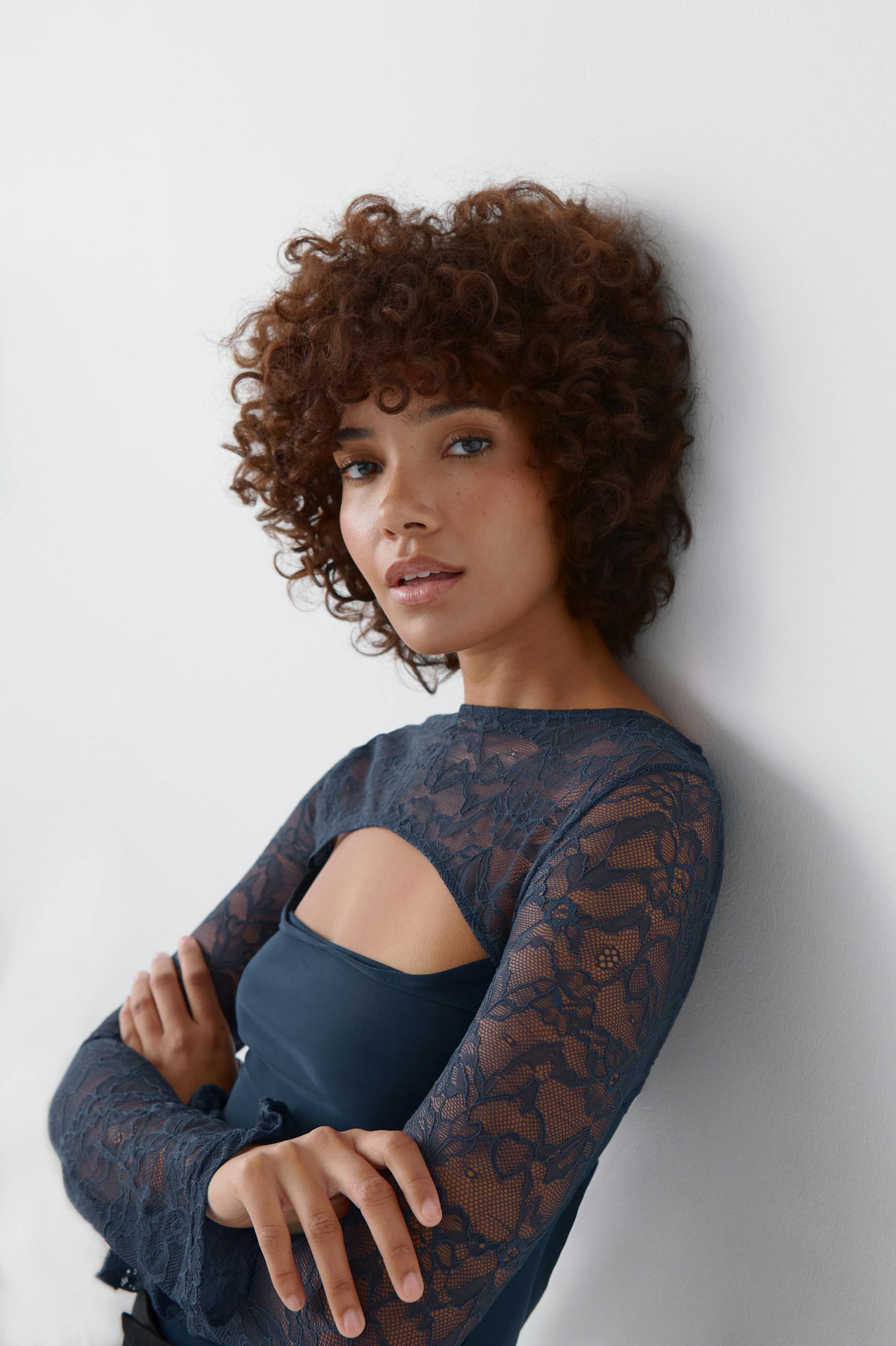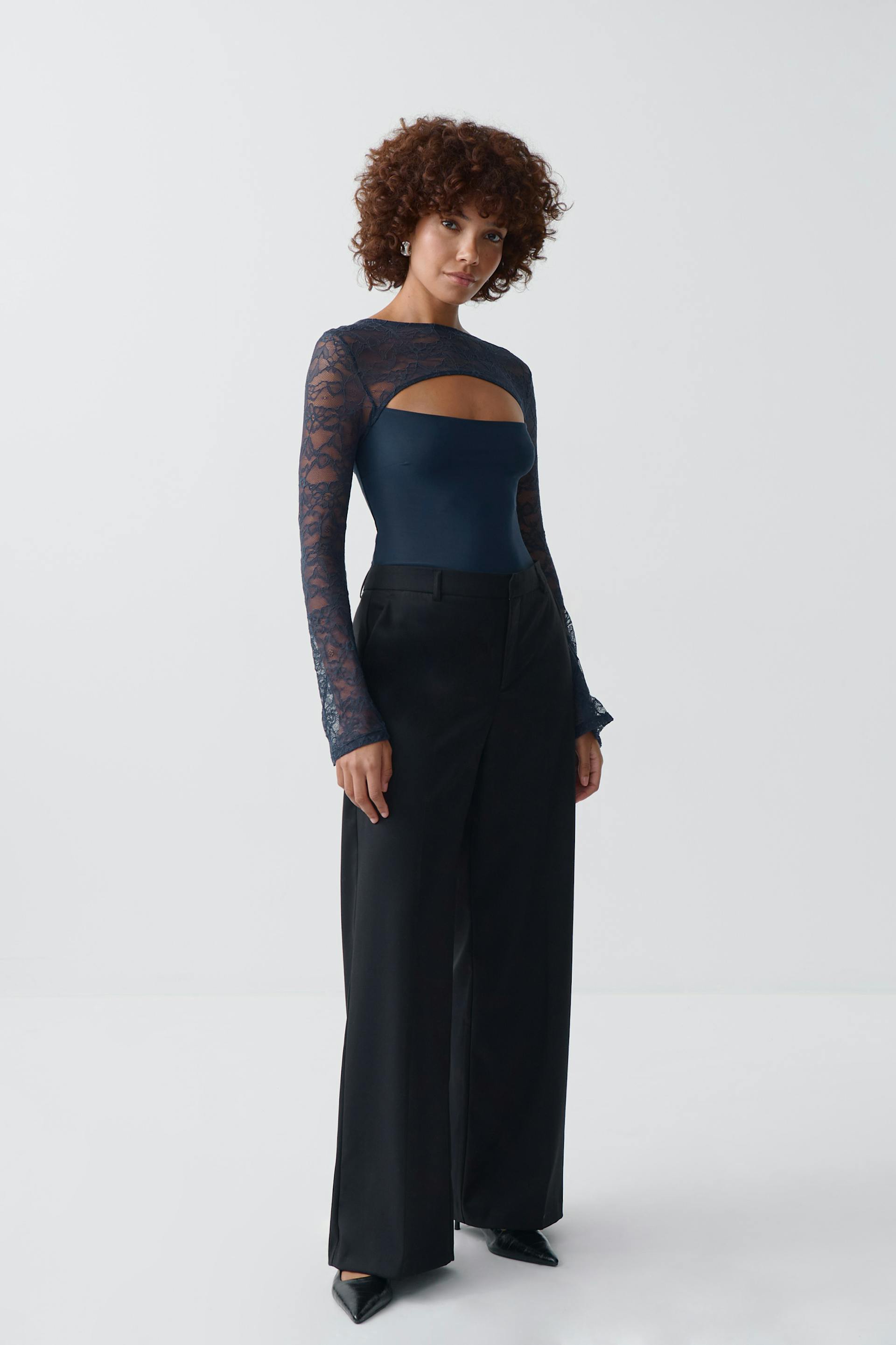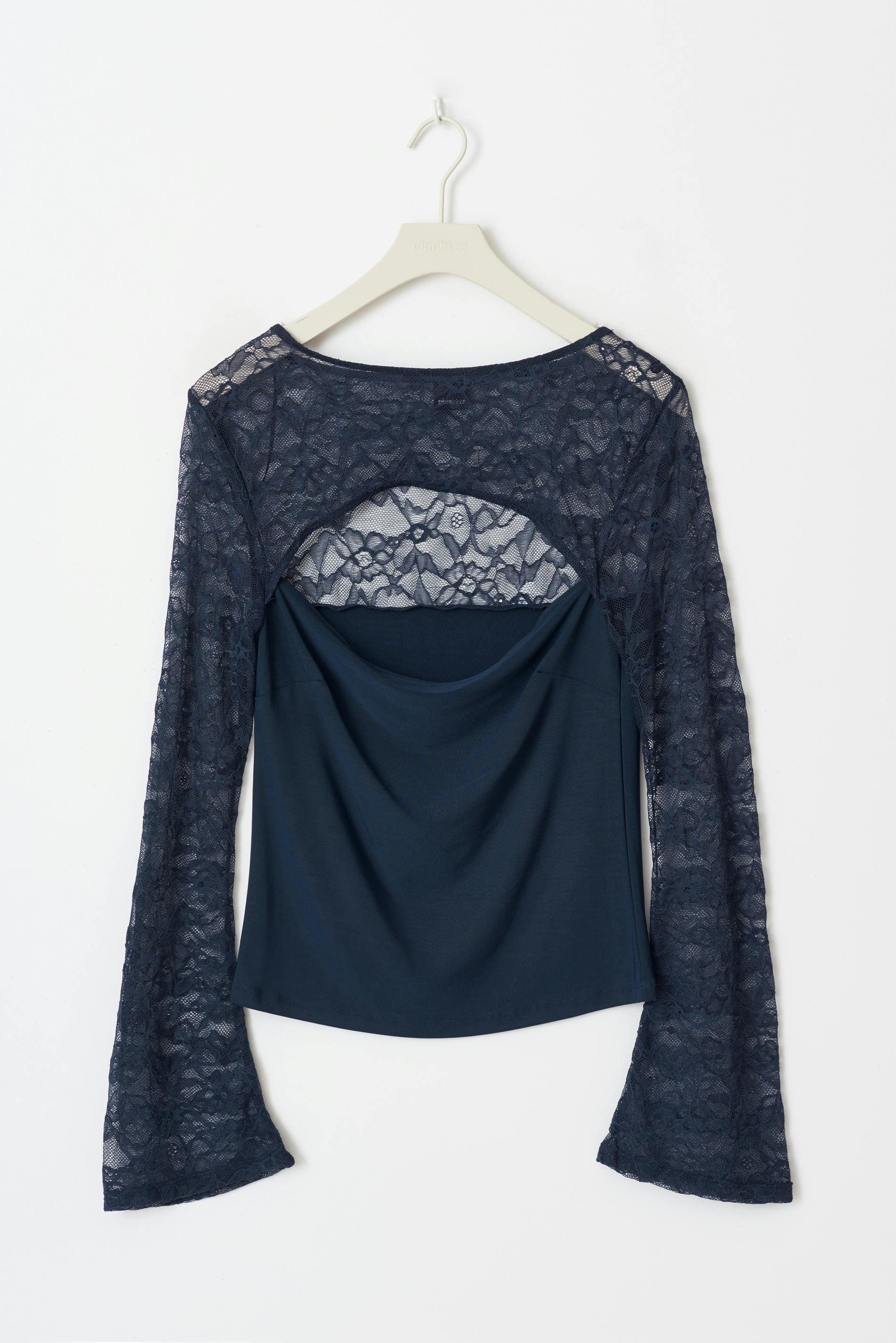 Langärmliges Spitzenbustier mit ausgeschnittenem Detail vorne. Das Oberteil ist marineblau und hat U-Boot-Ausschnitt. Es hat figurbetonte Passform und normale Länge.