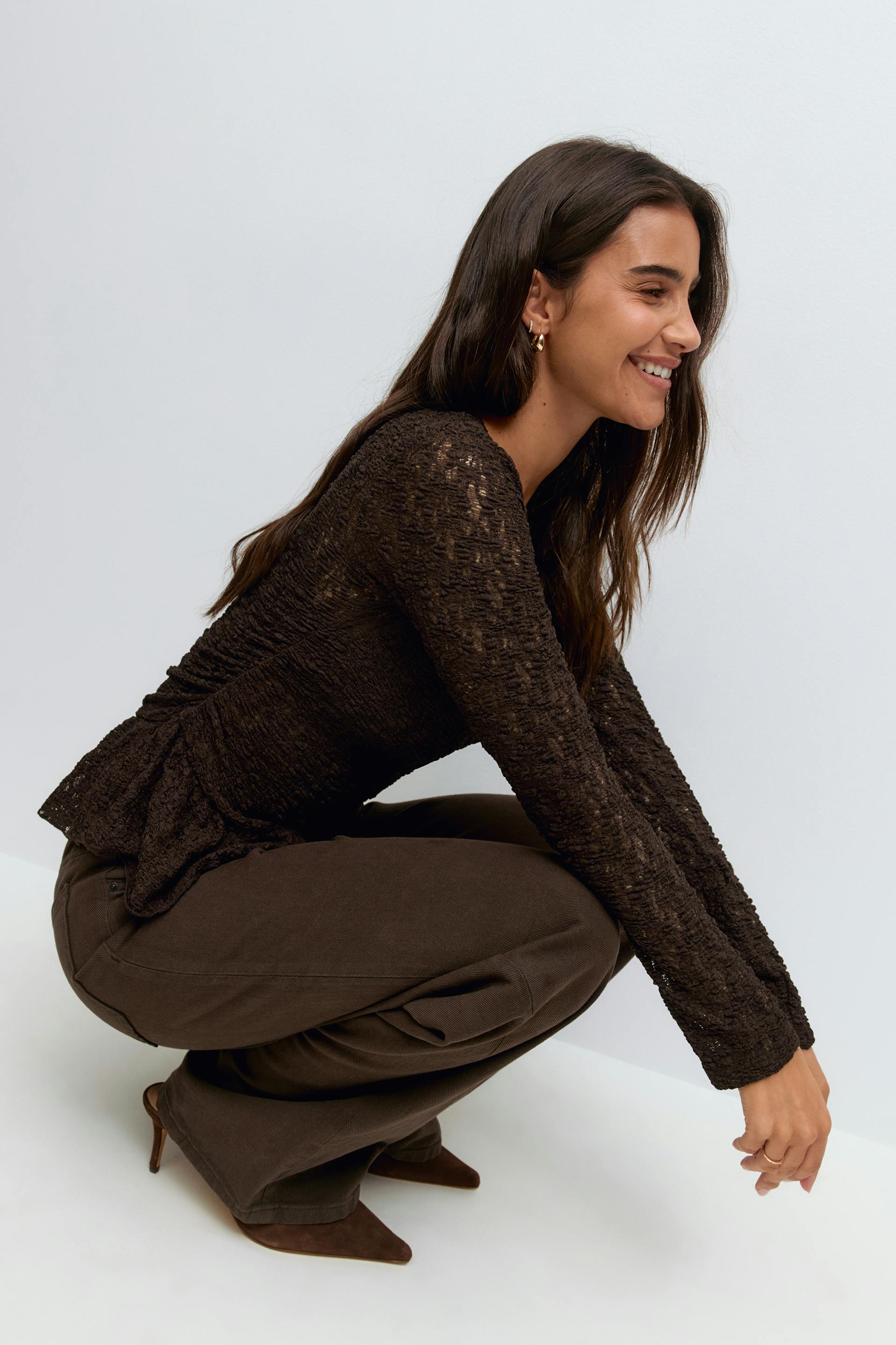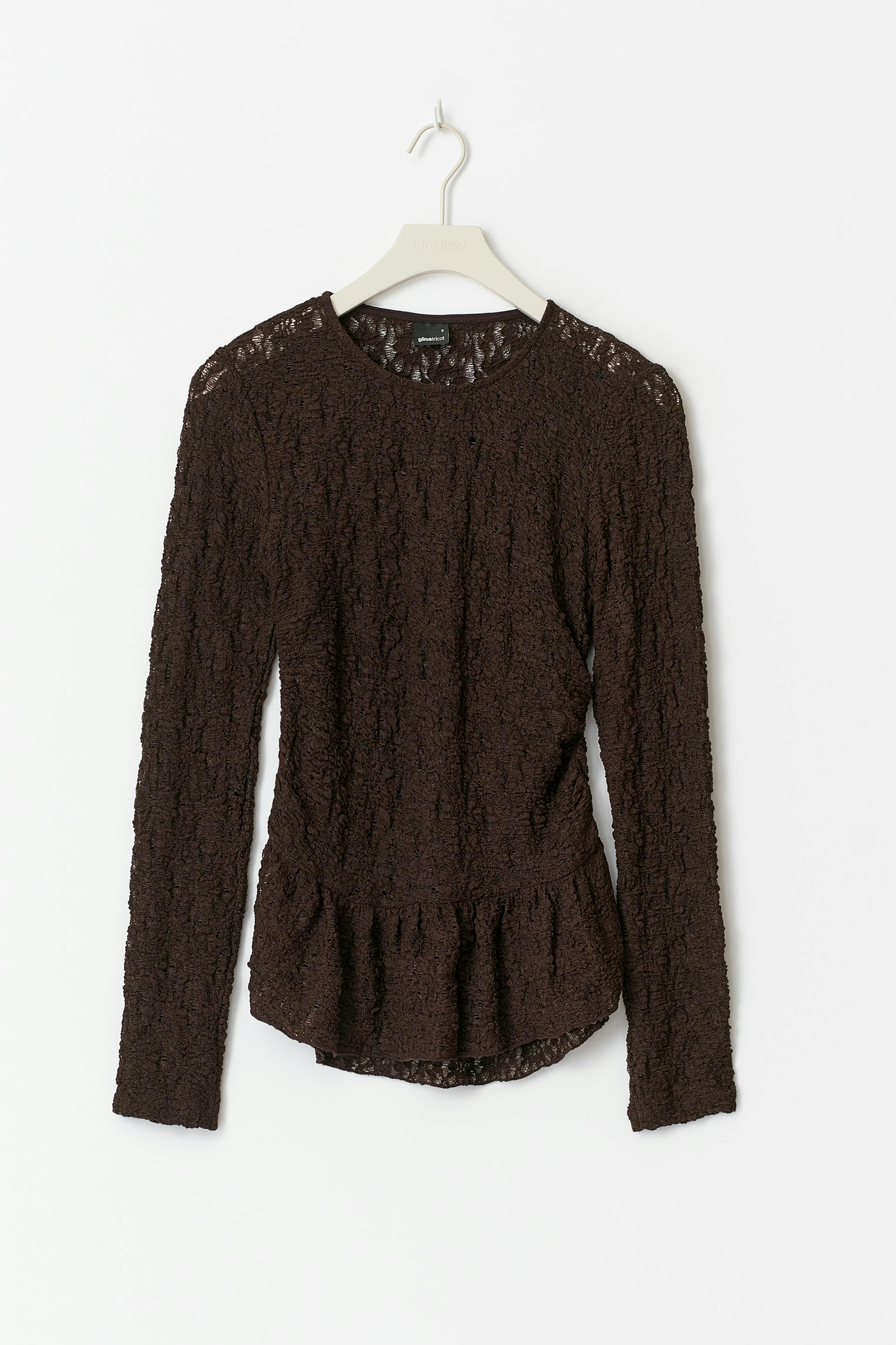 Spitzenbustier mit Volant an der Unterkante. Das Oberteil ist braun und hat Schößchen-Design. Es hat Rundhalsausschnitt, Rüschen in den Seiten, langen Ärmel und normale Passform. Ungefüttert.