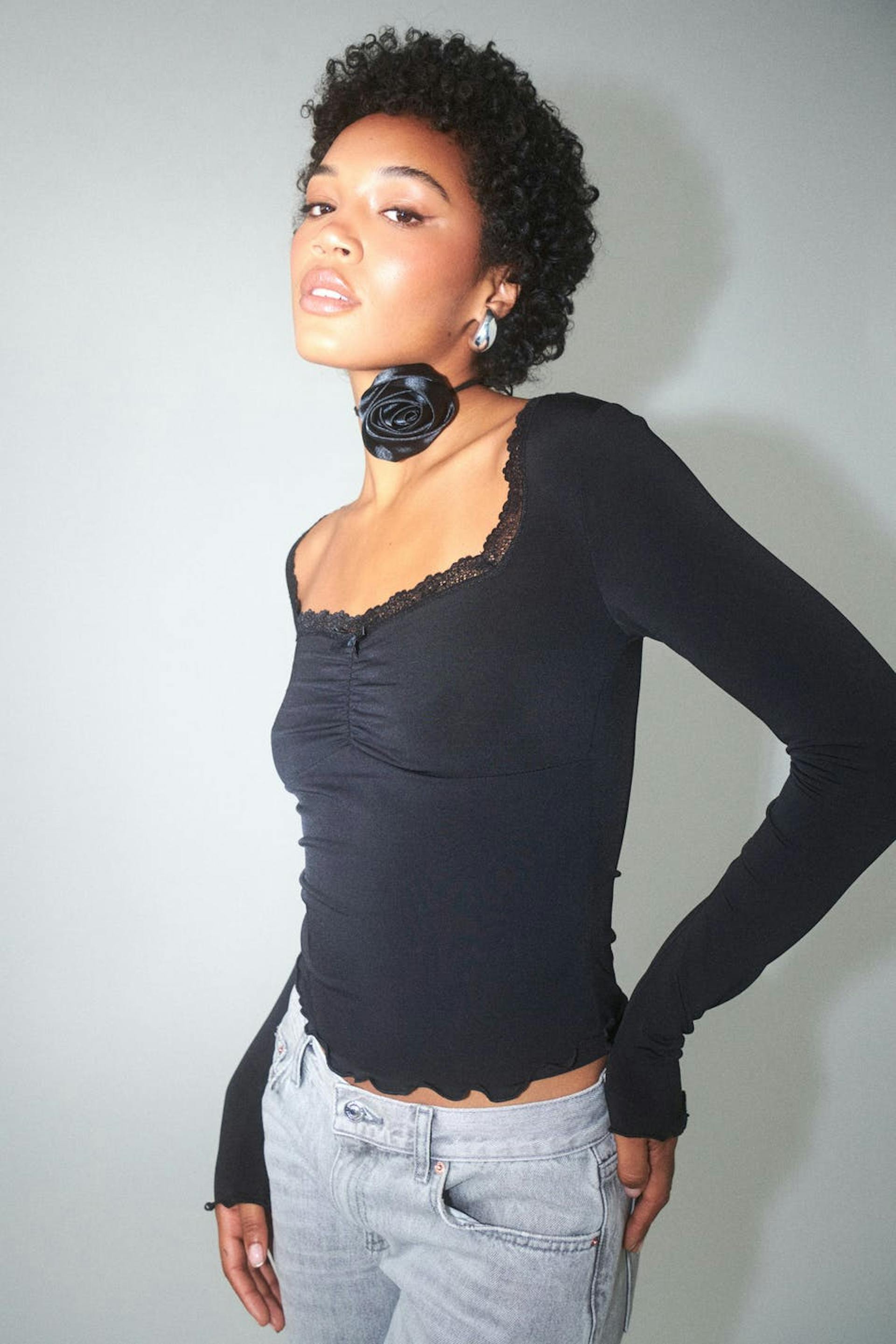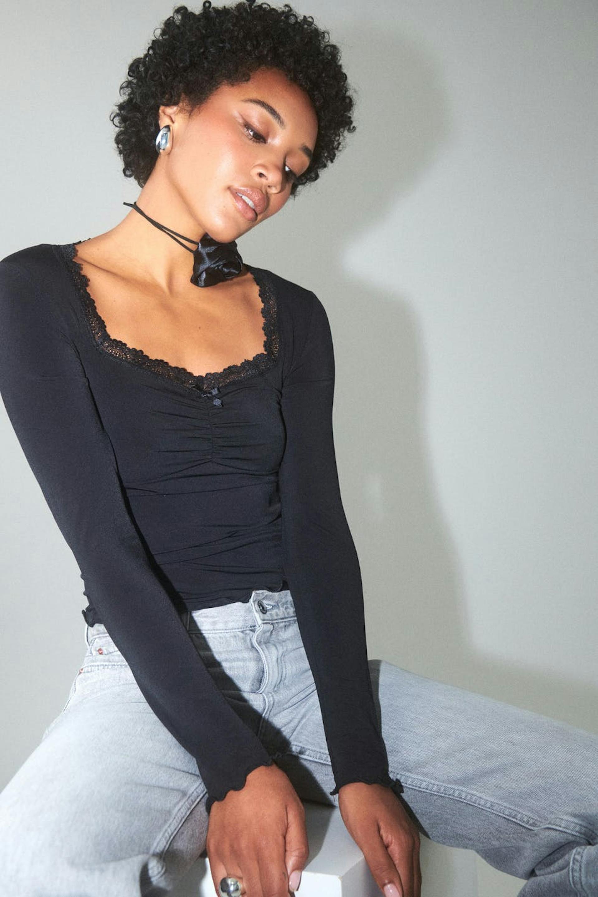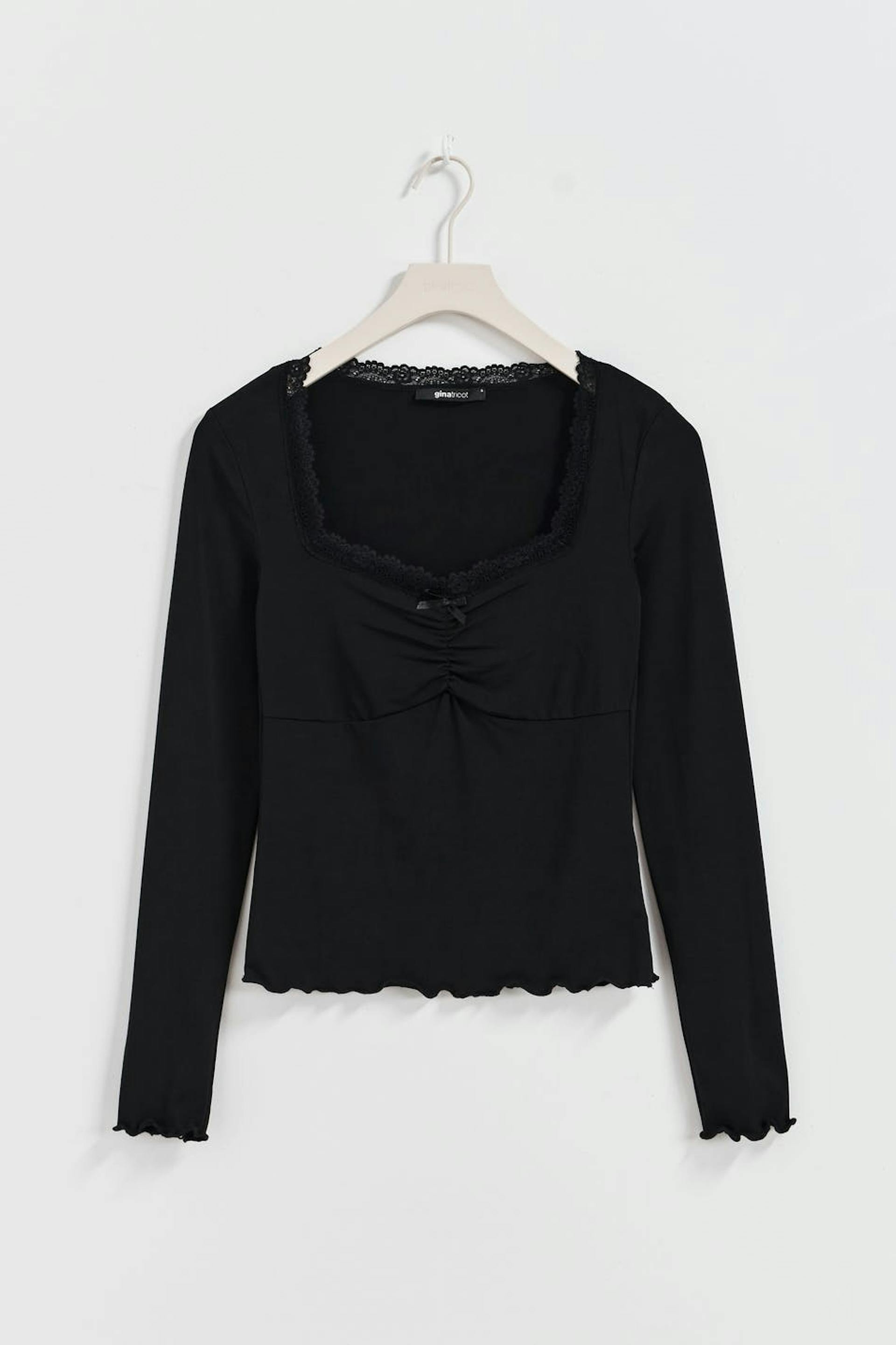 Oberteil aus Jersey mit gerüscht Detail auf der Brust. Das Oberteil ist schwarz und hat quadratischen Ausschnitt mit Spitze und Bogen.