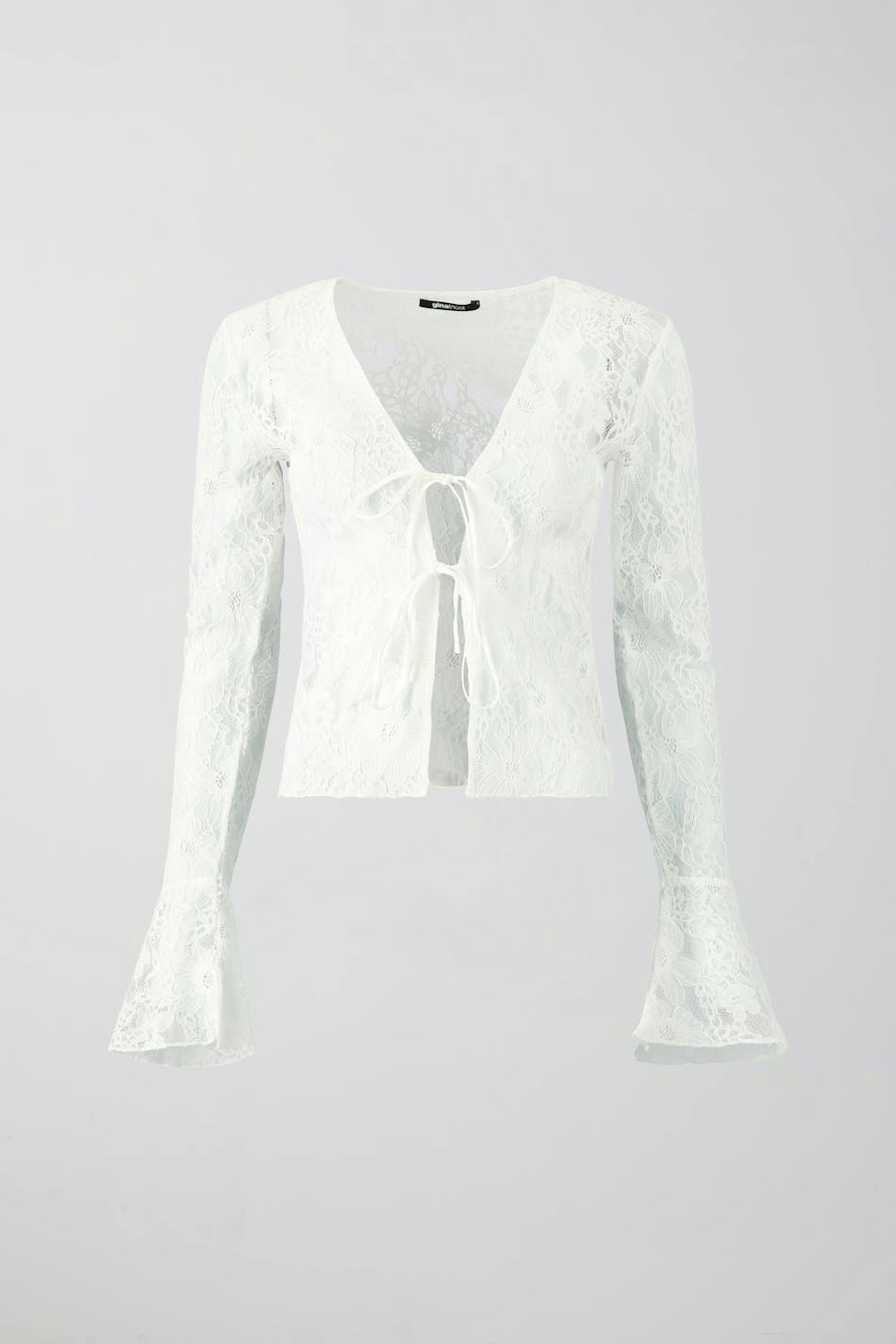 Oberteil aus Spitze mit Kordeln vorne. Das Oberteil ist weiβ und hat ausgestellte Ärmelende.